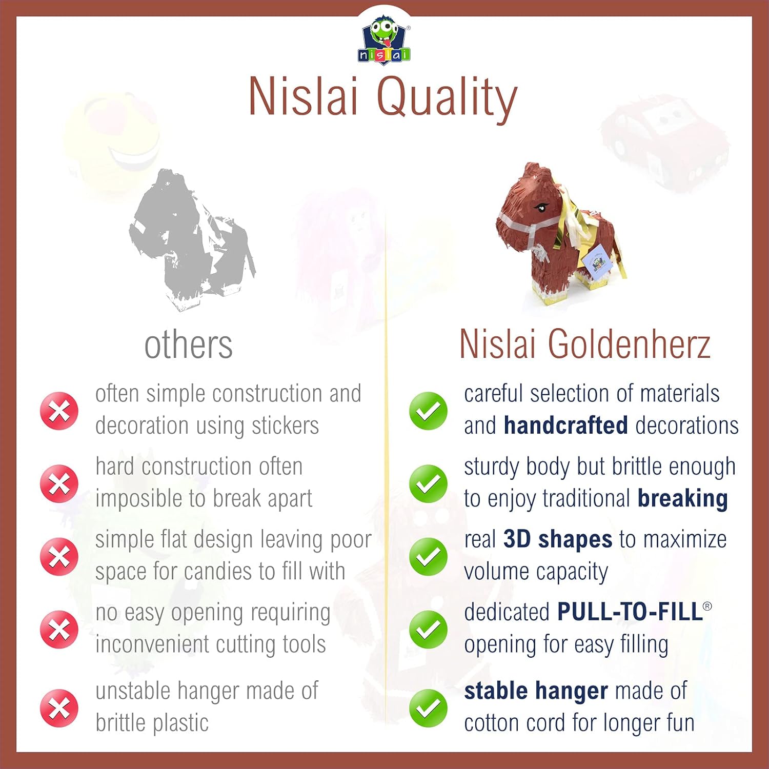 🐎 ATTENZIONE! Grazie al suo design elegante, la nostra dolce pinata di cavallo “Coer de or” riempirà il tuo prossimo evento di fascino e allegria. 🐎 FACILI DA RIEMPIRE: Grazie al nostro sistema pull-and-fill, le piñata Nislai possono essere riempite in pochi secondi. La sua forma tridimensionale ti permetterà di riempirlo con numerose caramelle, piccoli giocattoli o altre sorprese (non incluse nell'offerta) per i tuoi ospiti impazienti. 🐎 ADATTA PER GIOCARE ALLA PIÑATA: uno degli ospiti o l'ospite può colpire brevemente la piñata (circa 3 volte) mentre è bendato. Se le caramelle o i regali (non inclusi) non cadono a terra, lascia che ci provi il prossimo. Ripeti il procedimento finché uno dei tuoi ospiti o il celebrante non riesce finalmente a rompere la piñata. 🐎 DIVERTIMENTO GARANTITO: goditi il modo tradizionale di rompere una piñata, come se fossi in Messico. Le nostre piñata sono realizzate secondo standard artigianali adatti alla produzione moderna. Grazie a questo e all'esauriente controllo di qualità a cui sono sottoposti, garantiamo un prodotto pieno di autenticità. 🐎 FILOSOFIA NISLAI: I nostri prodotti sono pensati per coloro che sanno godersi ogni goccia di felicità. E poiché abbiamo fatto di tutto per trovare la migliore combinazione di colori e materiali, puoi essere sicuro che apprezzerai il miglior prodotto che avremmo potuto creare per te.