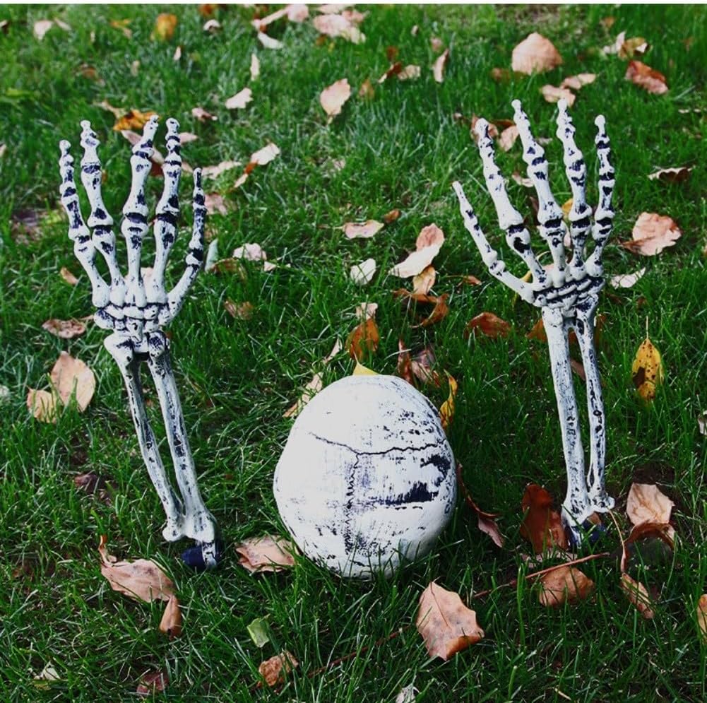 Set di decorazioni infestanti: questo set di ossa scheletro di Halloween include 2 mani e 1 teschio, perfetto per creare un display agghiacciante nel tuo cortile o giardino che farà i visitatori. Materiali resistenti alle intemperie: realizzati in plastica, questi pali scheletrici sono progettati per resistere a varie condizioni atmosferiche, uso duraturo anno dopo anno. Facile da usare: ogni pezzo può essere rapidamente inserito nel terreno per una installazione e rimozione senza problemi durante le feste di Halloween. [VERSATILITÀ FESTIVE] Adatto per cortili esterni o display spettrali interni, questa decorazione migliora qualsiasi ambiente a tema Halloween che crei. Design dettagliato: con caratteristiche realistiche e dettagli intricati, questi scheletri forniscono un tocco autentico alle tue decorazioni che gli appassionati di horror adoreranno.