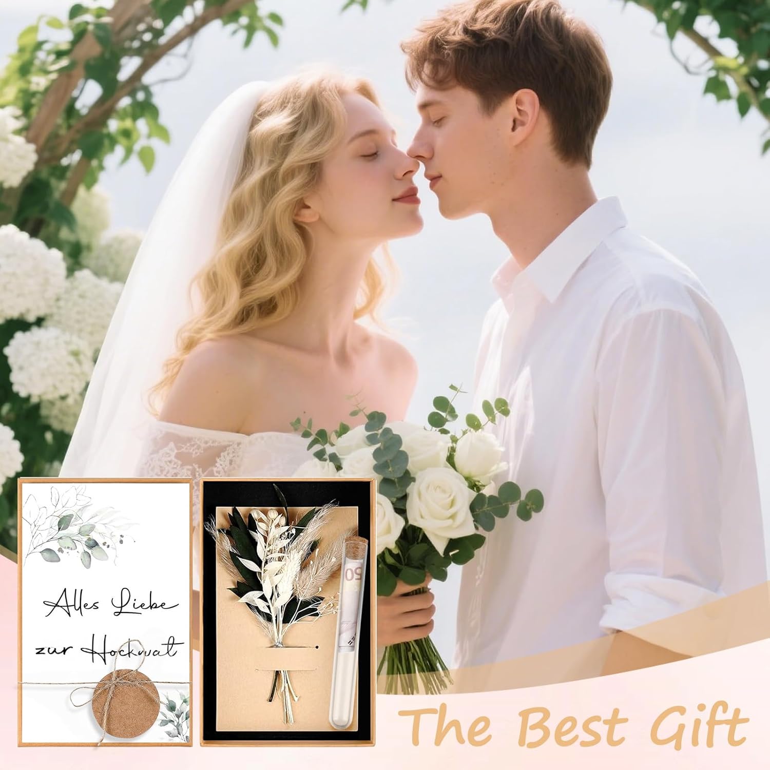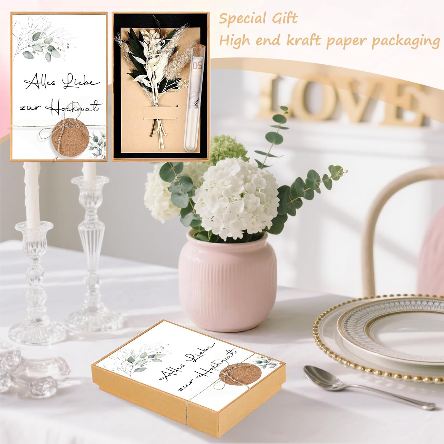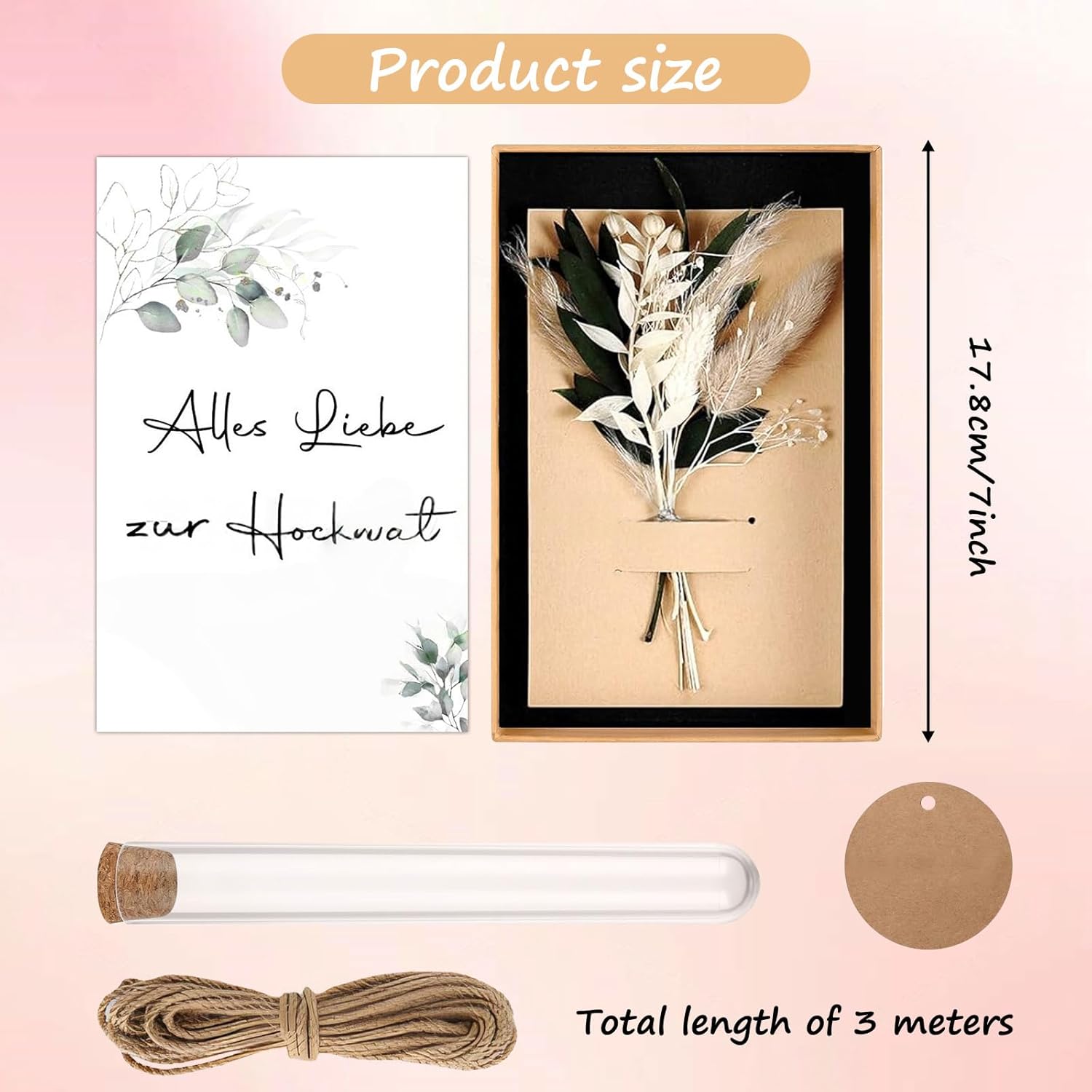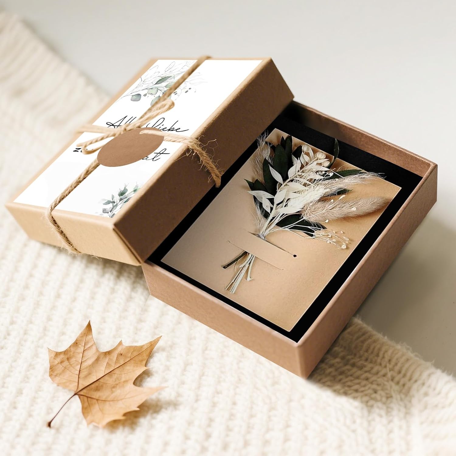 【Set regalo completo di soldi per il matrimonio con accessori】 Questo set regalo di soldi per il matrimonio contiene 1 confezione regalo (17,8 × 11,8 × 3,3 cm), 1 carta di fiori secchi (14,7 × 10 cm), 1 carta di nozze (17 × 11 cm), 1 ciondolo in carta kraft con corda di canapa, 1 tubo per soldi e 1 cordino (3 m). Tutto è già montato – ideale come regalo di nozze per gli sposi o come regalo di nozze personale con stile. 【Materiali di alta qualità per il tuo regalo di nozze in contanti】 Il set regalo di nozze in contanti è realizzato in robusto cartone e materiali di carta pregiata. I biglietti del set regali di nozze per gli sposi sono robusti, eleganti e lasciano un ricordo indelebile. Come regalo di nozze, questo set è durevole, raffinato e perfetto per presentare in sicurezza il tuo regalo. 【Dimensioni perfette per regali in contanti】 Questa elegante scatola (17,8 x 11,8 x 3,3 cm) con biglietto abbinato (17 x 11 cm) offre lo spazio ideale per regali in contanti ai matrimoni. L'elegante set regalo di nozze trasmette un apprezzamento speciale e diventa un regalo indimenticabile per gli sposi! 【Design elegante e ben congegnato】 Il set regalo di soldi per il matrimonio colpisce per la sua colorazione naturale, i dettagli progettati con cura e un aspetto moderno. Che si tratti di un elegante set regalo di nozze per gli sposi o di un simbolico regalo di nozze in contanti, il design trasmette apprezzamento e individualità. 【Idea regalo di nozze ideale】 Un set regalo in denaro per il matrimonio che è più di una semplice confezione: è un messaggio. Con il set regalo di nozze per gli sposi potrete regalare emozioni: eleganti, calde e personali. Questo regalo di nozze in denaro sarà ricordato e renderà speciale il tuo contributo.