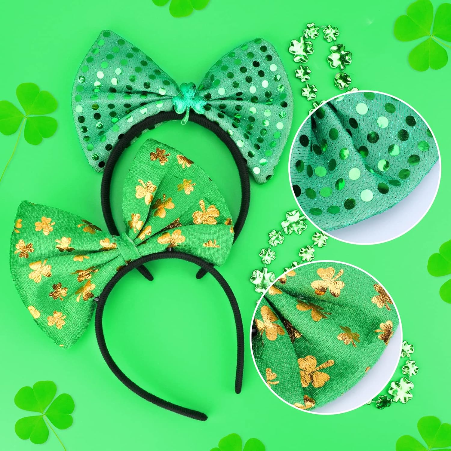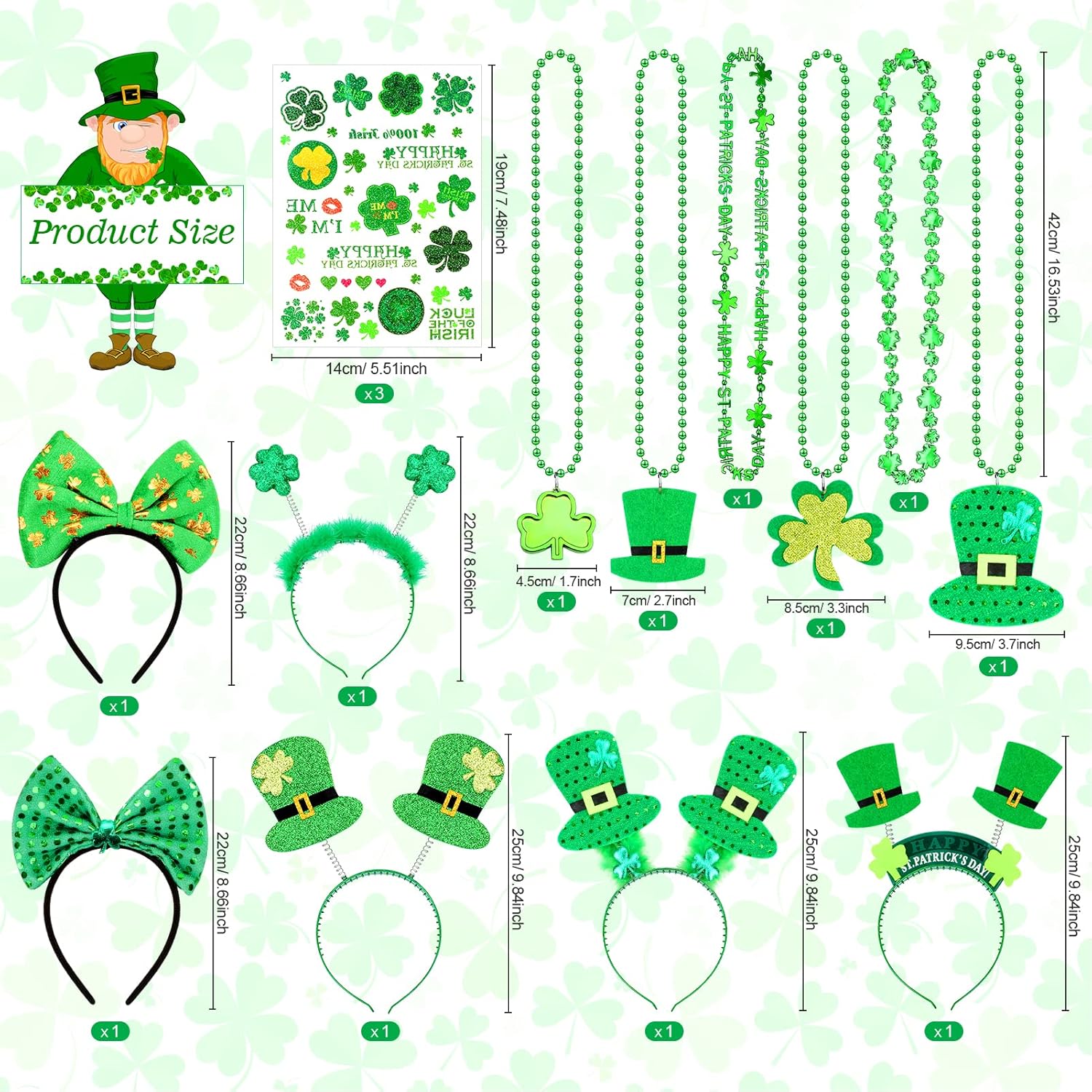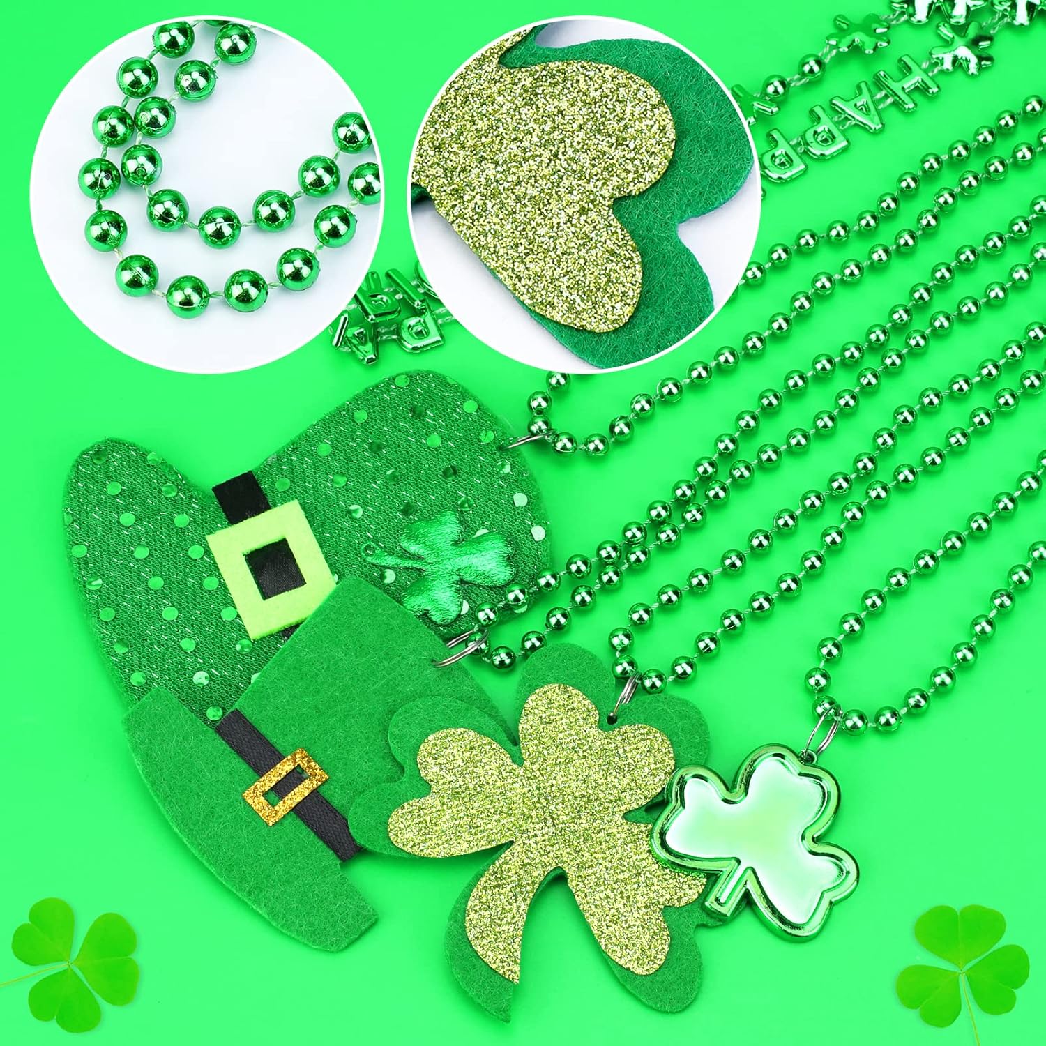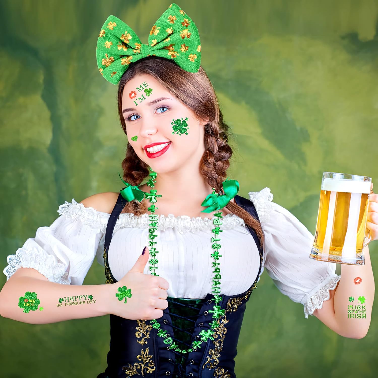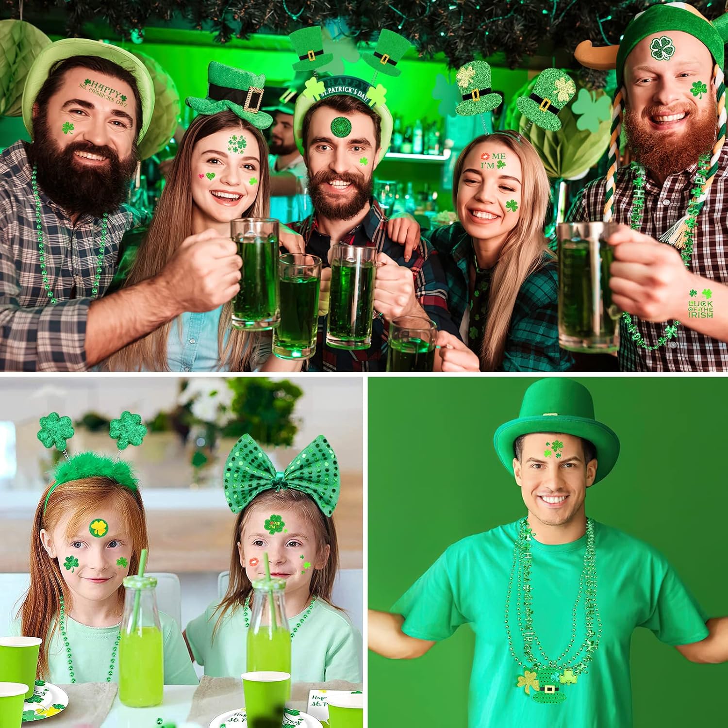 【St. Set di costumi per San Patrizio: questo set di decorazioni per il giorno di San Patrizio comprende 6 colletti verdi, 6 fasce per capelli e 4 fogli di tatuaggi temporanei per il giorno di San Patrizio. Colori e design accattivanti sono perfetti per le decorazioni della festa di San Patrizio. Materiale di qualità: realizzato in plastica e carta di alta qualità, il set di decorazioni con trifoglio verde è sicuro e durevole, delicato sulla pelle, comodo da indossare e non sbiadisce o si rompe facilmente. Il design unico e sofisticato ti consente di indossarli insieme o da soli, o con altri accessori a tema, aggiungendo più divertimento e glamour al tuo outfit da festa e regalandoti ricordi indimenticabili delle vacanze. Decorazioni popolari per il giorno di San Patrizio: questo accessorio per il giorno di San Patrizio per adulti e bambini farà sentire a tutti i presenti alla festa la fortuna del fascino irlandese. Con principalmente elementi di trifoglio e colori verde brillante, che simboleggiano la vita, la vitalità e la speranza, è pieno di atmosfera festosa e incontra il tema festivo e l'atmosfera del carnevale. Occasioni applicabili: i nostri oggetti di scena del trifoglio sono delicatamente progettati per la festa di San Patrizio, processioni, carnevale, eventi e celebrazioni festive, applicabili anche per feste a tema, feste di cosplay, recite scolastiche, spettacoli teatrali e altre occasioni, che possono soddisfare le tue esigenze di costumi e portare gioia alla tua festa. ACQUISTA CON FIDUCIA: i set di decorazioni per quadrifogli per il giorno di San Patrizio sono un accessorio essenziale per le tue celebrazioni festive e possono aiutarti a creare un look elegante e accattivante che riceve molti complimenti e fa risaltare le decorazioni della tua festa. Per altri regali festivi, visita il nostro negozio.