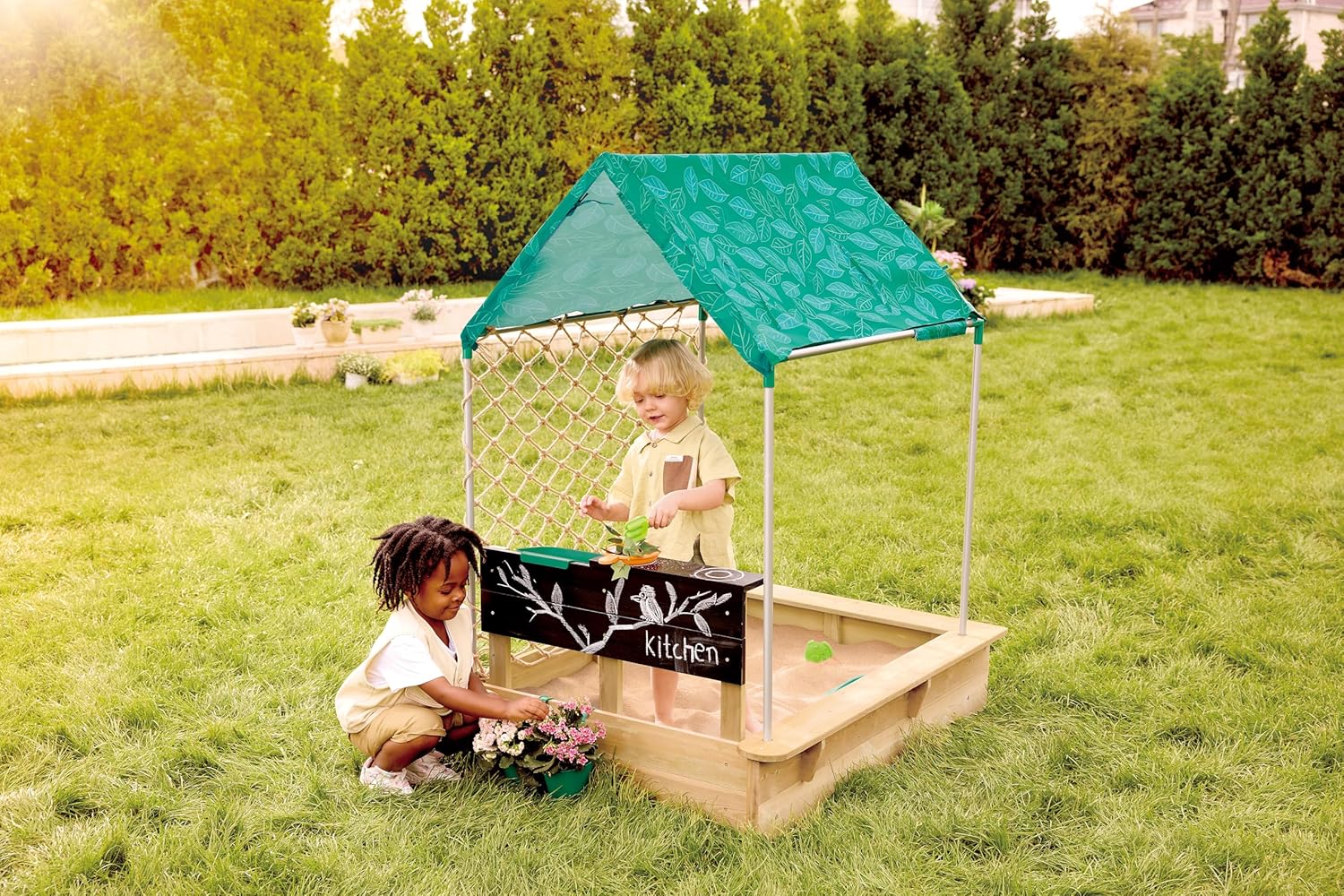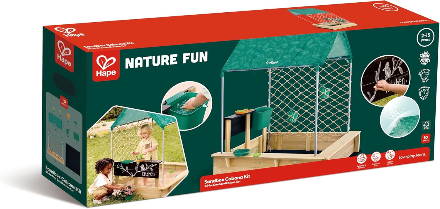 DIVERTIMENTO COMPLETO ALL'APERTO: questo kit tutto in uno è perfetto per il gioco all'aperto. Funge da cucina all'aperto, sabbiera, spazio per piante e cavalletto, offrendo ai tuoi bambini infinite opportunità di divertirsi e imparare. GIOCO SICURO E CONFORTEVOLE: L'ombrellone, realizzato in materiale impermeabile, fornisce protezione ultravioletta (UPF) 50, che aiuta a proteggere i tuoi bambini dall'esposizione al sole nelle giornate calde e soleggiate. FACILE INSTALLAZIONE: il montaggio rapido con connettori sostituibili e copertura anti-erbacce semplifica la manutenzione, rendendo questo kit un'aggiunta senza problemi al tuo giardino. ISPIRA AVVENTURE ALL'APERTO: questo kit include una lavagna per disegnare e dipingere, un tavolo da cucina che trasforma la sabbiera in una cucina all'aperto e tanti accessori per ispirare diversi scenari di gioco. PROMUOVERE IL GIOCO SOCIALE: il design spazioso consente a 2 o 3 bambini di giocare contemporaneamente. Caratteristiche aggiuntive come un grande lavandino e 3 fioriere in metallo promuovono l'interazione sociale e il gioco cooperativo.