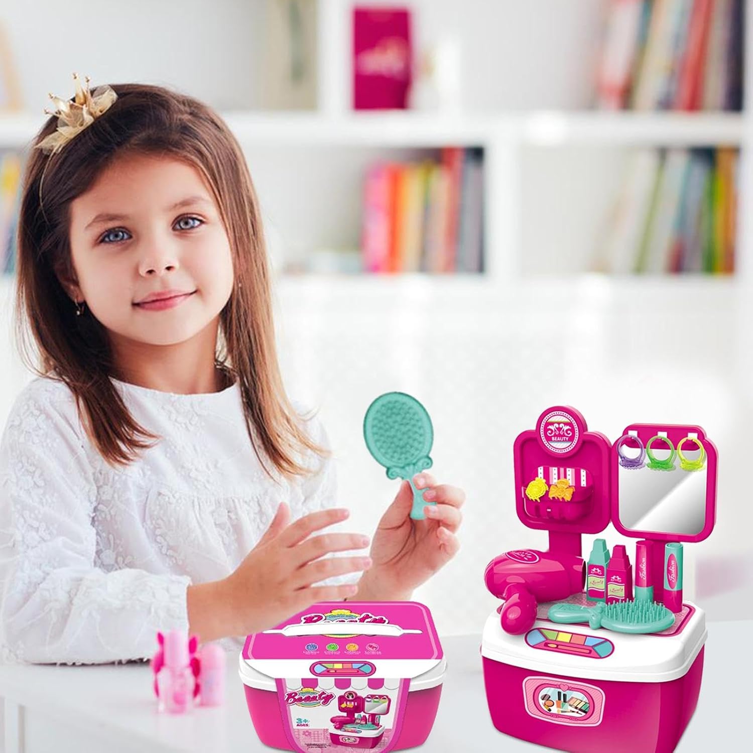 Regalo eccezionale: migliora il di gioco della tua ragazza con questo set da parrucchiere giocattolo e lascia che scateni il suo stilista interiore. Ideale per i bambini creativi, è un regalo perfetto per compleanni, Natale e ogni occasione. Instilla in lei la gioia della creatività e della socializzazione. Tocco confortevole: il nostro set da parrucchiere giocattolo per ragazze è realizzato con materiali durevoli con cui i bambini possono giocare in tutta sicurezza. I bordi lisci e un tocco confortevole garantiscono infinite ore di gioco senza alcun danno. Ampio utilizzo: questo set da parrucchiere giocattolo per ragazze è perfetto per i principianti che vogliono esplorare il mondo della bellezza. Ha una vasta gamma di applicazioni, come feste per principesse, feste di compleanno, giochi di vestire per principianti e altro ancora. Giocattoli divertenti: il set da parrucchiere giocattolo da 19 pezzi per ragazze offre un divertimento realistico styling dei capelli. Decorato con specchio, completamente attrezzato con asciugacapelli e pettine, il tuo bambino vivrà un'esperienza creativa con l'ulteriore vantaggio di un anello affascinante e un set per il trucco realistico. Pacchetto Educazione Precoce: potenzia le abilità di tuo figlio con questo set da parrucchiere giocattolo per ragazze. Migliora la capacità di apprendimento con accessori cosmetici distinguibili, promuovi lo sviluppo intellettuale e migliora l'abilità pratica.