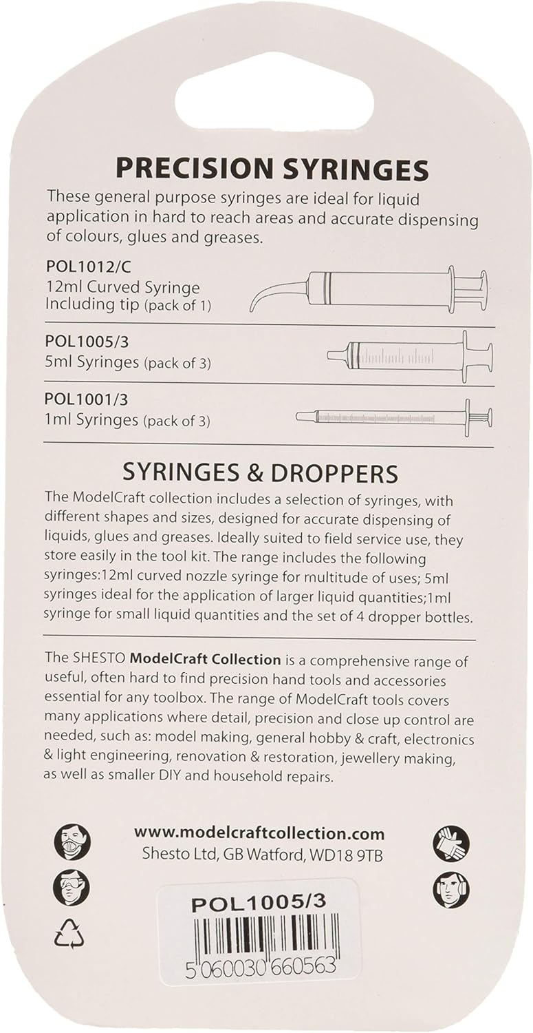 Siringhe per scopi generici. Ideali per l'applicazione di piccole quantità di liquido. In confezione da 3 pezzi. 3 siringhe da 5 ml. Ideale per hobby e piccoli compiti fai da te.