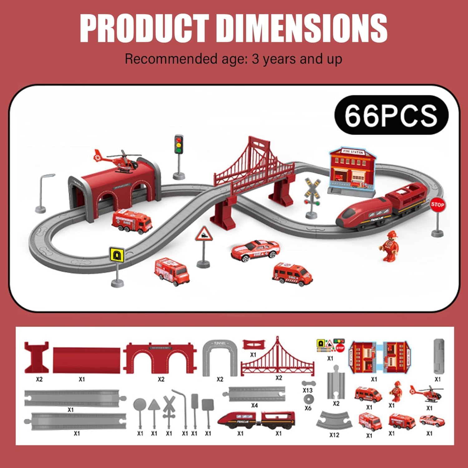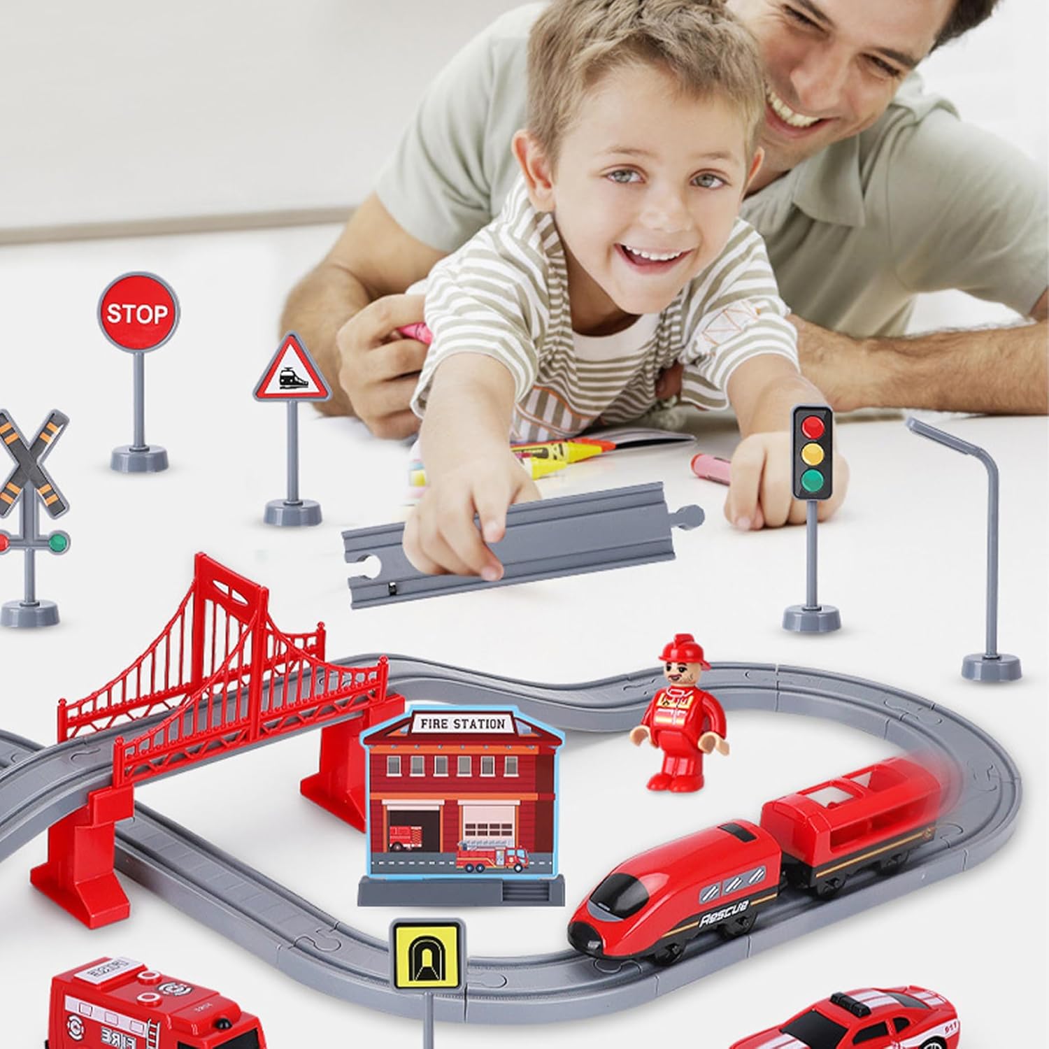 Facile assemblaggio e conservazione: il design dei binari ad incastro consente una rapida installazione e rimozione, favorendo il gioco indipendente e un comodo stoccaggio dopo l'uso. Materiali robusti e sicuri: realizzato in plastica ABS atossica, questo set di trenini per bambini garantisce un gioco sicuro e una lunga durata, perfetto per ragazzi e ragazze dai 3 anni in su. Scelta perfetta: ideale per compleanni o vacanze, questo versatile set di treni cattura l'interesse dei bambini, favorendo ore di divertimento e gioco cooperativo. Benefici educativi e di sviluppo: incoraggia la coordinazione occhio-mano, il ragionamento spaziale e il gioco di ruolo fantasioso, supportando la crescita cognitiva nella prima infanzia. Esperienza di gioco coinvolgente: include 66 pezzi con una varietà di trenini colorati, camion dei pompieri e segmenti di binari flessibili che stimolano la creatività e le capacità motorie.