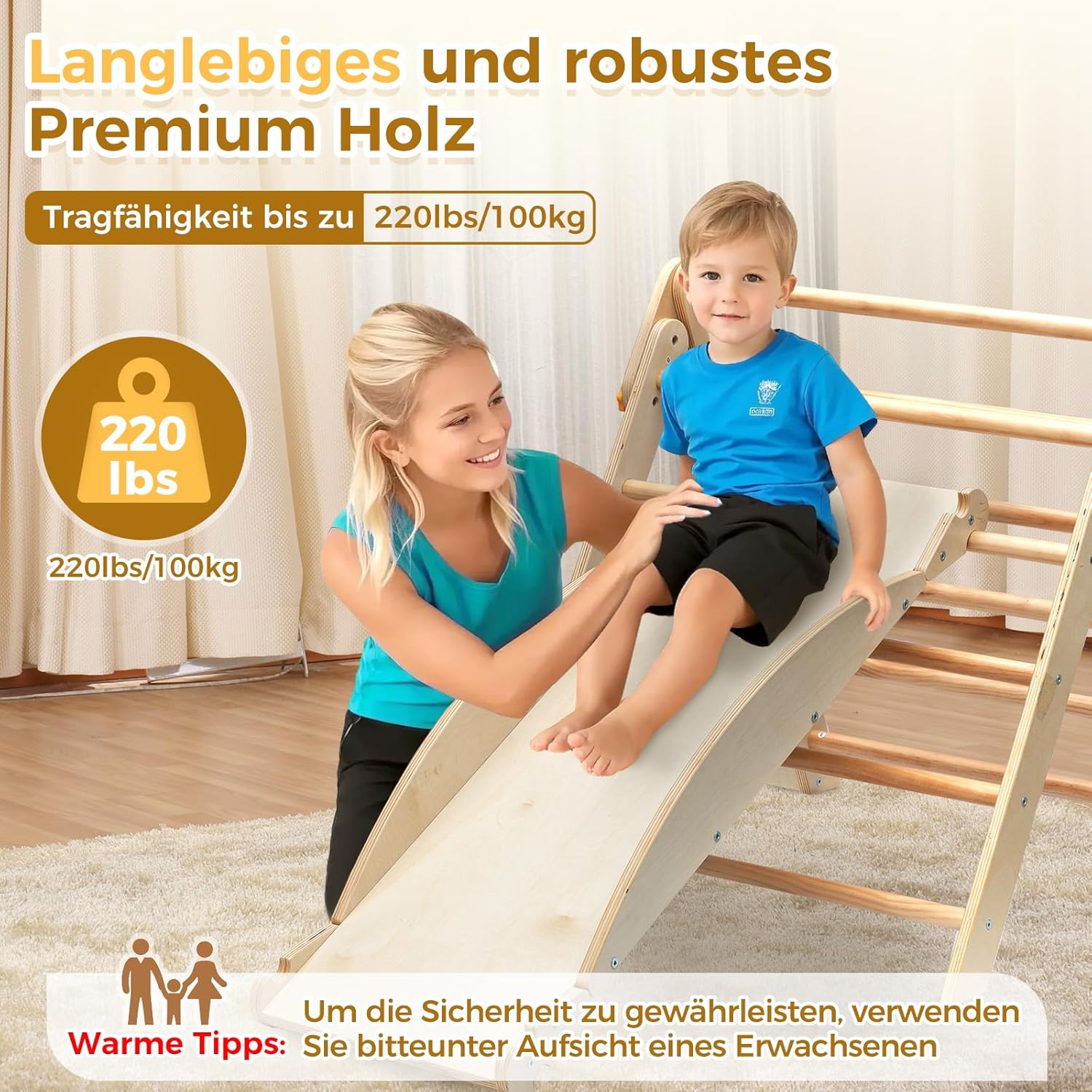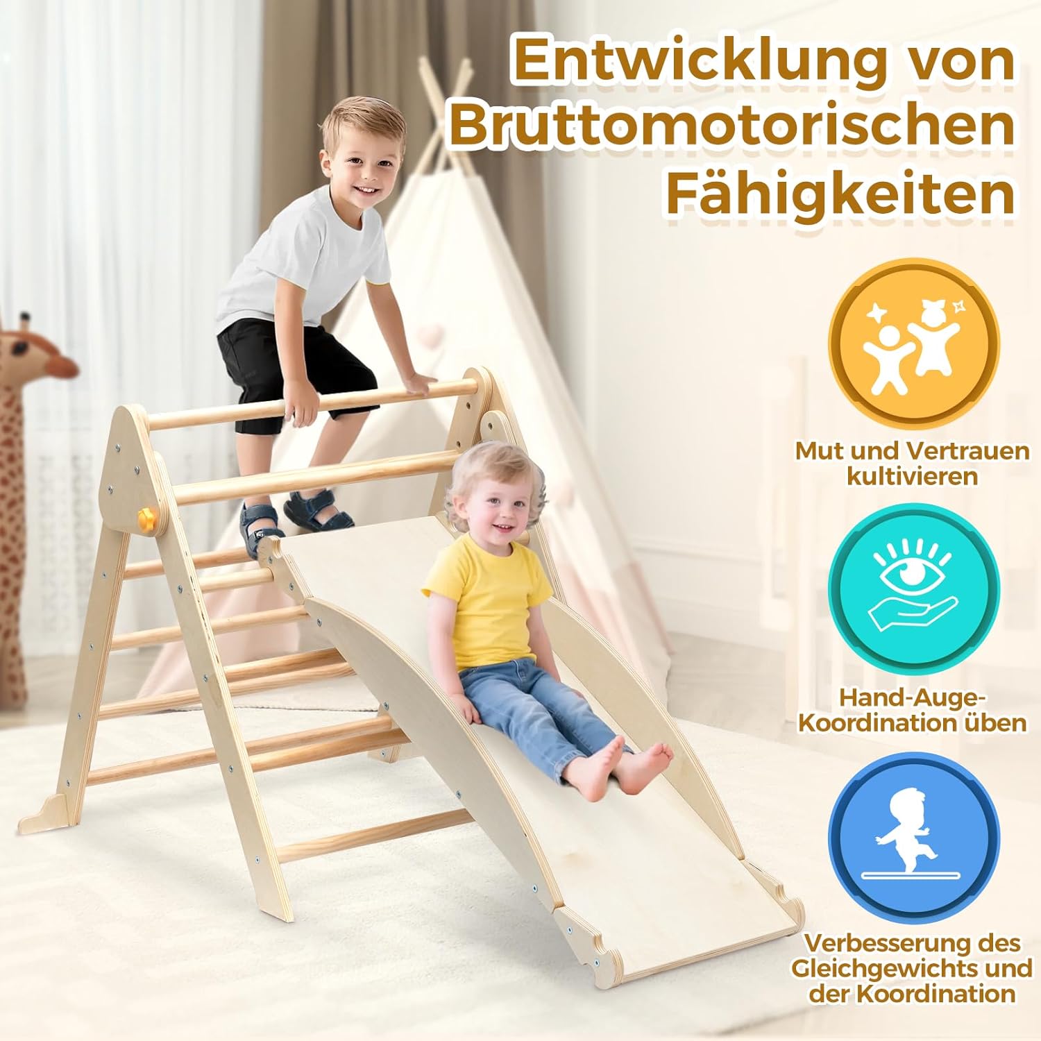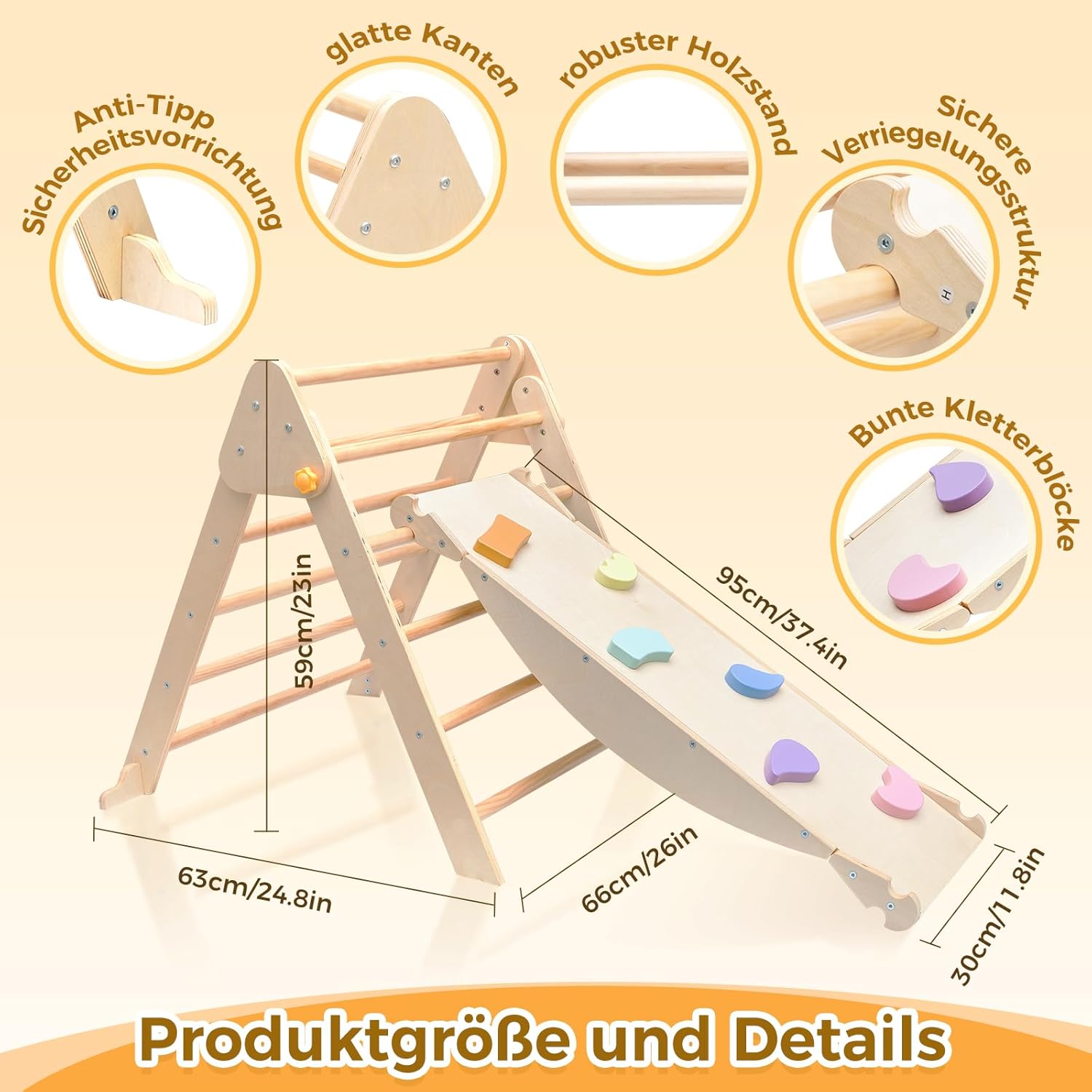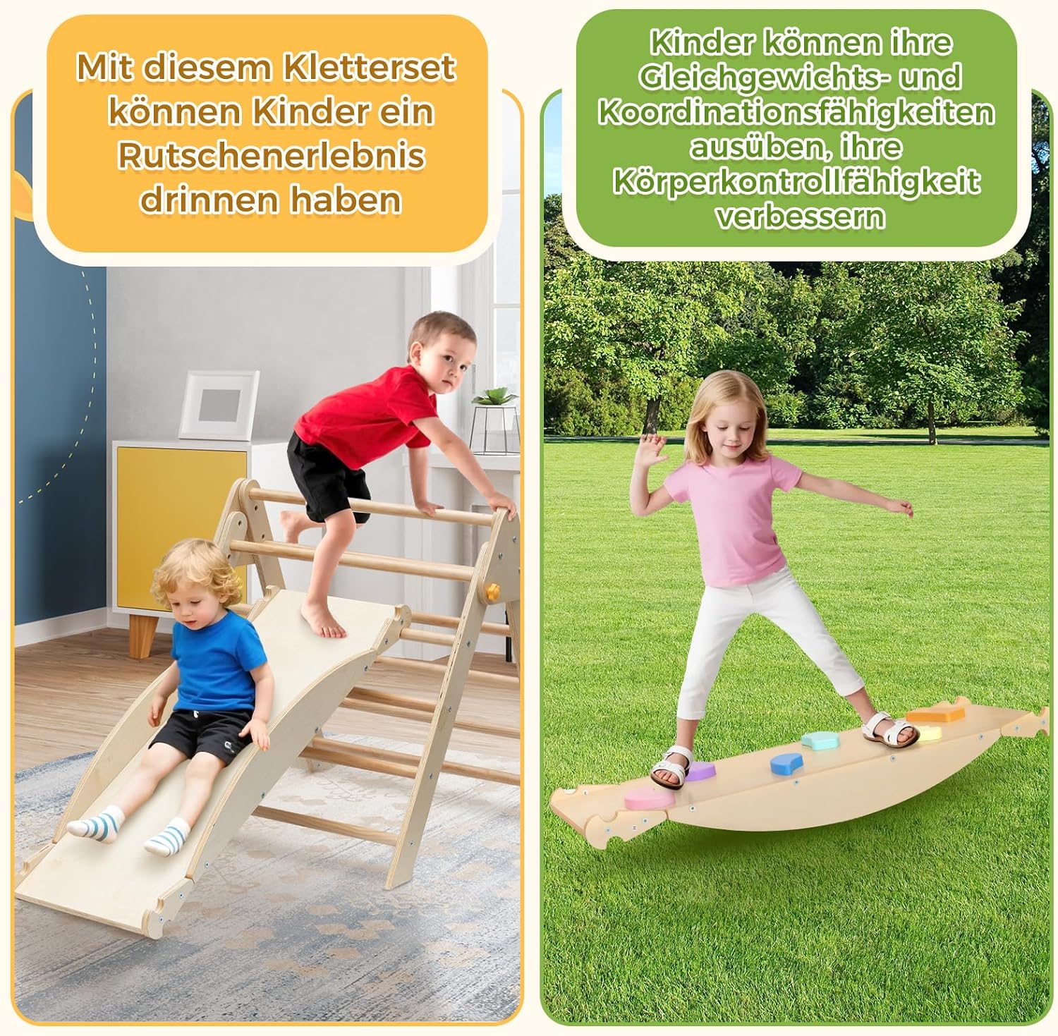 【Set da arrampicata multifunzionale】 I bambini possono arrampicarsi sul telaio triangolare da arrampicata e la tavola lunga può essere utilizzata come scivolo o sega a levetta. Questo set di arrampicata offre diverse opzioni di gioco per i tuoi bambini. Pieghevole e facile da riporre: basta allentare il pulsante giallo del set di triangoli da arrampicata e può essere piegato e riposto in pochi secondi senza occupare spazio. Il kit viene fornito con istruzioni di montaggio dettagliate che lo rendono facile da installare e smontare. Materiale e struttura sicuri: il nostro set di triangoli da arrampicata è realizzato in legno di pino di alta qualità. Il legno è accuratamente lucidato, liscio e senza burr. Inoltre dotato di dispositivo anti-inclinazione nella parte inferiore per migliorare la stabilità. Può creare un ambiente di gioco sicuro per i vostri bambini. Stimola l'equilibrio e la coordinazione: questo set da arrampicata Montessori è appositamente progettato per le prime fasi della crescita del bambino. Ha lo scopo di migliorare lo sviluppo fisico, l'equilibrio e la coordinazione in modo che il bambino possa crescere durante il gioco e offrire un doppio divertimento nella crescita. 【Grande regalo per bambini】 Questo set da arrampicata Montessori è un ottimo strumento per l'educazione precoce, regalo perfetto per accompagnare la crescita del bambino. Incoraggia i bambini a esplorare in modo indipendente, spingere i loro confini e sostenere la crescita fisica e cognitiva.