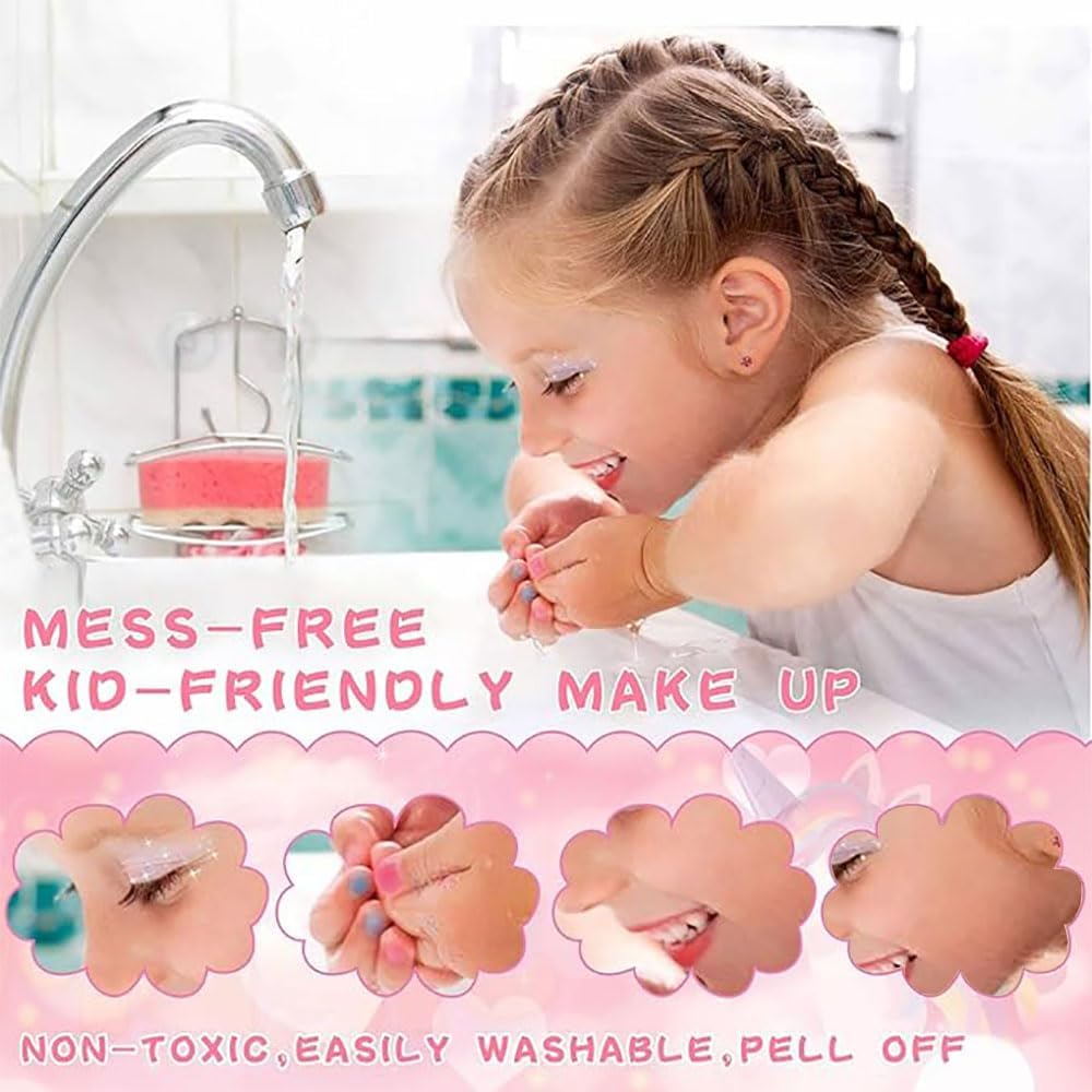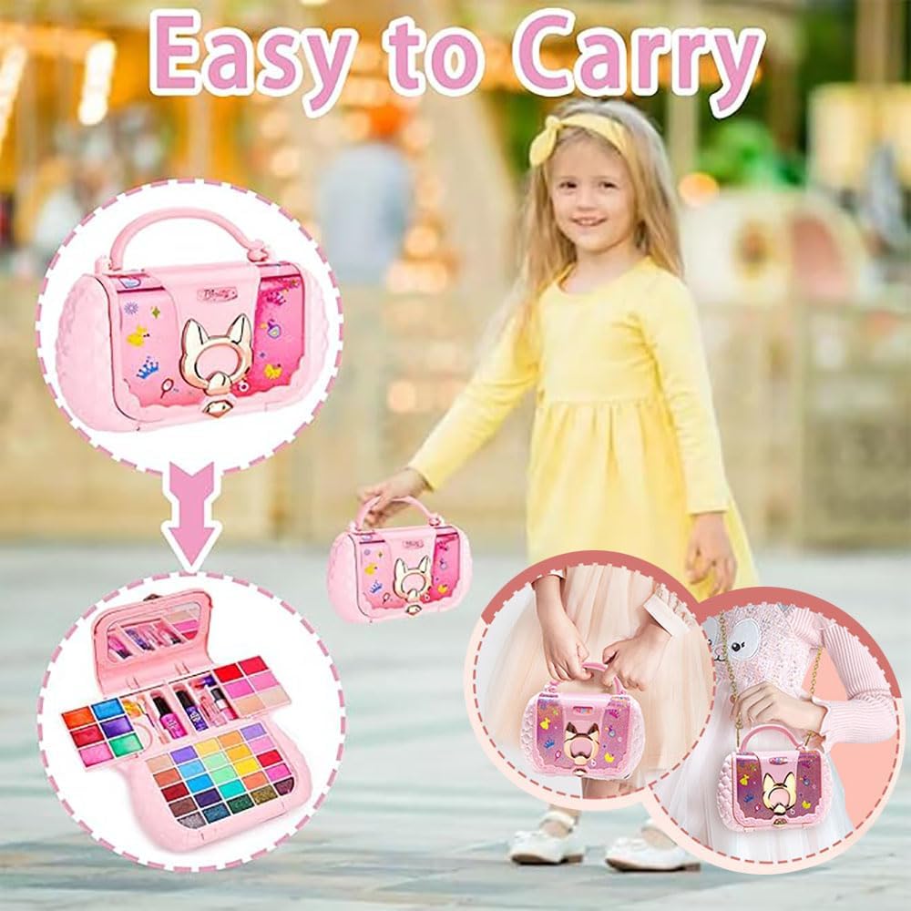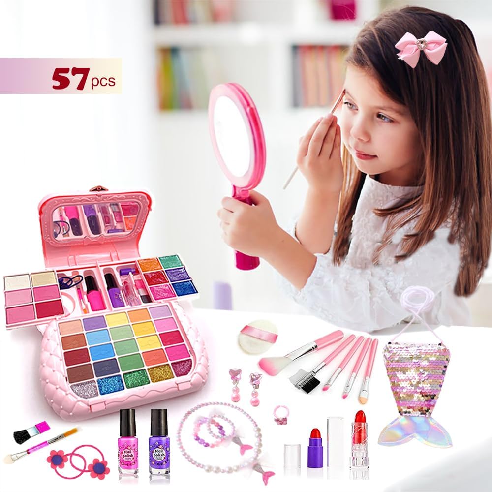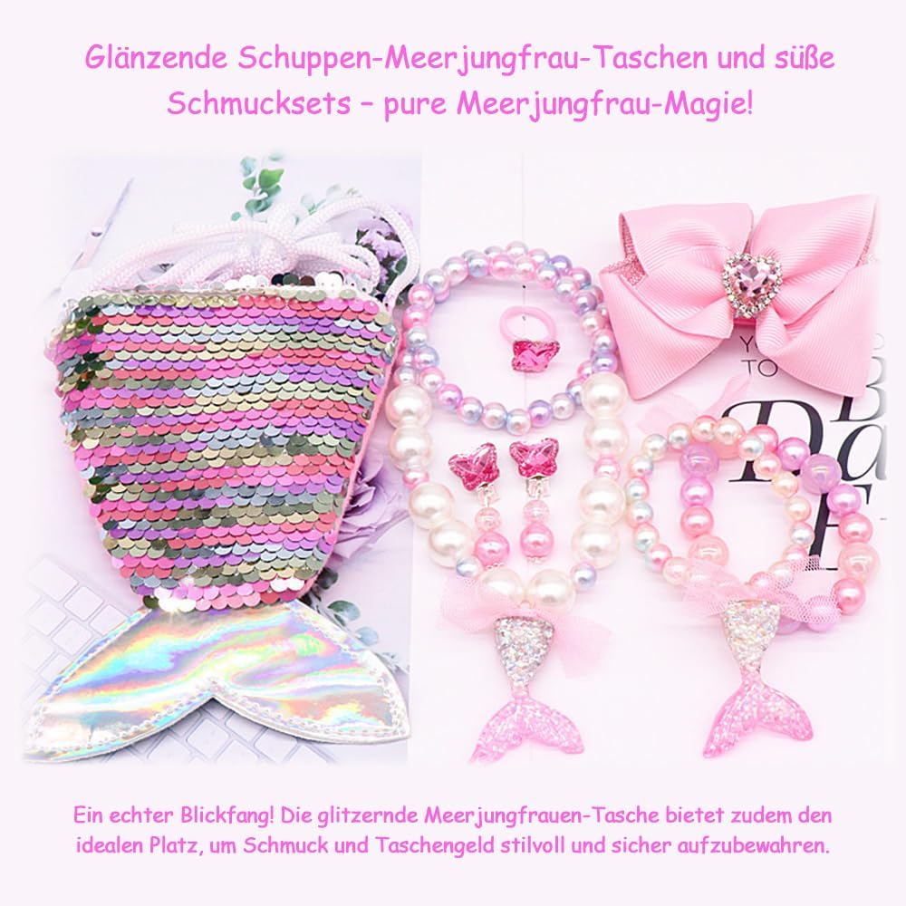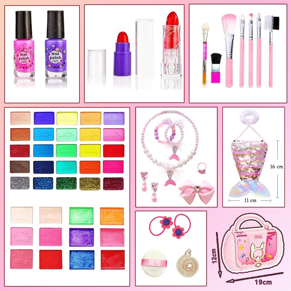 Questo set trucco per bambini da 57 pezzi comprende borsetta, smalto, rossetto, pennello, ombretto, cipria compatta, collana di perle, braccialetto, orecchini, anello, fermaglio per capelli, borsa a sirena iridescente, elastico per capelli, piumino da cipria e catena per borsa. Un set perfetto per le piccole principesse! Tutto ciò di cui un bambino ha bisogno per truccarsi e travestirsi in un unico set, ideale per giochi di ruolo creativi. Le 36 tonalità di ombretti e fard offrono un'ampia gamma di opzioni. Il cerchietto con una farfalla rosa trasforma ogni ragazza in una principessa. Il set trucco diventa una borsa portatile, da portare a spalla tramite manico o catena dorata. Perfetto per gli spostamenti! Un vero colpo d'occhio! La scintillante borsa a sirena offre anche il luogo ideale per riporre gioielli e paghette in modo elegante e sicuro. Giocattolo per il trucco sicuro e lavabile, ideale come regalo di compleanno o di Natale per le ragazze che amano provare look diversi.