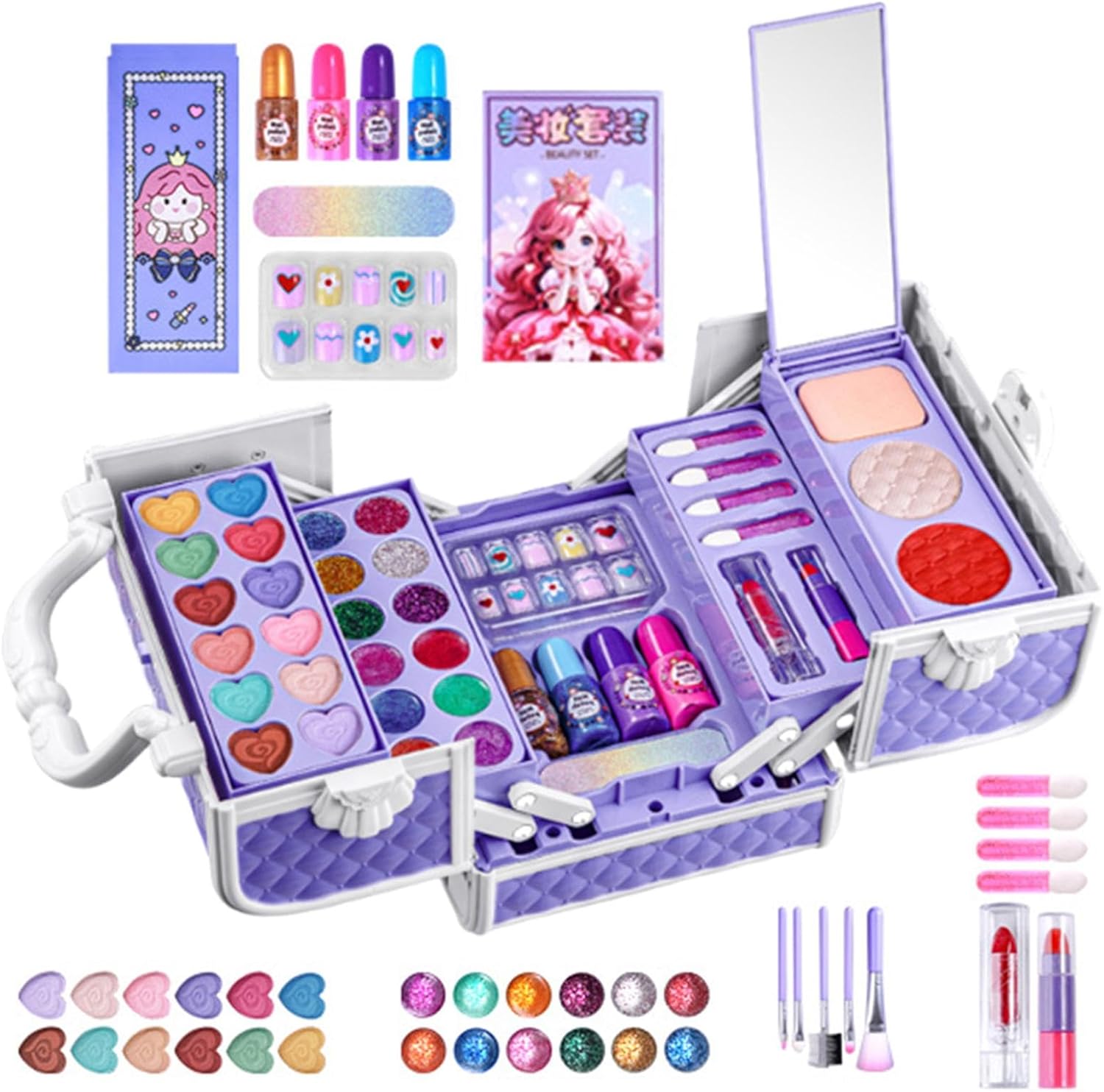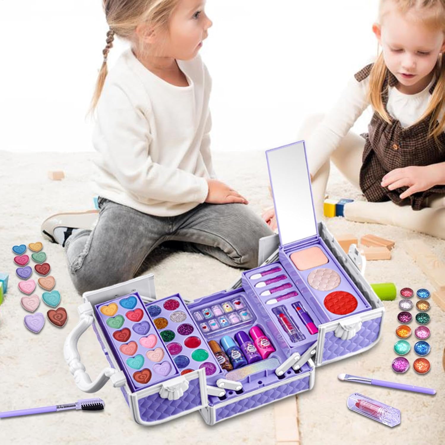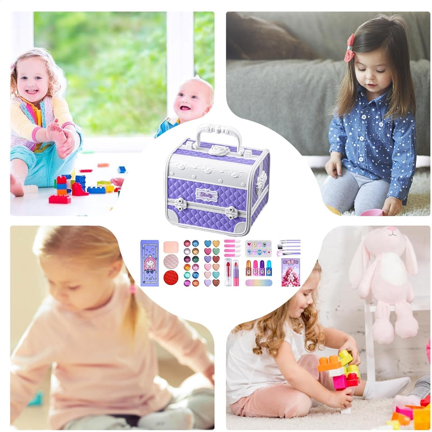 MATERIALE AMICO DELLA PELLE: Il nostro set di trucchi per bambini utilizza ingredienti naturali ed è delicato sulla pelle sensibile. La formula idrosolubile consente la pulizia con acqua e sapone KIT COMPLETO TRUCCO PER BAMBINI: questo set all-inclusive offre più possibilità con un'ampia gamma di tonalità e strumenti, regalando alle ragazze ore di divertimento esplorando la propria creatività. Dall'ombretto al rossetto, questo set ha tutto. GIOCATTOLI EDUCATIVI MULTIFUNZIONALI: incoraggia la creatività di tuo figlio con il kit trucco per bambini, il perfetto giocattolo educativo multiuso che realizza il sogno di ogni bambina di imitare le attività degli adulti. Guardala mentre scopre la gioia della bellezza e del trucco attraverso il divertimento e l'esplorazione. FACILE DA TRASPORTARE: questo set per il trucco per bambini conserva ordinatamente trucco, accessori e giocattoli in una versatile custodia rigida con maniglia per un facile trasporto. Regalo pratico: regala alla tua bambina il regalo perfetto per il compleanno o la festa dei bambini con questo set per il trucco sicuro. Progettato come alternativa al trucco per adulti, consente ai bambini dai 3 ai 12 anni di mettere in pratica le proprie abilità di bellezza senza danni.