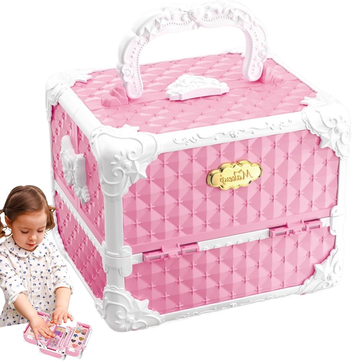 Set diversificato: libera la creatività di tuo figlio con questo ricco set di cosmetici, che include smalto, ombretto, lucidalabbra, fard, rossetto e pennelli per il trucco per diversi stili di decorazione. Aumenta la fiducia: il nostro set di trucco per ragazze promuove un'espressione personale unica e consente ai bambini di sperimentare più opzioni di bellezza per promuovere l'immaginazione e la creatività. Giocare con il trucco migliora le capacità motorie, aumenta la fiducia in se stessi e offre ai bambini l'opportunità di esprimersi. Priorità alla sicurezza: il nostro set di trucchi per bambini e bambine è realizzato con materiali sicuri e delicati sulla pelle. Tutti i cosmetici possono essere facilmente lavati via con acqua, garantendo la salute e la sicurezza del tuo bambino. Comodità portatile: questa attraente borsa dal design con maniglia non solo semplifica l'organizzazione del trucco, ma fornisce anche una funzione antipolvere che garantisce ordine ed efficienza dello spazio, consentendo ai bambini di utilizzare o trasportare il trucco comodamente in qualsiasi momento. Regalo adorabile: questo set di trucchi per bambini consente alle ragazze di mostrare la propria individualità e fascino. Ideale per compleanni, vacanze e altre occasioni speciali, è un regalo fantastico che li aiuterà a esprimere la loro personalità unica e a creare ricordi indimenticabili