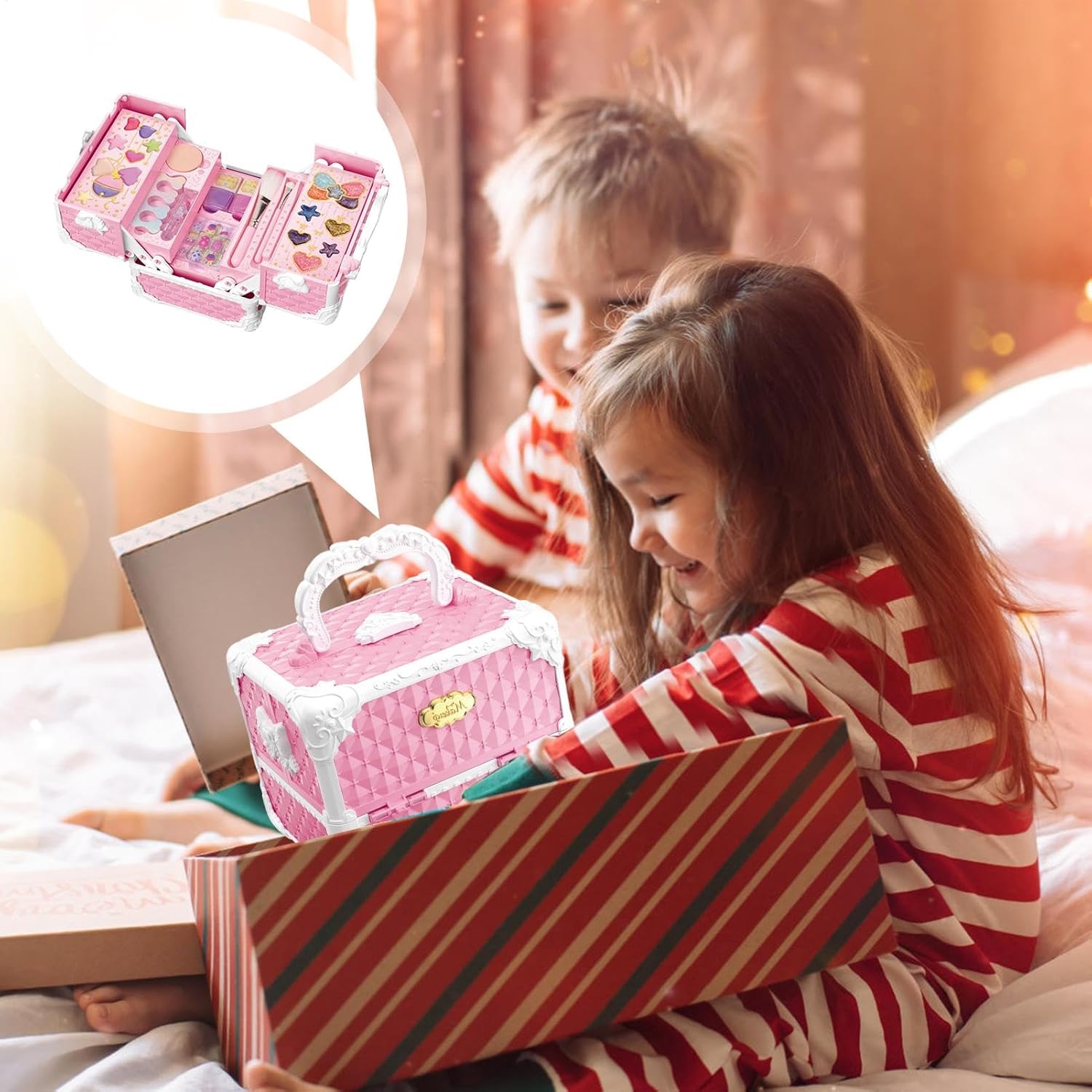 Set diversificato: libera la creatività di tuo figlio con questo ricco set di cosmetici che include smalto per unghie, ombretto, lucidalabbra, fard, rossetto e pennelli per il trucco per una varietà di stili di decorazione. Aumenta la fiducia: il nostro set di trucchi per ragazze incoraggia l'espressione personale unica e consente ai bambini di sperimentare più opzioni di bellezza per incoraggiare l'immaginazione e la creatività. Playing with makeup improves fine motor skills, boosts confidence and gives children the opportunity to express themselves Safety Priority: Our kids makeup set for girls is made from safe, skin-friendly materials. Tutti i cosmetici possono essere facilmente lavati via con acqua, garantendo la salute e la sicurezza del tuo bambino. Comodità portatile: questa custodia dal design accattivante con maniglia non solo semplifica l'organizzazione del trucco, ma fornisce anche una funzione antipolvere che garantisce ordine ed efficienza dello spazio, consentendo ai bambini di utilizzare o trasportare il trucco comodamente in qualsiasi momento. Regalo adorabile: con questo set di trucco per bambini, le ragazze possono mostrare la loro individualità e il loro fascino. Ottimo per compleanni, vacanze e altre occasioni speciali, è un regalo fantastico che li aiuterà a esprimere la loro personalità unica e a creare ricordi indimenticabili