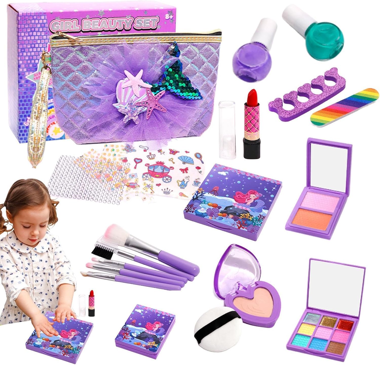 Divertimento garantito: con questo set di trucchi per bambini, il viaggio fantasioso di un bambino inizia mentre si addentra nel mondo dei cosmetici con un set per il trucco, un set di accessori per unghie, un set di strumenti per il trucco e un'adorabile borsa per il trucco. Ore di divertimento sono garantite. La sicurezza prima di tutto: il nostro set trucco per bambini è realizzato con materiali sicuri, solubili in acqua e rispettosi dell'ambiente. La sua consistenza delicata e morbida è delicata sulla pelle sensibile e si lava via facilmente con acqua e sapone per un gioco senza preoccupazioni. Pratico e adatto ai viaggi: saluta il nuovo giocattolo preferito di tuo figlio. Questo set per il trucco è dotato di una maniglia per il trasporto che rende lo stoccaggio e il trasporto un gioco da ragazzi. Questo set molto leggero e portatile è molto facile da trasportare e garantisce che tuo figlio possa godersi i suoi cosmetici preferiti ovunque. Ispira creatività: questo set di trucchi per bambini ispira l'espressione artistica e la creatività pratica. Non si tratta solo di cosmetici, ma di un'avventura artistica e artigianale in cui le bambine possono truccare se stesse, i loro amici o fratelli con le loro idee uniche e godersi più ore di gioco fantasioso. Idea regalo perfetta: un must per ogni genitore per portare gioia al proprio bambino nel suo giorno speciale. Regala loro una sorpresa di compleanno unica con il nostro set di trucchi per bambini, un regalo ideale per le ragazze che amano giocare a travestirsi. Perfetto per compleanni, Halloween, Natale e tutti i tipi di celebrazioni
