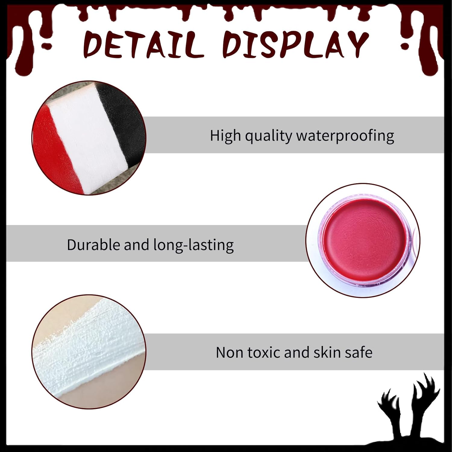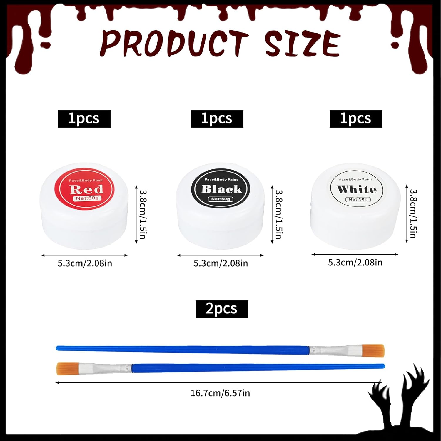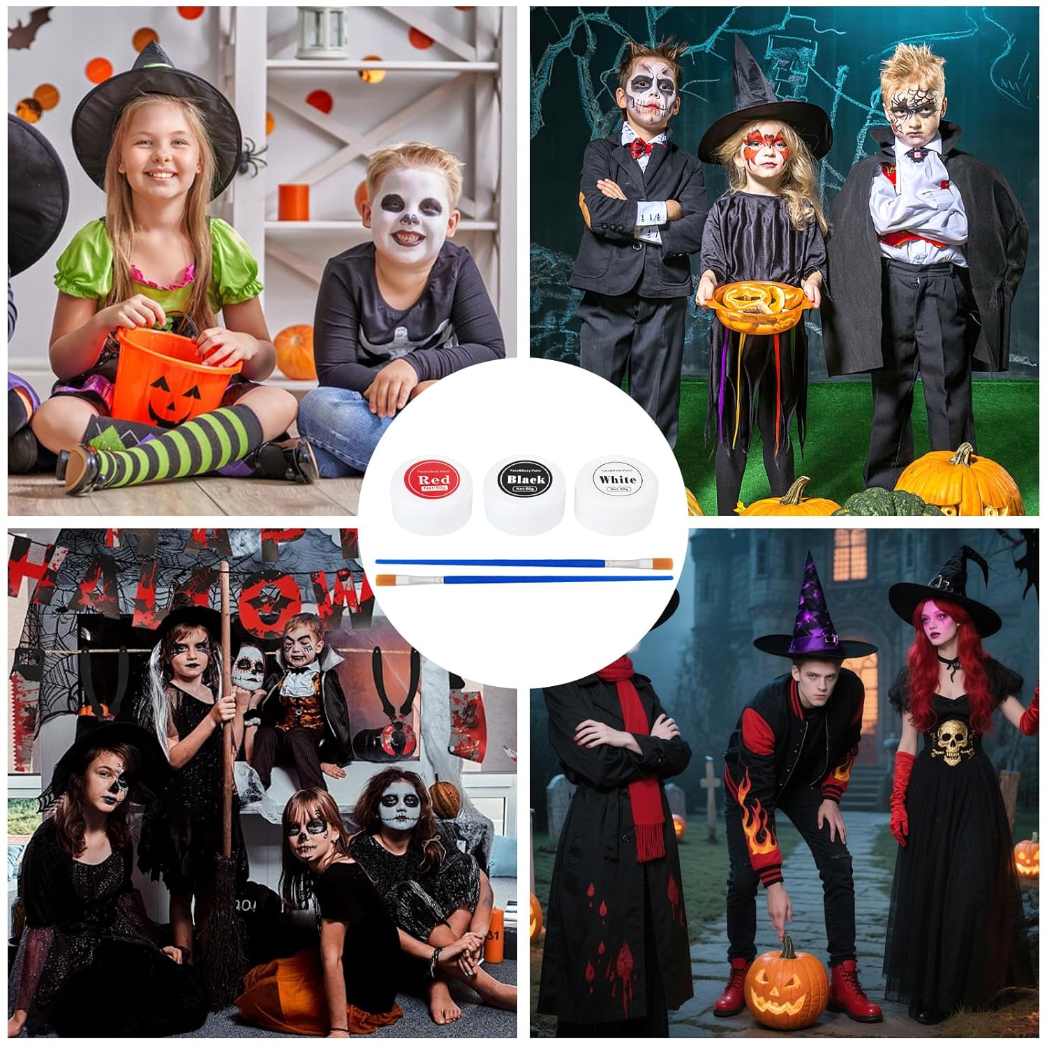 Halloween Spezialeffekt Make Up Set: Die Gesichtsfarbe in Schwarz, Weiß e Rot können sofort verwendet oder mit anderen Farben gemischt werden, um so viele verschiedene Farben wie gewünscht zu kreieren. Il semplice set per il trucco di Halloween con pennelli è un set per il trucco di Halloween per la pittura del viso e del corpo. Sicuro e durevole: il set per il trucco di Halloween è realizzato in materiale di alta qualità con una consistenza morbida e delicata. La nostra vernice per il viso ha una composizione delicata sulla pelle che può coprire facilmente l'intero viso. Progettato in nero, bianco e rosso, è adatto per giocare a clown, scheletri e fantasmi. Combinazione unica: il colore del viso è nero, bianco e rosso e la texture è morbida e delicata e il trucco dura a lungo, non si secca e non si screpola. Sviluppato appositamente per colori semplici, sperimenta le possibilità con i nostri colori per il viso con effetti speciali per Halloween. Porta un diverso tipo di gioia per Halloween Facile da usare: facile da usare, applicare sulla pelle con una spugna, un pennello o con la punta delle dita. Il set per il trucco di Halloween è molto facile da applicare e rimuovere. Utilizzando uno struccante professionale, pulire con un tovagliolo di carta e risciacquare con tonico e acqua. Si consiglia di effettuare un test allergico dietro l'orecchio prima dell'uso. Ampiamente usato: questo set di trucchi per Halloween è adatto a una varietà di colori per viso e corpo. Set per il trucco di Halloween Come semplice set per il trucco, è adatto a varie celebrazioni e feste come Halloween, carnevale, trucco teatrale, feste di compleanno, feste in maschera, cosplay, spettacoli teatrali, ecc. Immergiti in un mondo di creatività nel trucco con questo semplice set