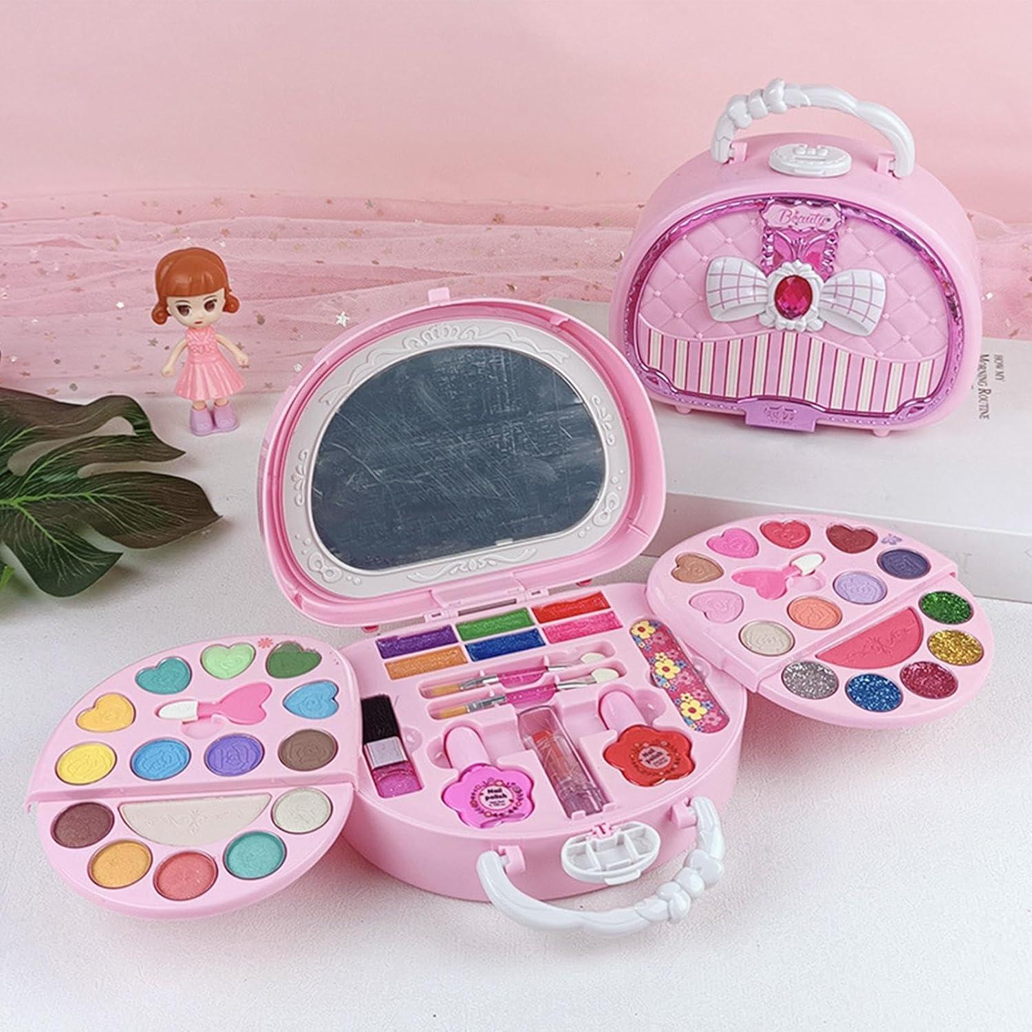 Nessun danno alla pelle: questo set di giocattoli per il trucco è progettato per bambini dai 3 anni in su e si prende cura della pelle giovane. Non danneggerà la pelle sensibile del tuo bambino poiché è realizzato con materiali innocui, non irritanti e sani. Facile da usare: le bambine possono vestirsi in modo sicuro e divertente con il nostro diversificato set di trucchi. Con rossetto, ombretto, fard e altro, questo set offre una varietà di scelte di trucco con facilità di applicazione e pulizia che ispirano creatività e immaginazione. Facile da trasportare: non perdere mai un'opportunità di trucco con il nostro set di trucco per ragazze facile da trasportare. Portalo ovunque e mostra la tua graziosa scatola di bellezza portatile. Perfetto per giocare durante le gite in famiglia o le riunioni con gli amici. Sviluppa abilità sociali: incoraggia l'espressione personale e le abilità sociali con questo set di trucchi per ragazze. Imita l'applicazione del trucco per adulti ed esplora il lato fantasioso di tuo figlio con gli eccellenti oggetti di scena per giochi di ruolo. Scopri cosa vuol dire essere una principessa o una modella e aumenta la tua sicurezza. Gioco interattivo: il set di trucco interattivo per ragazze promuove lo sviluppo cognitivo, insegna concetti base di bellezza e auto-espressione divertendosi. Gettare le basi per la futura educazione alla bellezza
