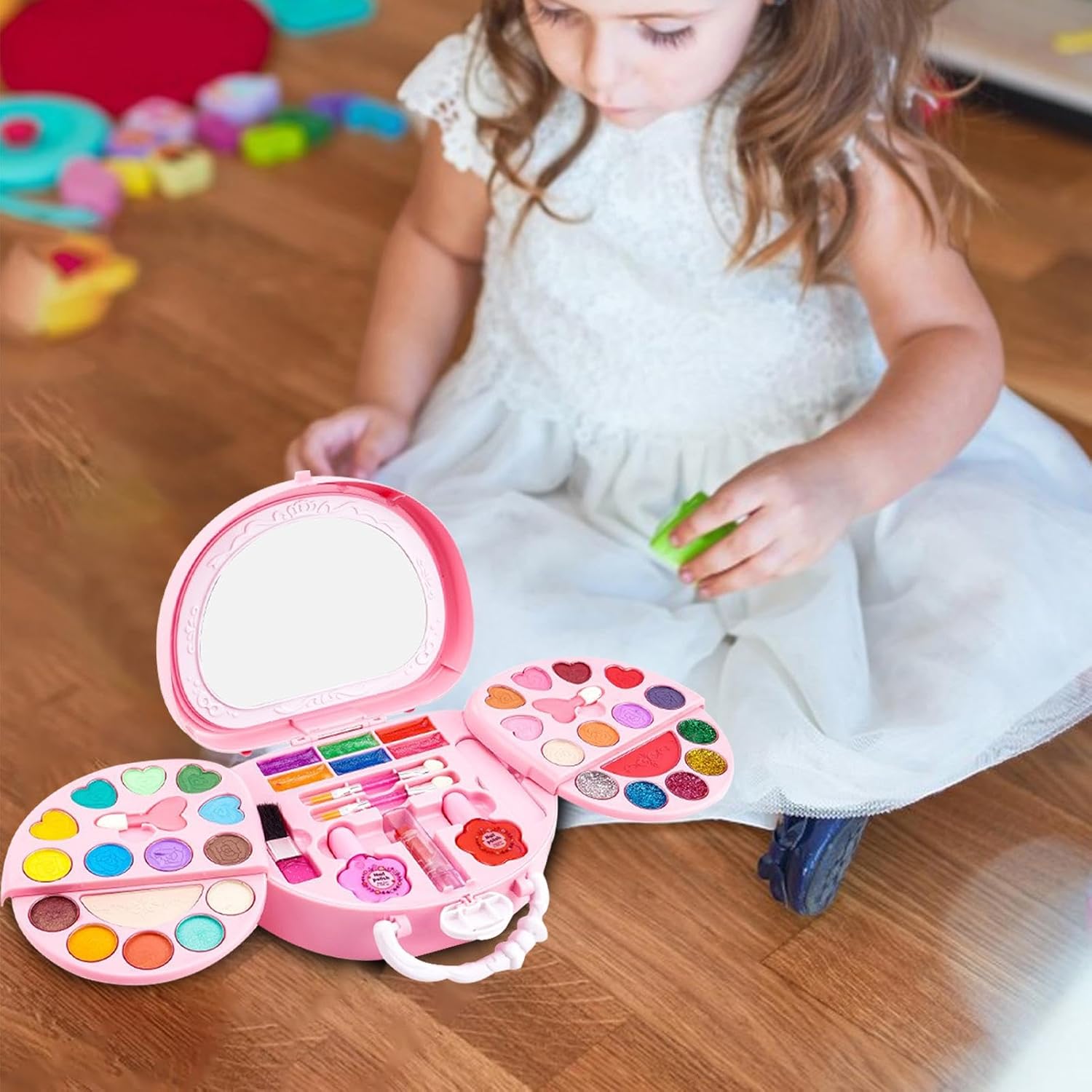 Non irritante e sano: proteggi la pelle sensibile del tuo bambino con il nostro set per il trucco. È realizzato con materiali sicuri e sani ed è progettato per bambini dai 3 anni in su. Lascia che il tuo bambino risplenda senza danneggiare la sua preziosa pelle. Facile da usare: le bambine possono vestirsi in modo sicuro e divertente con il nostro diversificato set di trucchi. Con rossetto, ombretto, fard e altro ancora, questo set offre una varietà di scelte di trucco con facilità di applicazione e pulizia che ispirano creatività e immaginazione Compatto e leggero: progettato per il comfort, il nostro set di trucco per ragazze è leggero e facile da trasportare. Portalo ovunque e gioca con il trucco all'aperto. Perfetto per riunioni di famiglia spontanee o giochi casalinghi con gli amici. Goditi la tua graziosa scatola per cosmetici portatile con funzionalità di facile apertura sempre e ovunque. Migliora l'espressione di sé: lascia che il tuo bambino sviluppi abilità sociali ed espressione personale imitando l'applicazione del trucco per adulti. Questo set è perfetto per giochi di ruolo fantasiosi con principesse e modelle e aumenta la fiducia in se stessi. Gioco interattivo: il set di trucco interattivo per ragazze promuove lo sviluppo cognitivo, insegna concetti base di bellezza e autoespressione divertendosi. Gettare le basi per la futura educazione alla bellezza