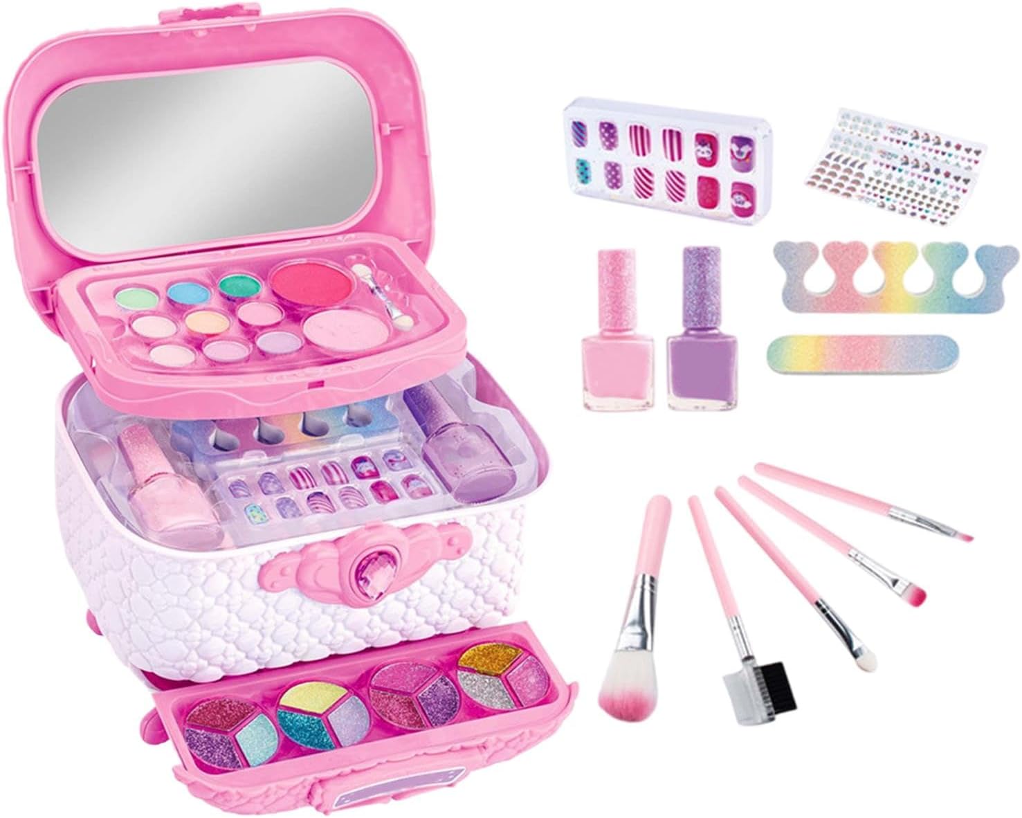 Bellezza e creatività migliorate: questo set di trucchi per bambini offre divertenti giochi interattivi ed è un'attività perfetta per le ragazze di età 4-6-8-10-12. Rafforza le capacità estetiche e migliora la creatività, rendendolo uno strumento eccellente per aumentare la fiducia in se stessi e promuovere l'apprezzamento della bellezza. Custodia per trucchi organizzata: mantieni i cosmetici di tuo figlio organizzati con la soluzione di archiviazione semplificata del nostro set per trucchi per bambini. I suoi molteplici scomparti, la custodia per il trucco organizzata e il design compatto e adatto ai viaggi forniscono una disposizione comoda e intelligente per ritocchi all'aperto o soluzioni rapide di trucco. Selezioni di trucco emozionanti: con lima per unghie, babundant, rossetto in cera, rossetto lucido, polvere pressata colorata e pennello per il trucco, questo set di trucco per bambini offre strumenti di bellezza completi per un look divertente e degno di una principessa Esperienza di trucco Design adatto ai bambini: consenti ai tuoi bambini di divertirsi innocuo con il nostro set di trucco, prodotto secondo standard di sicurezza riconosciuti e componenti lavabili e solubili in acqua. È delicato sulla pelle dei bambini e sicuro da usare. Inoltre, è facile da pulire, offrendo ai genitori tutto il tempo necessario per far giocare i propri figli. Opzioni regalo ideali: con questo set di trucchi per principianti, puoi trascorrere ore di gioco fantasioso. È ideale per spettacoli e feste e un regalo perfetto per ragazze di tutte le età. Goditi del tempo prezioso tra genitori e figli creando divertenti look per il trucco e stimolando la creatività attraverso attività di gioco di ruolo interattive