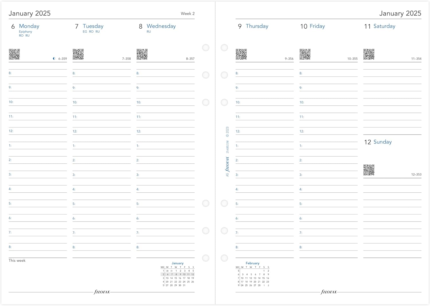 Ricarica Filofax per agenda 2025 A5 Settimana su due pagine con formato appuntamento Dimensioni carta: 148 x 210 mm Scarica l'app gratuita Filofax Reminder Utilizza i codici QR per visualizzare la tua agenda sul tuo telefono