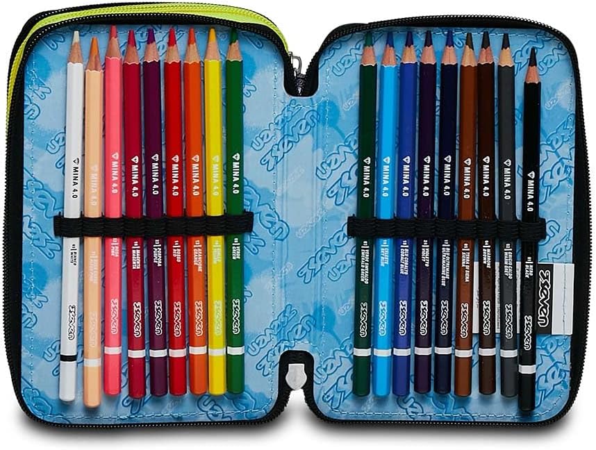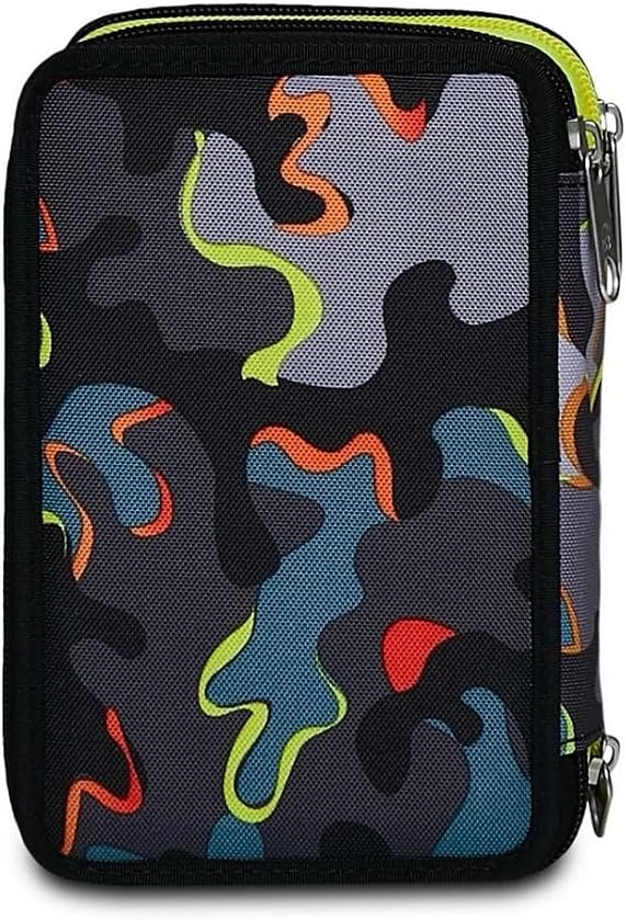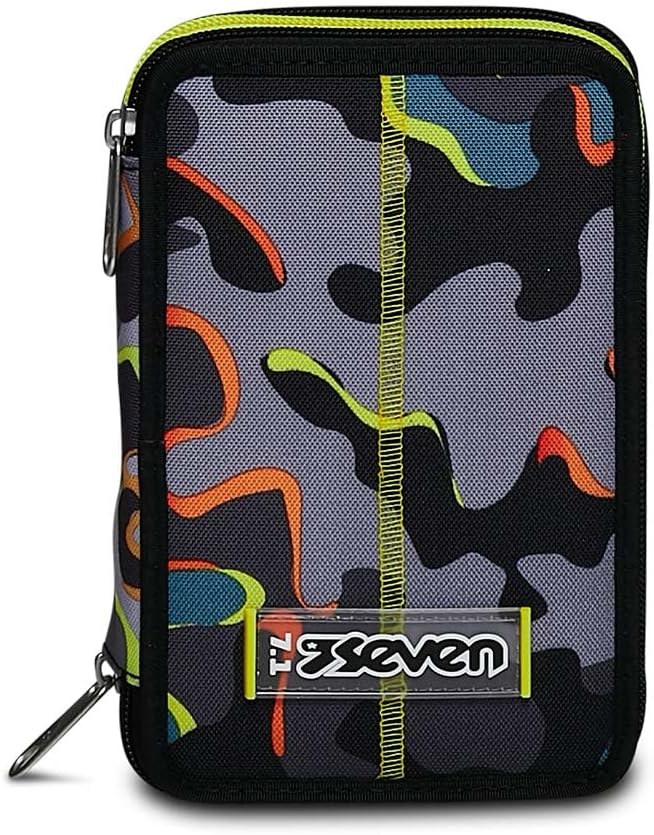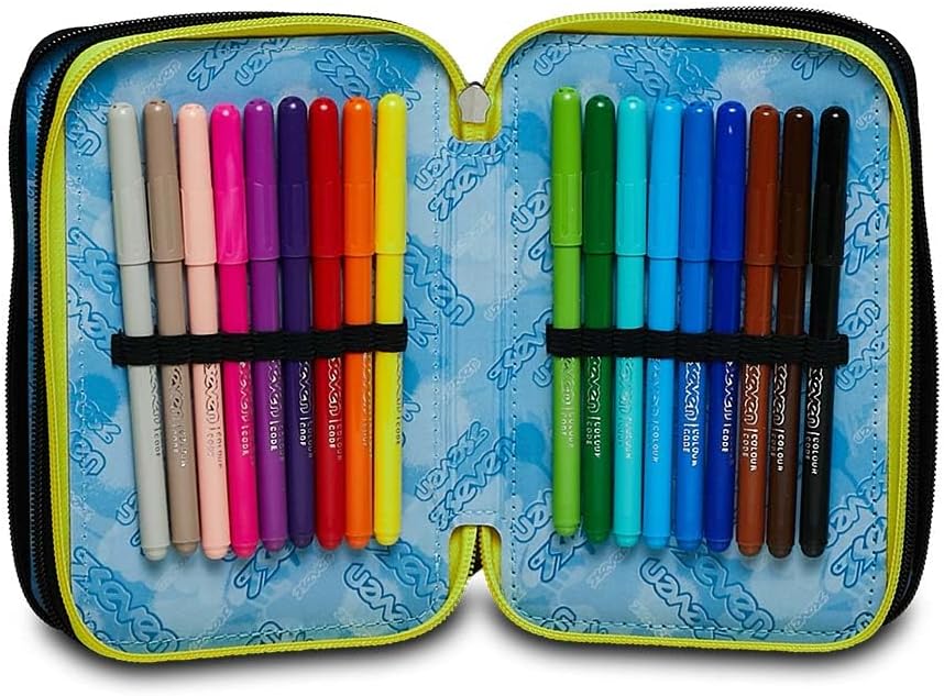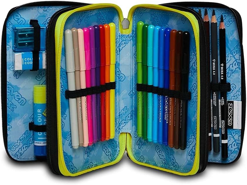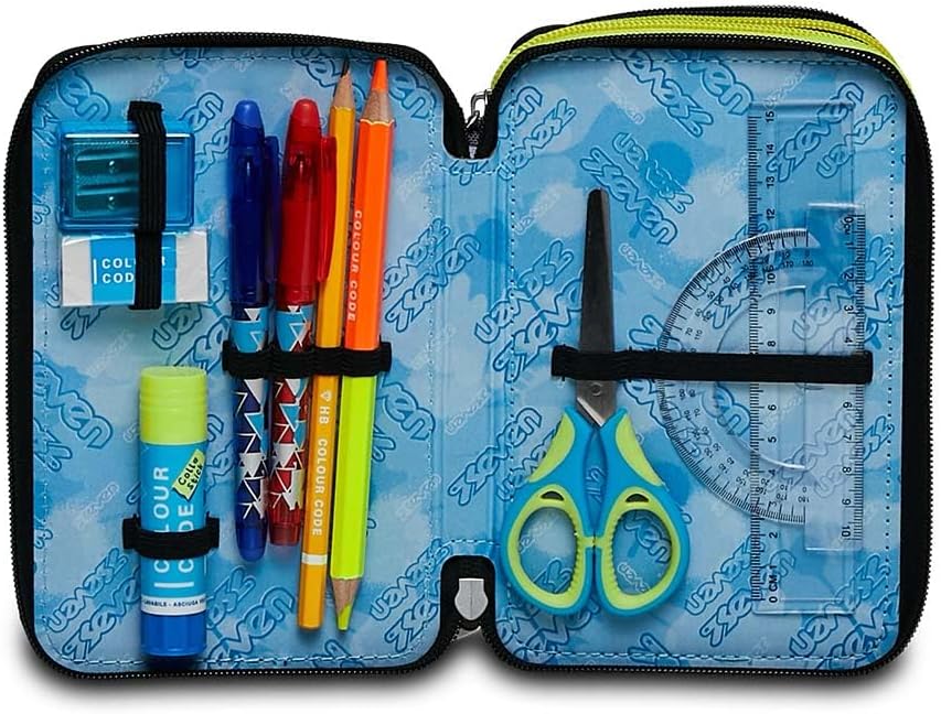 DIMENSIONI: 12,5 x 20 x 7 cm ALTRE CARATTERISTICHE: CONTENUTO 46 PEZZI: 18 Pastelli a colori mina 4.0 Seven Colour Code, 18 Pennarelli lavabili Seven Colour Code, 1 Penna cancellabile blu, 1 Penna cancellabile rossa, 1 Matitone fluo bicolor giallo e arancio Colour Code, 1 Matita grafite Colour Code, 1 Gomma Colour Code, 1 Temperino barilotto a 2 fori, 1 Colla stick Colour Code, 1 Righello trasparente, 1 Goniometro trasparente, 1 Forbice in metallo con maniglia in plastica. TESSUTO: Poliestere TASCHE: Triplo scomparto