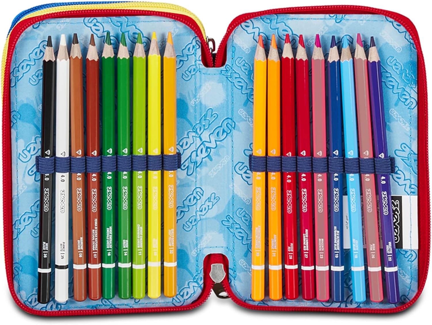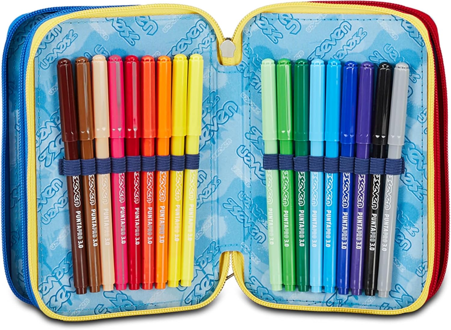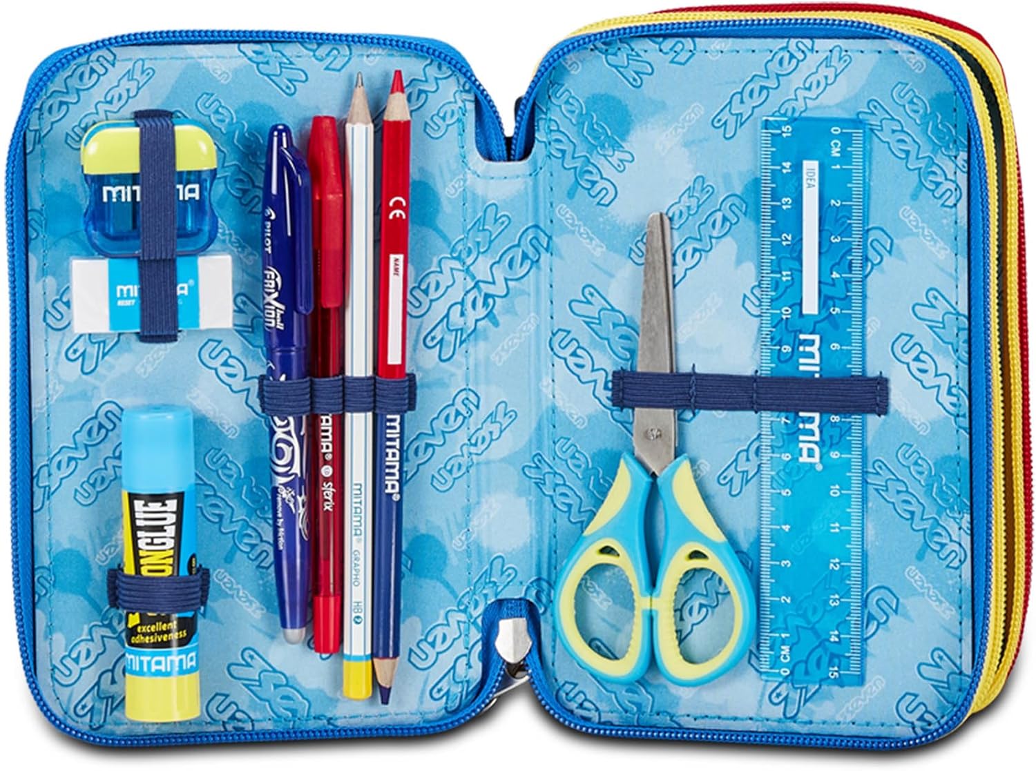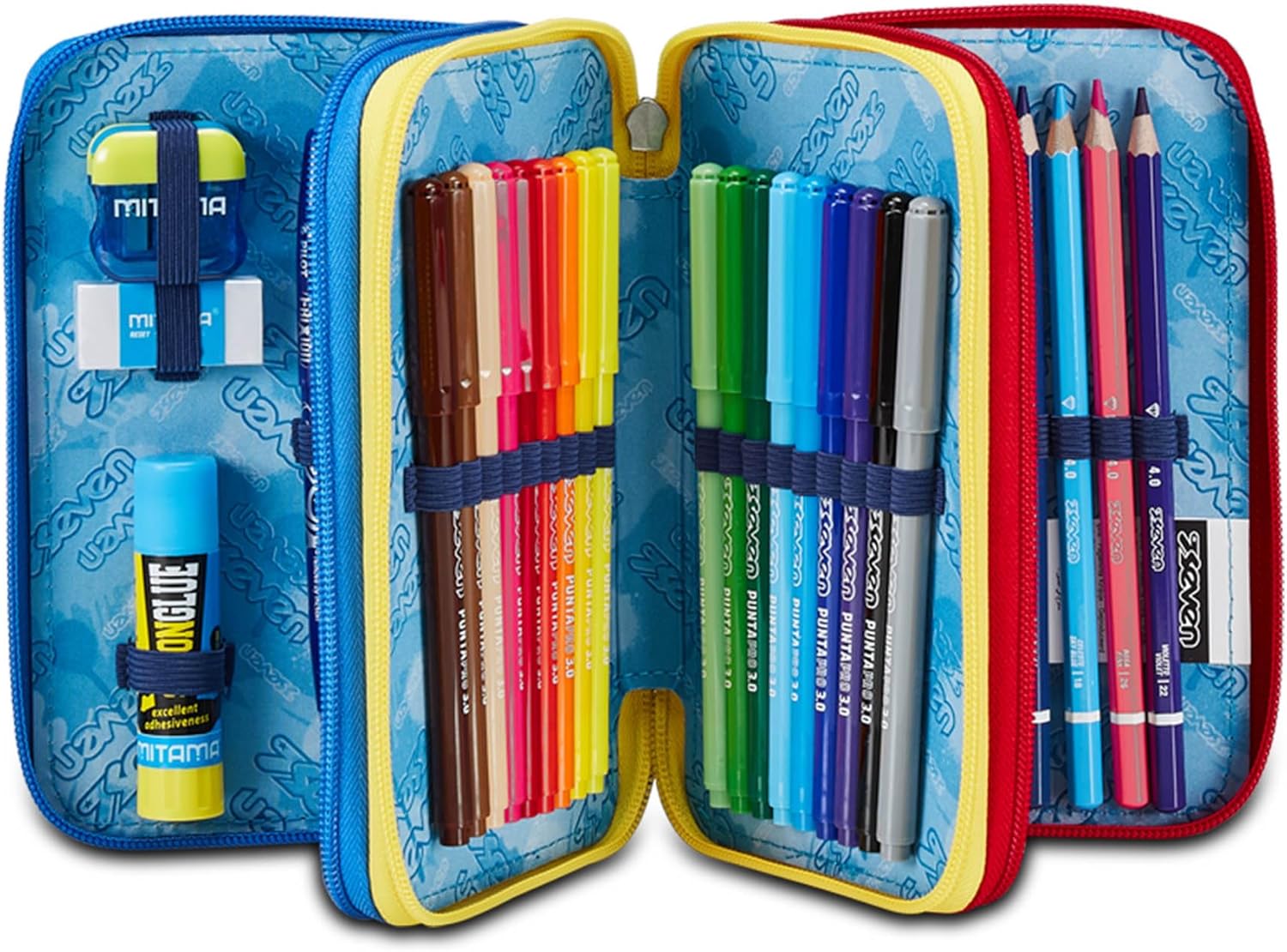 CONTENUTO 45 PEZZI: 1 Penna cancellabile blu, 1 Penna cancellabile rossa, 18 Pastelli a colori, 18 Pennarelli, 1 Matita HB, 1 Colla stick, 1 Gomma, 1 Temperino barilotto a 2 fori, 1 Righello, 1 Pastello Tondo 4.0 Bicolor, 1 Paio di Forbici in metallo