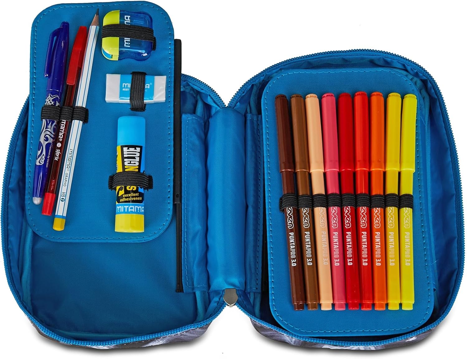 Dimensioni: 13,5 x 21 x 6,5 cm Tasca: Tasca interna per cancelleria Tessuto: Poliestere Altre caratteristiche: Apertura singola tramite zip, plance amovibili, elastici interni per cancelleria. CONTENUTO 45 PEZZI: 1 penna cancellabile blu, 1 penna sfera rossa, 18 pastelli a colori 4.0 esagonali, 18 pennarelli superlavabili punta 3.0, 1 matita grafite esagonale HB, 1 colla gialla azzurra, 1 gomma bianca con cartoncino stampato, 1 temperino barilotto 2 fori, 1 righello trasparente, 1 matita bicolor rosso/blu, 1 paio di forbici in metallo L'astuccio Seven Speed Case è dotato di una comoda apertura tramite un’unica zip e di tutto il materiale necessario per affrontare al meglio la tua giornata di scuola. Lo puoi montare e smontare a tuo piacere. All’interno, ha plance con elastici porta penne e matite, che puoi rimuovere del tutto, permettendo in questo modo il lavaggio dell’astuccio. Comodo, pratico e versatile, non ti resta che abbinare il tuo nuovo astuccio Speed Case a uno zaino o a un trolley Seven.