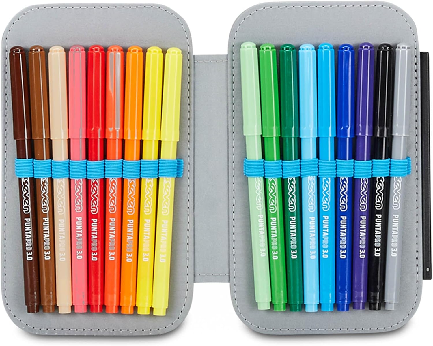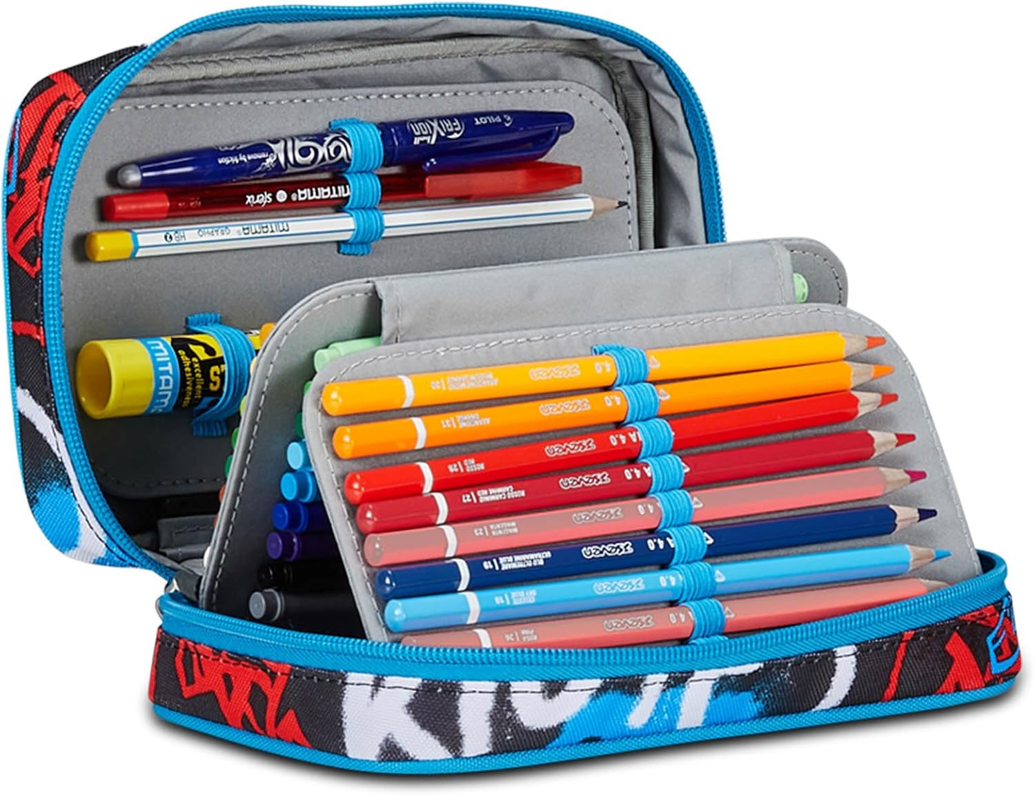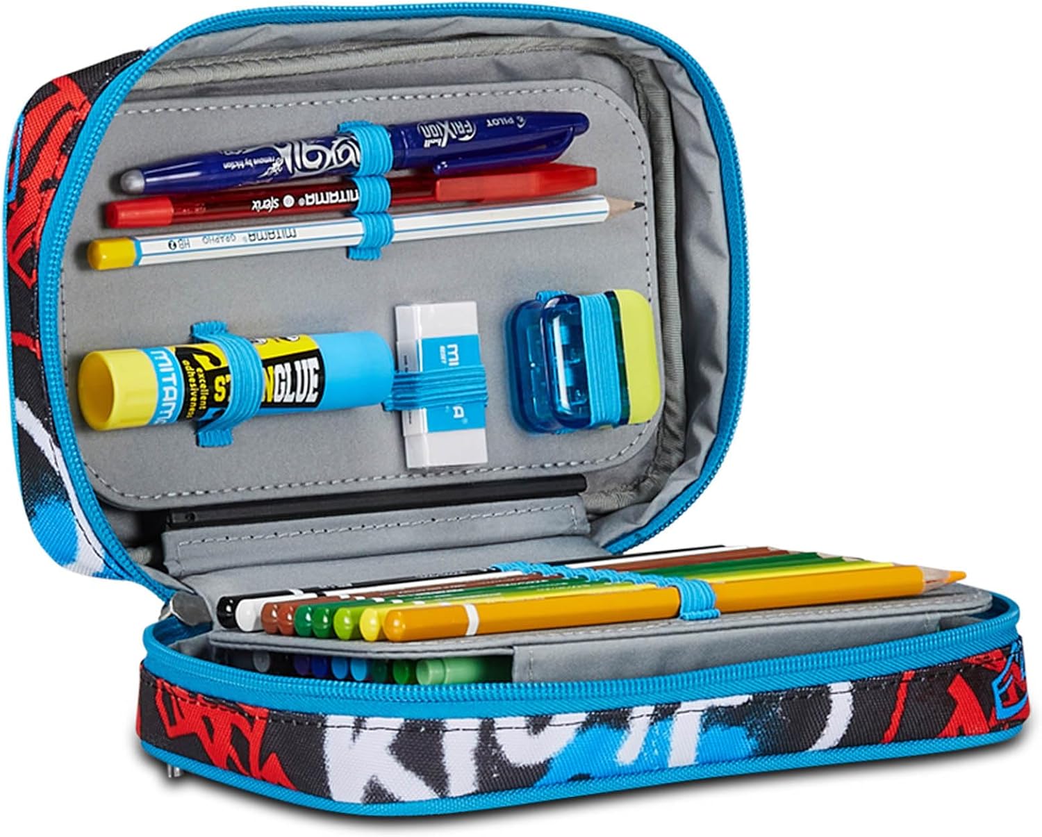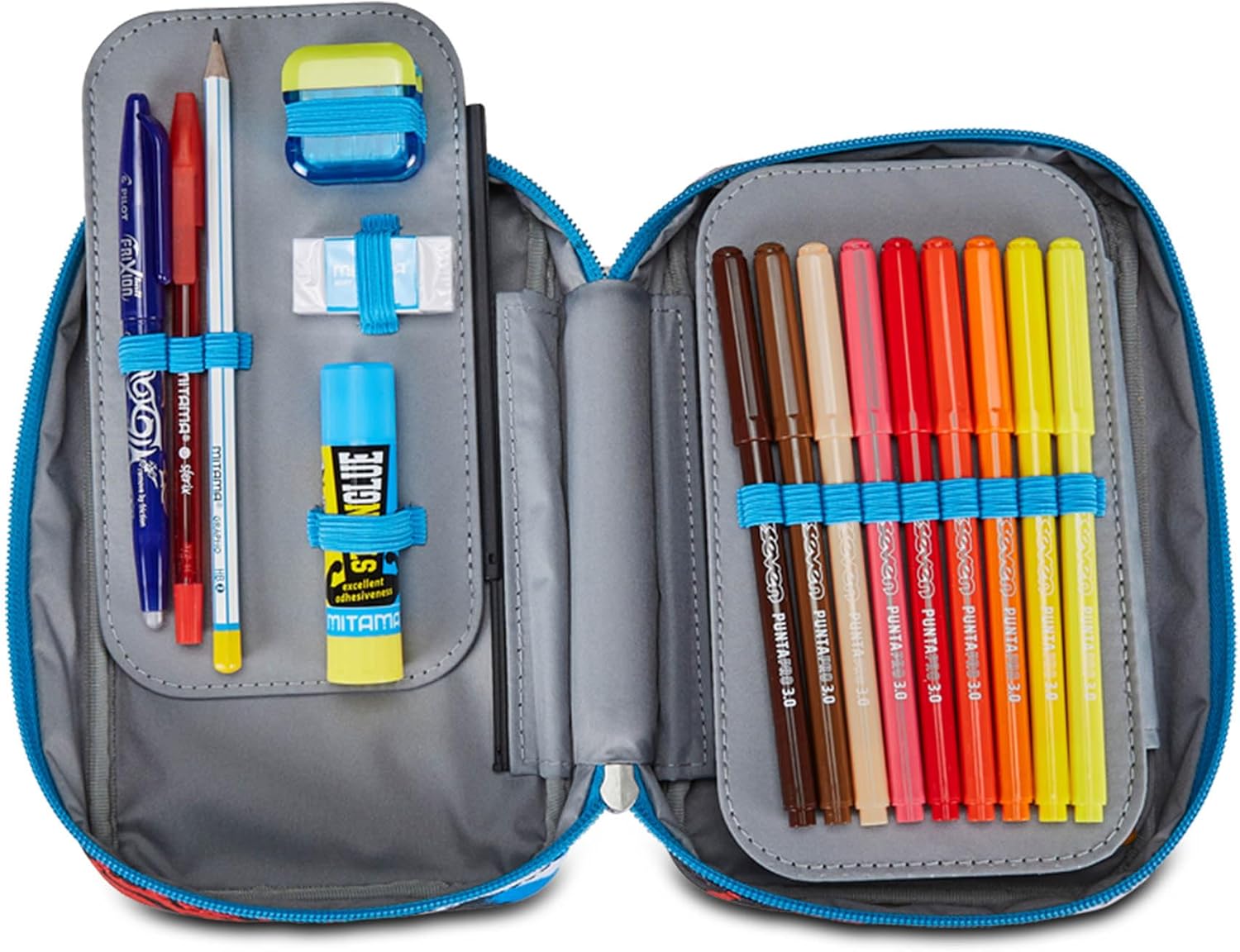 DIMENSIONI: 13,5 x 21 x 6 ,5 cm ALTRE CARATTERISTICHE: Apertura singola, plance amovibili ed elastici interni per cancelleria. CONTENUTO 44 PEZZI: 18 Pastelli a colori, 18 Pennarelli, 1 Penna cancellabile blu, 1 Penna a sfera rossa, 1 Matita HB, 1 Gomma, 1 Temperino barilotto a 2 fori, 1 Colla stick, 1 Righello, 1 Paio di Forbici in metallo TESSUTO: Poliestere