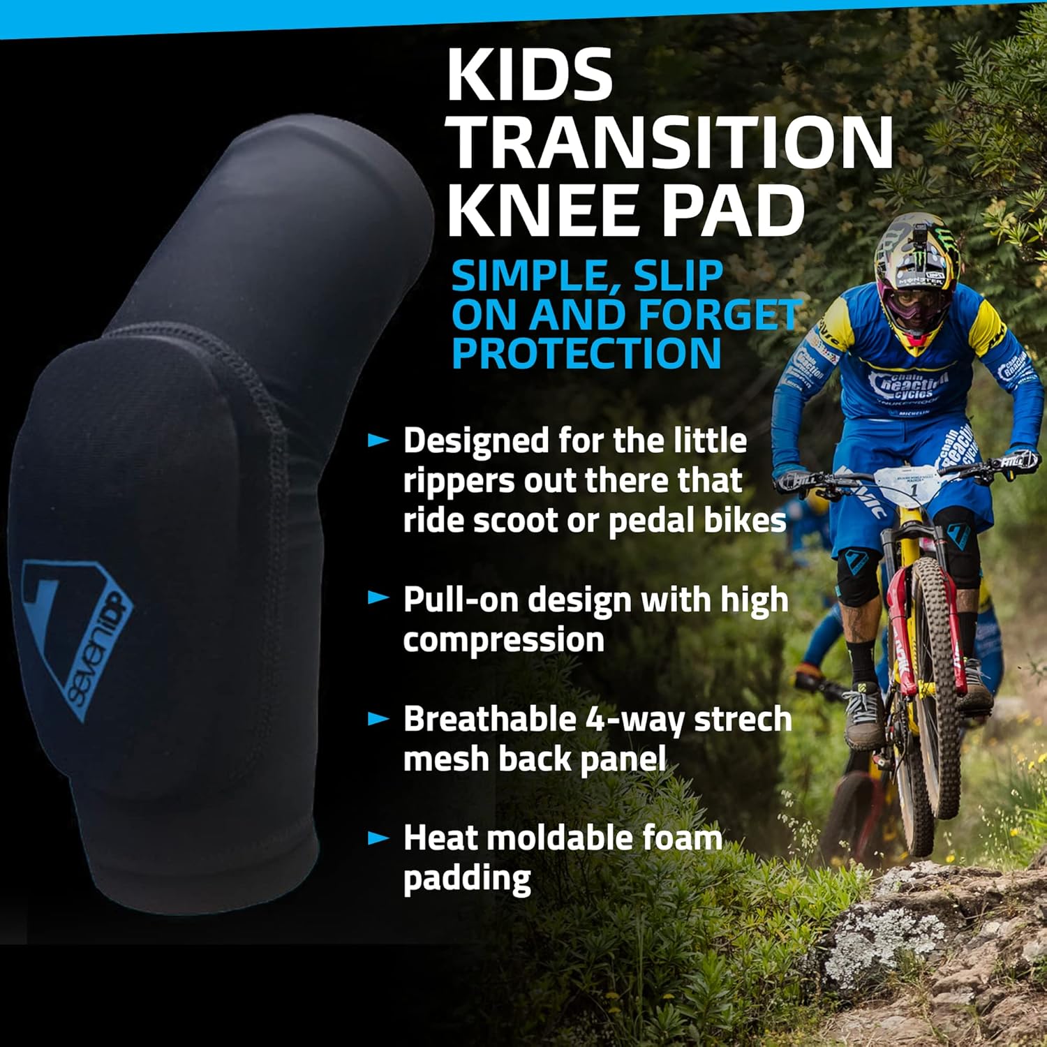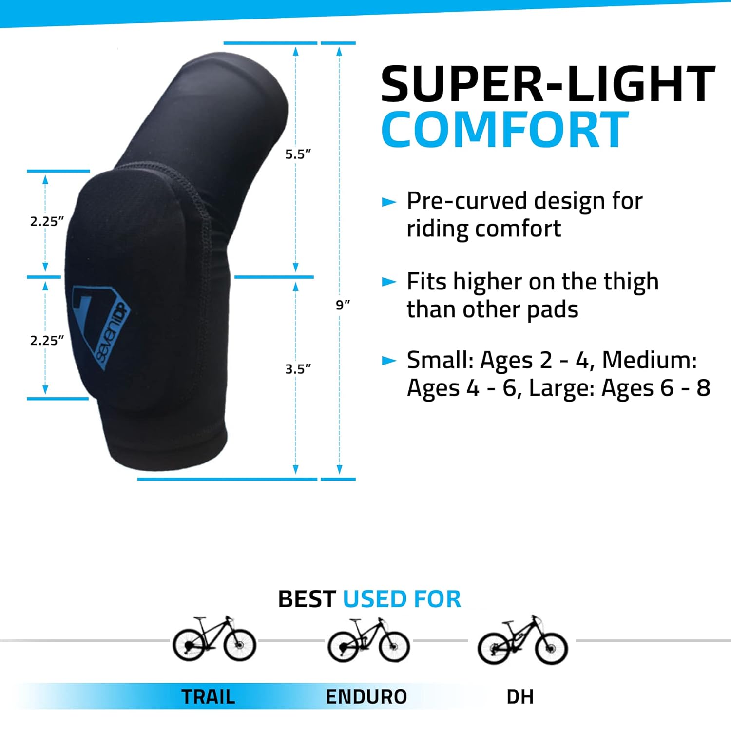 Progettate per i piccoli rider che usano monopattini o biciclette a pedali Taglie: Small (2 – 4 anni), Medium (4 – 6 anni), Large (6 – 8 anni) Design a calzata con vestibilità a compressione elevata (senza cinturini) Imbottitura in schiuma termoformabile Vestibilità più alta sulla coscia rispetto ad altre ginocchiere Design pre-curvato per un comfort ottimale durante la guida