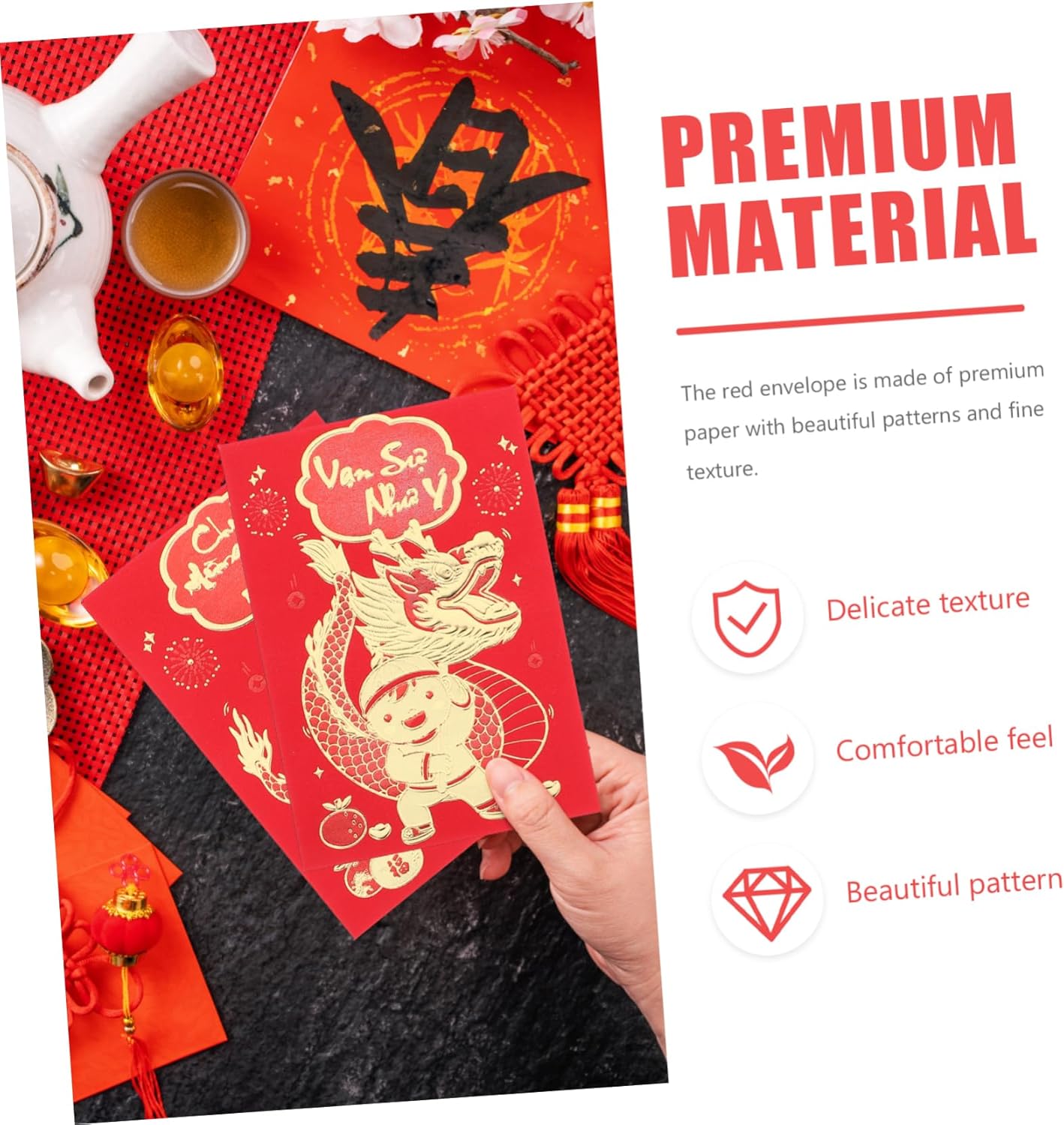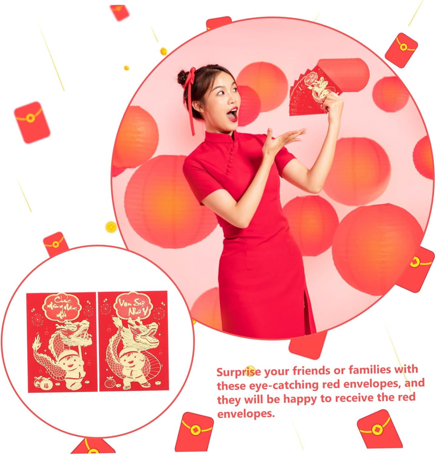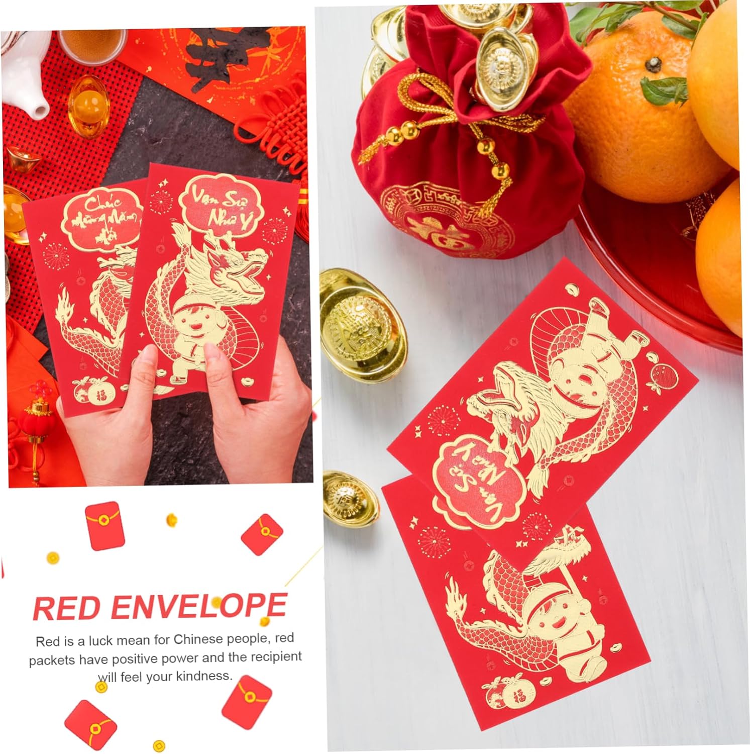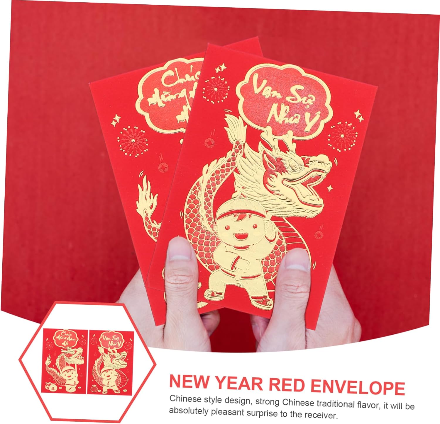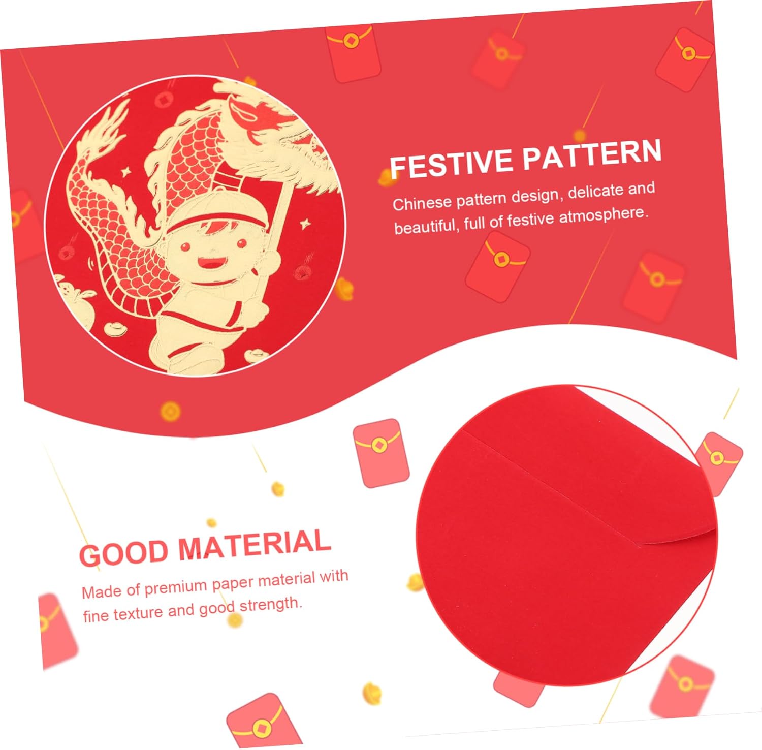 Busta cinese: i modelli delle buste rosse aggiungeranno un'atmosfera festosa, per garantirne la popolarità, buste per denaro contante Capodanno cinese fortunato: metti un po' di soldi nelle buste rosse come per il capodanno, il compleanno, il shower, ecc., busta rossa Busta di capodanno: sorprendi i tuoi amici o familiari con queste accattivanti buste rosse, saranno felici di ricevere le buste rosse, busta rossa del capodanno lunare Rosso cinese: presenta delicati motivi stampati, le benedizioni sono chiaramente visibili, e pratiche per l'uso del capodanno, buste rosse per il capodanno lunare Cinesi rosse: queste buste rosse per la festa di rappresentano anche i desideri degli anziani per le generazioni più giovani, busta rossa cinese