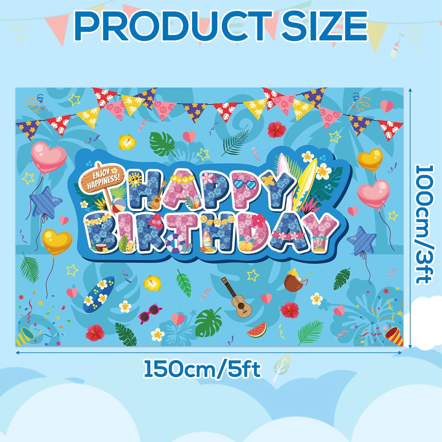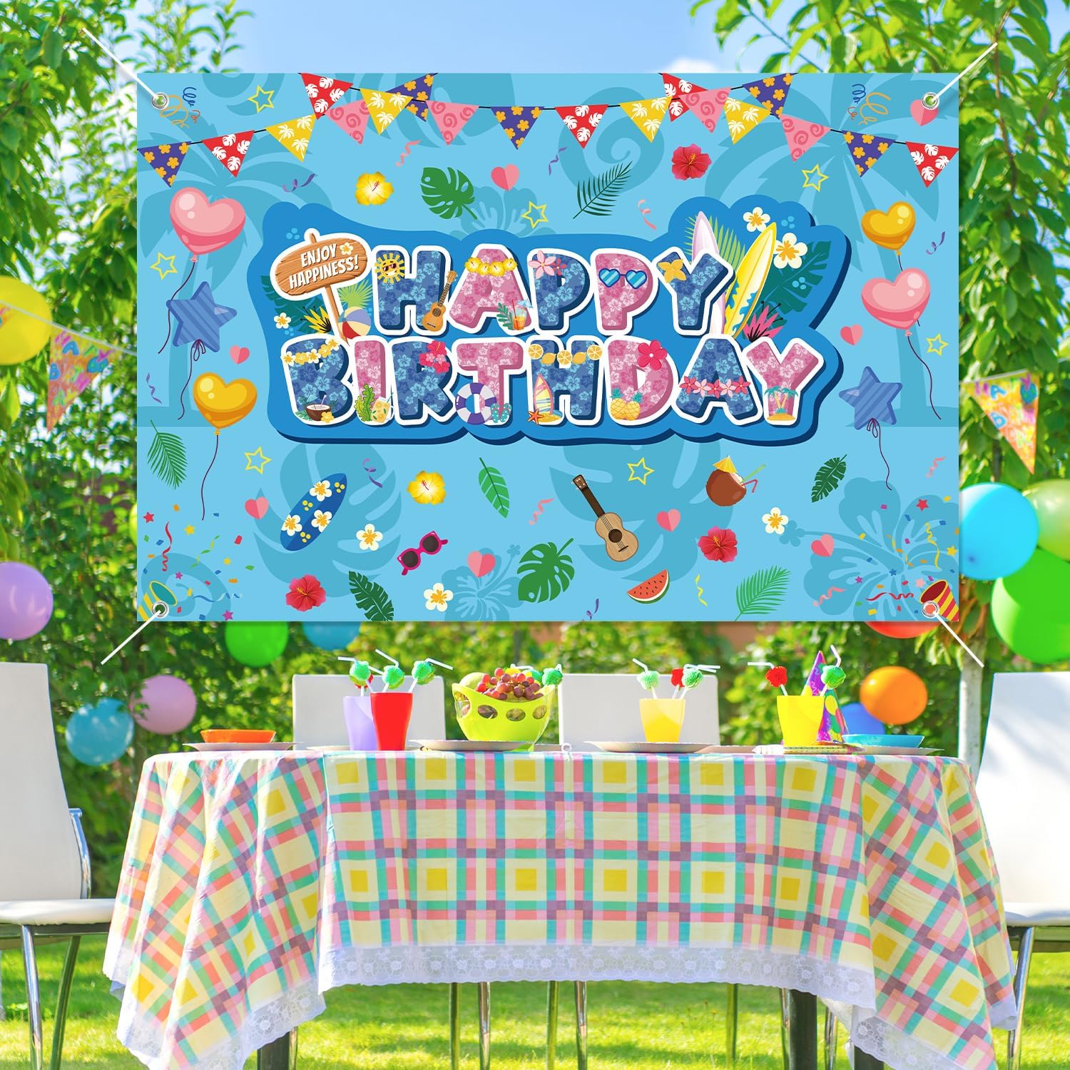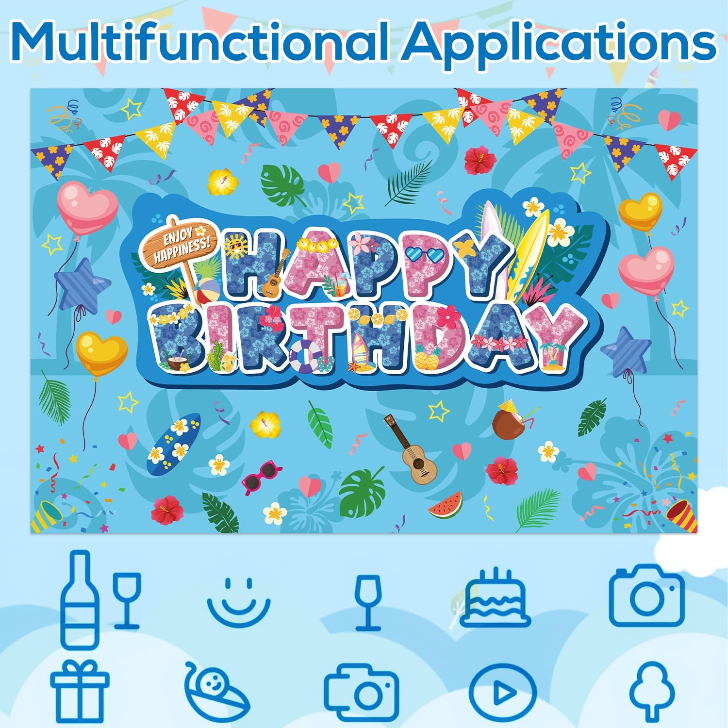 Contenuto della confezione: riceverai 1 kulden Happy Birthday e misura circa 150 x 100 cm, perfetto per l'esposizione a parete dietro i tavoli da dessert, gli ingressi delle feste o come vivace punto focale per feste di compleanno a tema. Materiale premium: realizzato in tessuto di poliestere resistente e riutilizzabile, questo sfondo di compleanno è morbido, leggero, durevole, resistente allo sbiadimento e non facile da strappare o indossare. Puoi usarlo per molto tempo. Stile divertente: presenta un colorato messaggio "Buon compleanno" con stampe floreali tropicali, tavole da surf, frutta, chitarre, palloncini a forma di cuore, occhiali da sole, ecc. Per aggiungere un'atmosfera giocosa da spiaggia alla tua festa di compleanno. Facile da usare e da riporre: lo sfondo del compleanno presenta un design preconfezionato per appenderlo senza problemi con le corde. Puoi appenderlo ovunque tu voglia. Leggero e pieghevole, è facile da trasportare, riporre e riutilizzare. Ampio utilizzo: lo sfondo del compleanno aggiunge vibrazioni di festa tropicale e accenti di stile isolano a qualsiasi festa di compleanno, ideale per feste estive, feste di compleanno, feste con personaggi dei cartoni animati o luau.