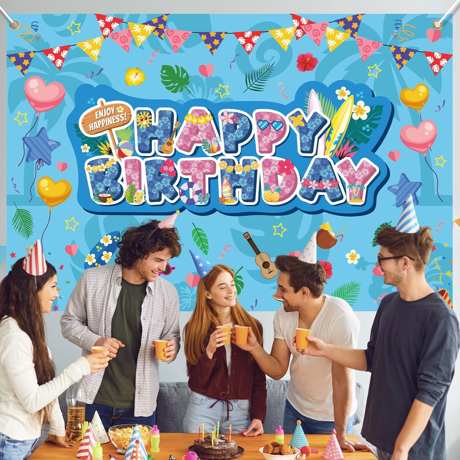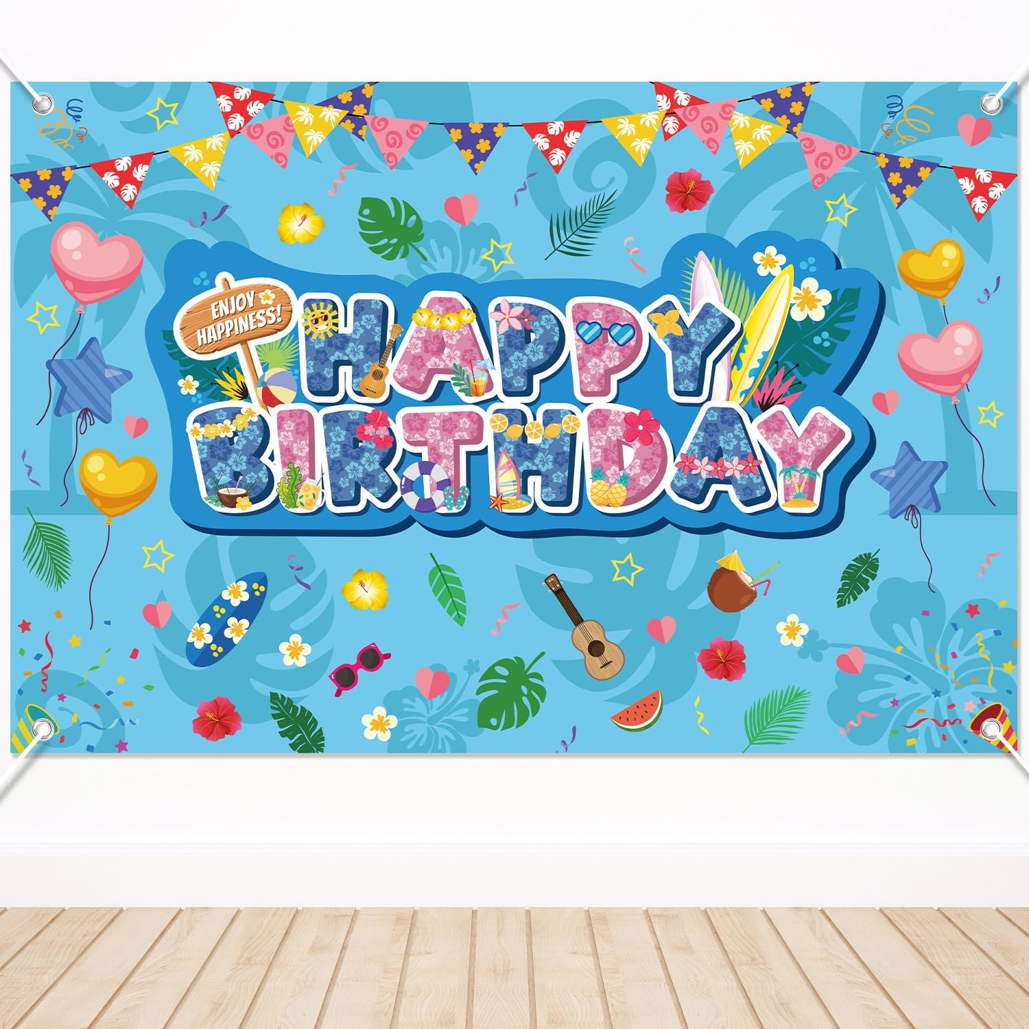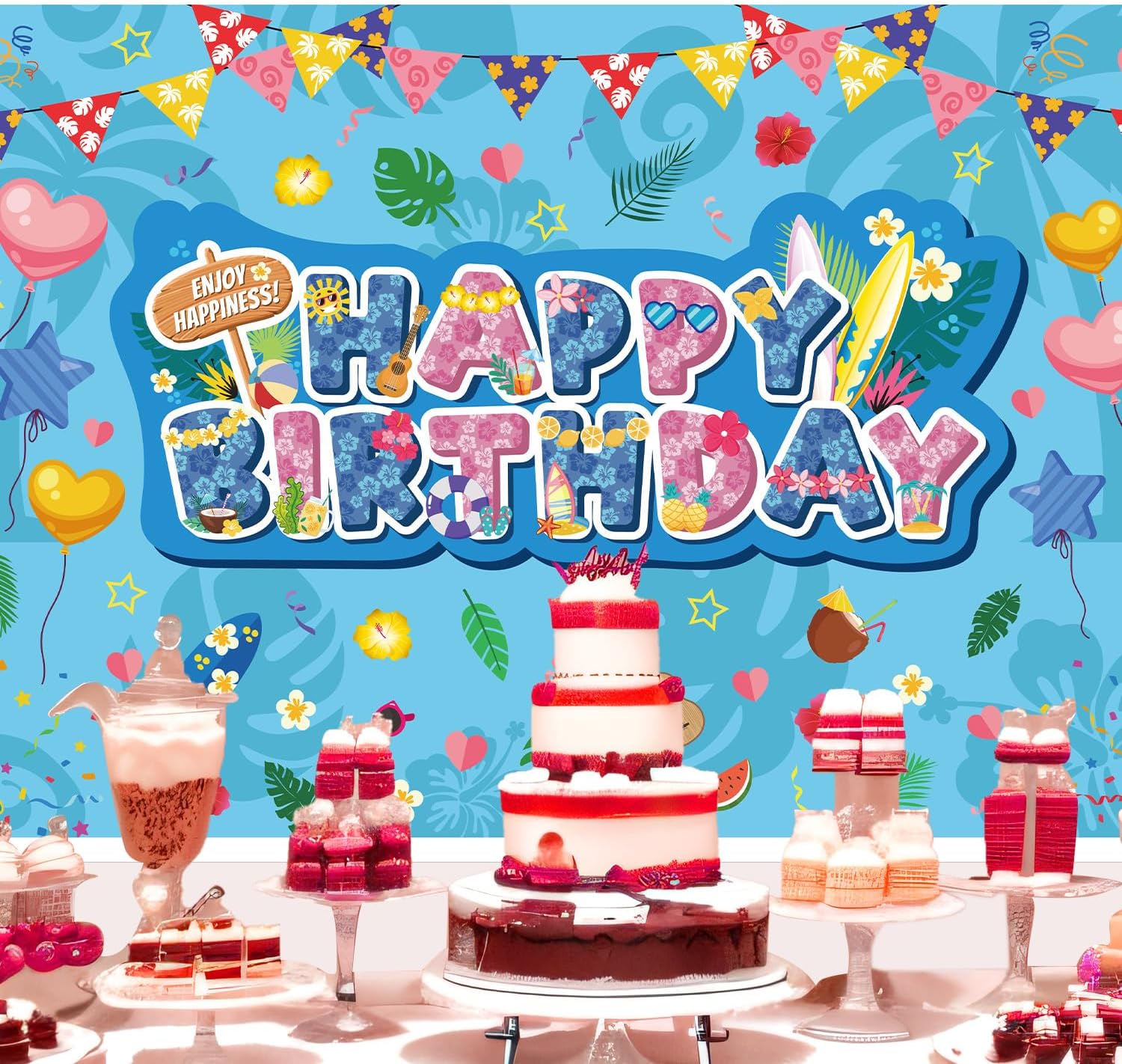 Contenuto della confezione: riceverai 1 kulden Happy Birthday e misura circa 150 x 100 cm, perfetto per l'esposizione a parete dietro i tavoli da dessert, gli ingressi delle feste o come vivace punto focale per feste di compleanno a tema. Materiale premium: realizzato in tessuto di poliestere resistente e riutilizzabile, questo sfondo di compleanno è morbido, leggero, durevole, resistente allo sbiadimento e non facile da strappare o indossare. Puoi usarlo per molto tempo. Stile divertente: presenta un colorato messaggio "Buon compleanno" con stampe floreali tropicali, tavole da surf, frutta, chitarre, palloncini a forma di cuore, occhiali da sole, ecc. Per aggiungere un'atmosfera giocosa da spiaggia alla tua festa di compleanno. Facile da usare e da riporre: lo sfondo del compleanno presenta un design preconfezionato per appenderlo senza problemi con le corde. Puoi appenderlo ovunque tu voglia. Leggero e pieghevole, è facile da trasportare, riporre e riutilizzare. Ampio utilizzo: lo sfondo del compleanno aggiunge vibrazioni di festa tropicale e accenti di stile isolano a qualsiasi festa di compleanno, ideale per feste estive, feste di compleanno, feste con personaggi dei cartoni animati o luau.