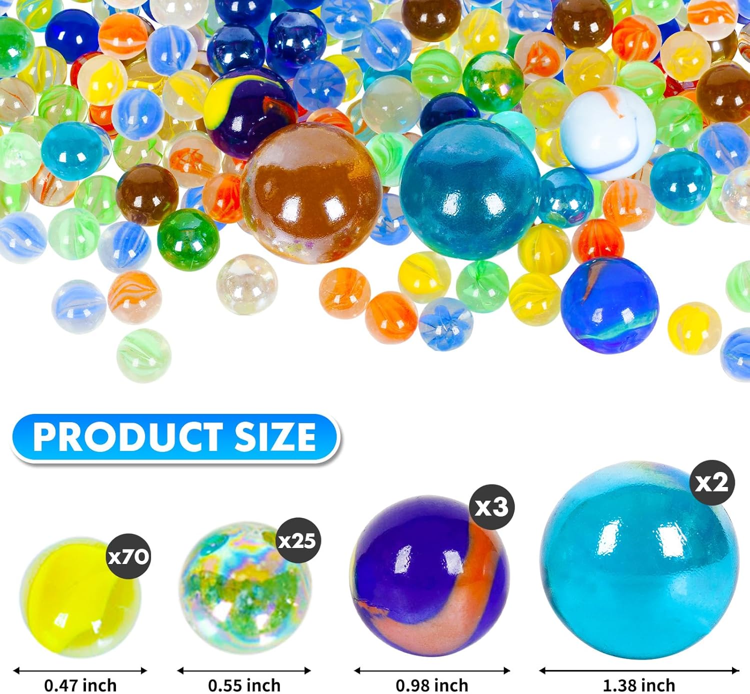 100 pezzi in 4 diverse dimensioni: 2 pezzi x 3,5 cm; 3 pezzi x 2,5 cm, 25 pezzi x 1,4 cm; 70 pezzi x 1,2 cm. Varie dimensioni per scopi diversi: potrebbe essere utilizzato per artigianato e progetti artistici, giochi da tavolo, decorazione da giardino per scrivania, educazione scientifica, decorazione di fontane, decorazioni per acquari, giochi sensoriali, anche come dama cinese, strumento ausiliario matematico, ecc. Design sofisticato: tutte le nostre biglie sono realizzate in vetro di alta qualità. Superficie liscia. Grande elasticità. Durevole e non facile da rompere. Colori casuali. Nota: ognuna delle nostre biglie di vetro è meticolosamente realizzata a mano, aggiungendo un tocco unico a ogni pezzo. Tuttavia, a causa della natura delicata del vetro e dei rigori delle spedizioni a lunga distanza, non è raro che alcune biglie arrivino con piccole scheggiature o crepe sulla loro superficie. Queste imperfezioni sono considerate normali e non influenzano la funzione primaria delle biglie. Ci impegniamo a fornire un servizio clienti eccezionale e saremo più che felici di assisterti con una pronta risoluzione. La vostra soddisfazione è la nostra massima priorità.
