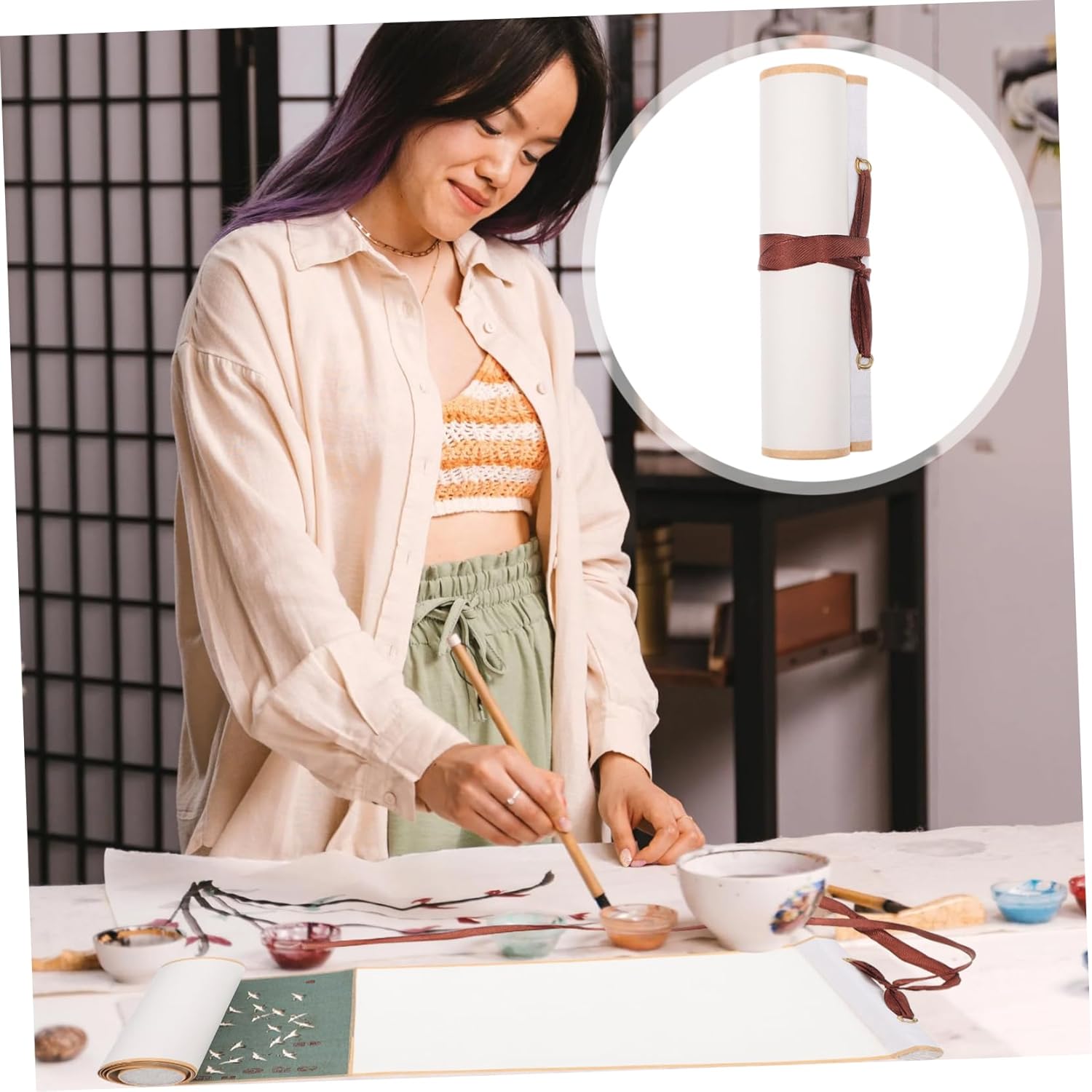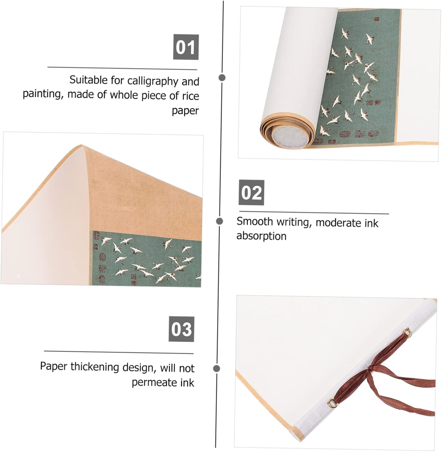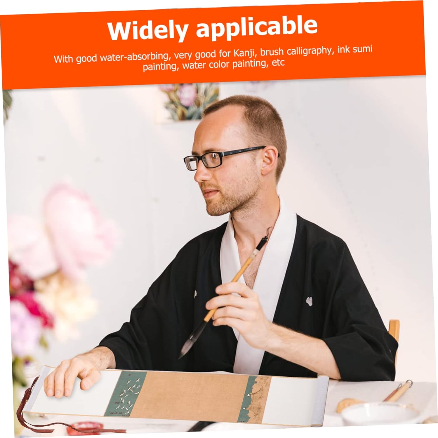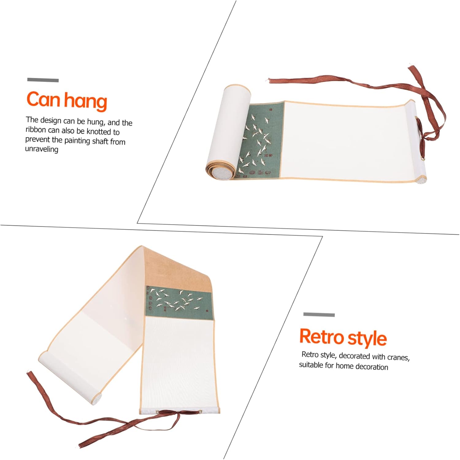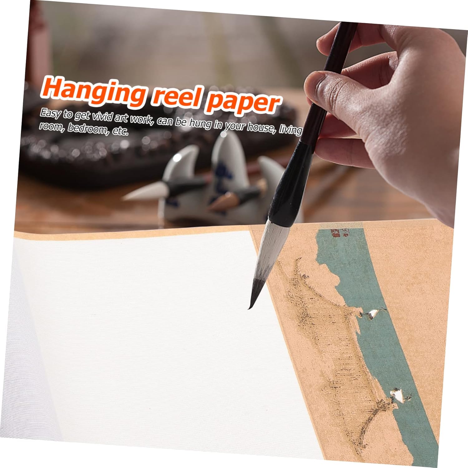 Decorazione cinese: puoi dipingere o scrivere direttamente sulla zona centrale in carta di riso a tinta unita. Parete a scorrimento giapponese: con un buon assorbimento d'acqua, ottima per kanji, calligrafia a pennello, pittura con inchiostro sumi, pittura ad acquerello, ecc. Carta per pergamene per calligrafia: questo prodotto può offrirti un'eccellente esperienza di scrittura e disegno. Carta da disegno per bambini: la carta per pergamene cinese è ottima anche da appendere al muro dopo aver finito, come carta decorativa per la casa e l'ufficio. Rotolo sospeso vuoto: adatto per la creazione di calligrafia come pennello per scrivere in stampatello minuscolo e calligrafia corrente.
