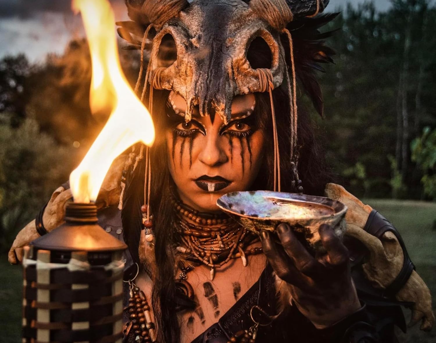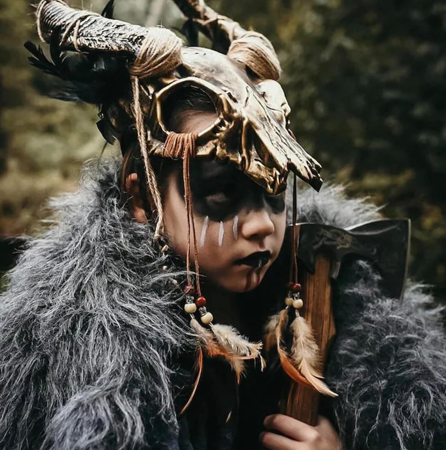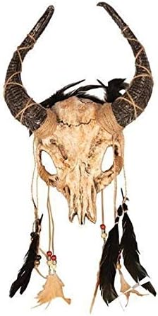 Gioielli per la testa a forma di teschio con lunghe corna. Il teschio è riccamente decorato con nastri di iuta, cordoncini in finta pelle, perline di legno e plastica, oltre a piume di diversi colori. Ampie fasce elastiche per un sostegno ottimale sulla testa. Accessorio perfetto per costumi voodoo, sciamani, guerrieri, barbarini, barbarini. Per maggiore comodità, dovresti infilare la schiuma all'interno del cranio poiché è piuttosto dura. Non è più necessario indossare una parrucca. Colori disponibili: Nero/oro. Argento/nero. Beige/marrone. I colori possono variare dall'immagine mostrata. Materiale: Maschera di perle 1: 100% plastica. Pelle sintetica: 100% poliestere. Spago: 100% iuta. Perle 2: 100% legno. Piume. Comprende elementi non tessili di origine animale. Bolla di consegna: Parrucca, catena e top non fanno parte dell'offerta. Ma nel nostro negozio troverai molti accessori e costumi a tema voodoo.