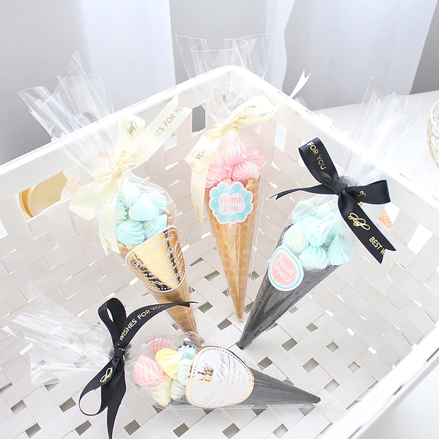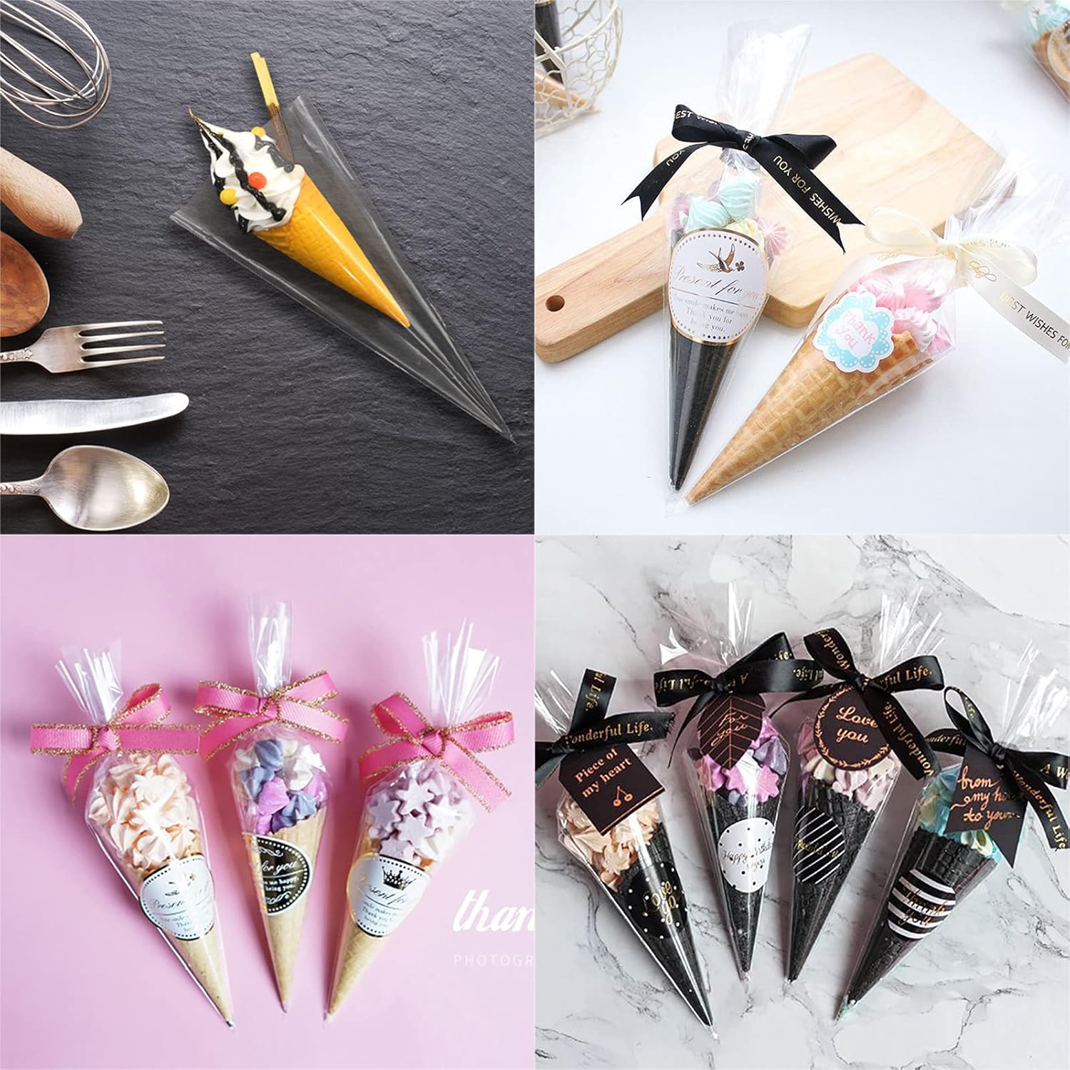 Contiene 100 sacchetti conici trasparenti, la dimensione del sacchetto è 30 x 16 cm, e 100 lacci dorati, la lunghezza è 10 cm, i lacci servono per chiudere il sacchetto conico. Il sacchetto di caramelle a forma di cono è realizzato in materiale OPP atossico e sicuro. Usa questi sacchetti trasparenti a forma di cono per conservare gli alimenti e mantenerli puliti e freschi. La borsa è atossica, insapore, ecologica e pienamente conforme alla sicurezza alimentare. Il sacchetto trasparente a forma di cono permette di controllare il cibo all'interno senza aprire il sacchetto o sporcare il cibo. Il sacchetto per caramelle conico può contenere caramelle, popcorn, marshmallow, cioccolatini, snack, piccoli dessert, biscotti, panini, mandorle, ecc. Può proteggere bene il tuo cibo. Puoi decorare questi coni trasparenti con paillettes, coriandoli colorati, fiori secchi, carta glitterata, ecc. È molto adatto per matrimoni, feste, compleanni, Natale, Ringraziamento, Halloween e può essere utilizzato per conservare caramelle e piccoli regali.