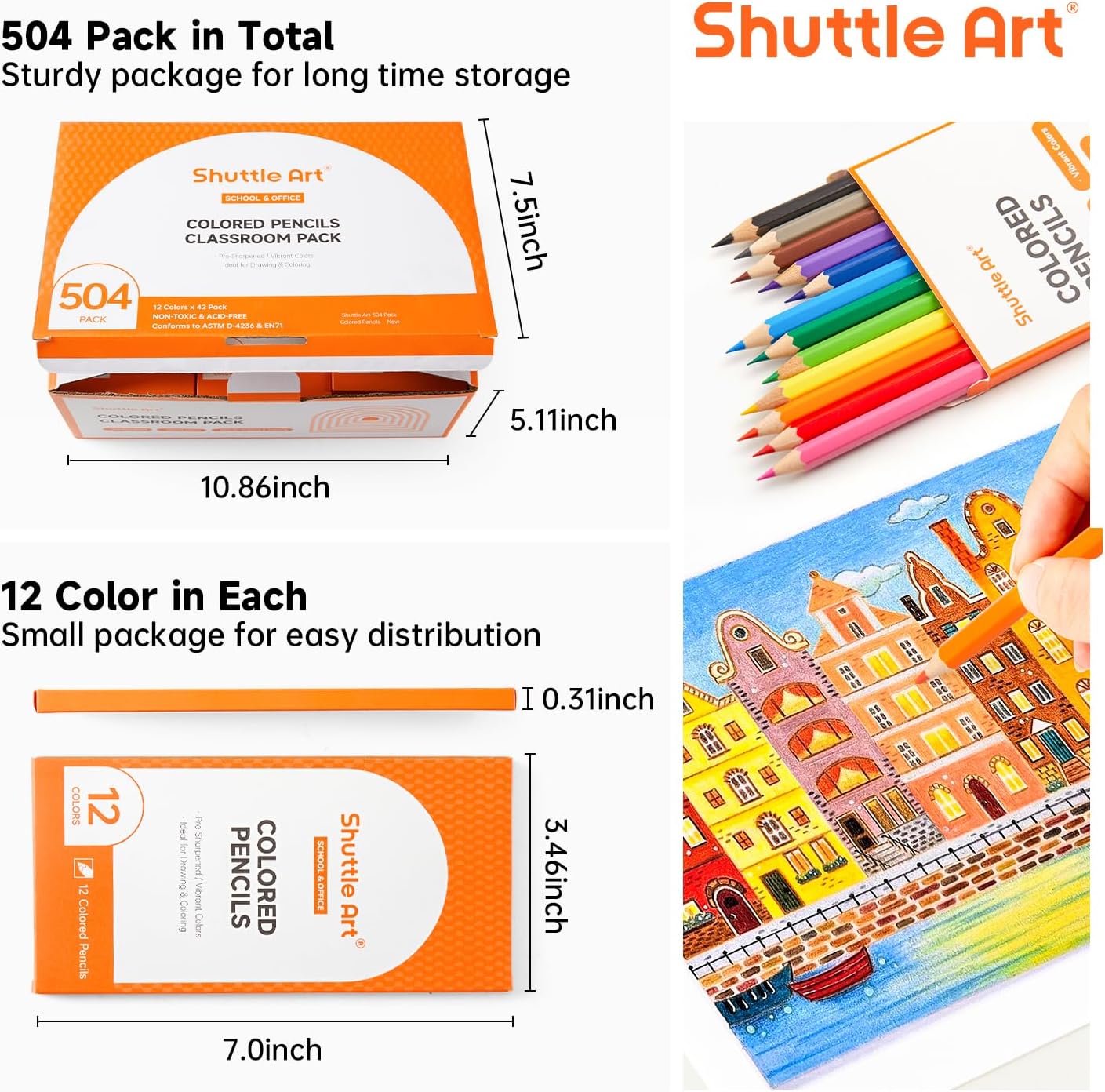 SET DA 504 PEZZI: Shuttle Art 504 matite colorate sono disponibili in 42 confezioni da 12 colori assortiti: nero, grigio, blu, blu ceruleo, verde primavera, verde foresta, marrone, giallo canarino, arancione, viola, rosa e rosso. Sono colori classici e sono ampiamente utilizzati in aule, asili, lezioni d'arte e case. COLORI RICCHI E VIVACI: le pastelli professionali riccamente pigmentate portano colori vivaci e texture cremose per bambini e adulti, rendendo il viaggio artistico facile e divertente. I prodotti di qualità garantiscono una buona esperienza. PRE-AFFILATE: le matite colorate pre-affilate consentono di risparmiare tempo di preparazione e consentono ai bambini di iniziare a disegnare e colorare subito. RESISTENTE ALLA ROTTURA E DUREVOLE: realizzato in legno di tiglio di alta qualità che affila facilmente e costantemente senza rotture. Il nucleo di piombo spesso e di alta qualità previene frustranti rotture durante l'uso generale e l'affilatura, abbastanza resistente per un uso prolungato. PRODOTTO E SERVIZIO: conforme agli standard ASTM-D4236 e EN71, sicuro e atossico, ideale per bambini dai 3 anni in su. La vostra soddisfazione è la nostra massima priorità, si prega di essere certi di acquistare i nostri prodotti. Se non siete soddisfatto con i nostri prodotti o avete domande, non esitate a contattarci in qualsiasi momento.