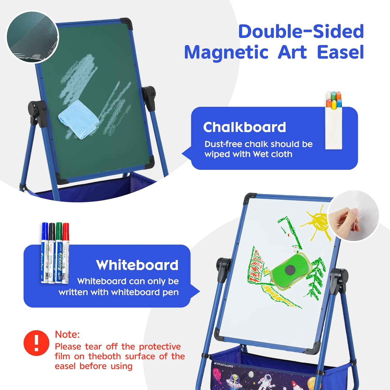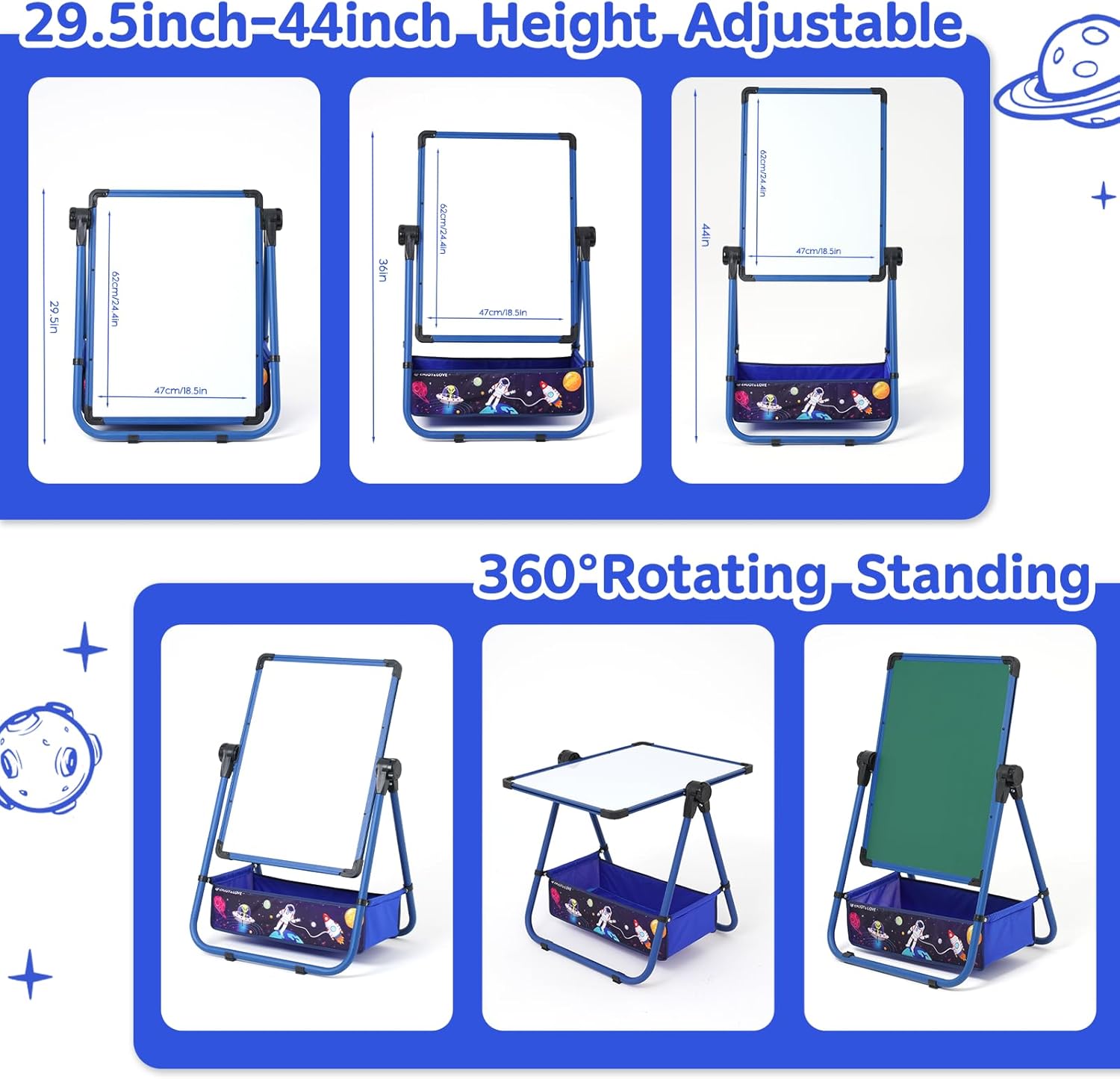 Altezza regolabile: è possibile impostare l'altezza della staffa ruotando i pulsanti su entrambi i lati del telaio. Puoi adattarlo all'altezza più adatta in base all'altezza del tuo bambino. L'area di regolazione dell'altezza è di 29,5 pollici-44 pollici, con una tavola più grande di 18,5 pollici-24,4 pollici che offre ai bambini più spazio per disegnare. Rotazione a 360°: La stagione può ruotare a 360°. I bambini possono adattare l'angolo della tavola alle loro esigenze e usarlo come tavolo da disegno. Design a doppio lato: la tavola da asciugatura e la tavola sono perfetti per lo sviluppo delle capacità motorie dei bambini e la corretta maniglia a penna. Si prega di notare: si prega di strappare la pellicola protettiva Se la superficie della piastra non è facile da pulire, può essere utilizzato un lenzuolo umido per pulirla. Il miglior regalo per i bambini: Questa stagione in piedi è un regalo eccellente per i bambini. Può aiutare a stimolare la fantasia e la creatività e permette anche ai bambini di esprimere le loro idee attraverso disegni, schizzi e crizzole. Installazione semplice: Der Kinderstaffel non richiede installazione. Dopo l'installazione del sacchetto, è possibile usarlo immediatamente. È possibile montare il sacchetto secondo le istruzioni indicate. Il design della tasca in tessuto con elementi planetari può ispirare ancora di più la fantasia e la conoscenza del disegno dei bambini.