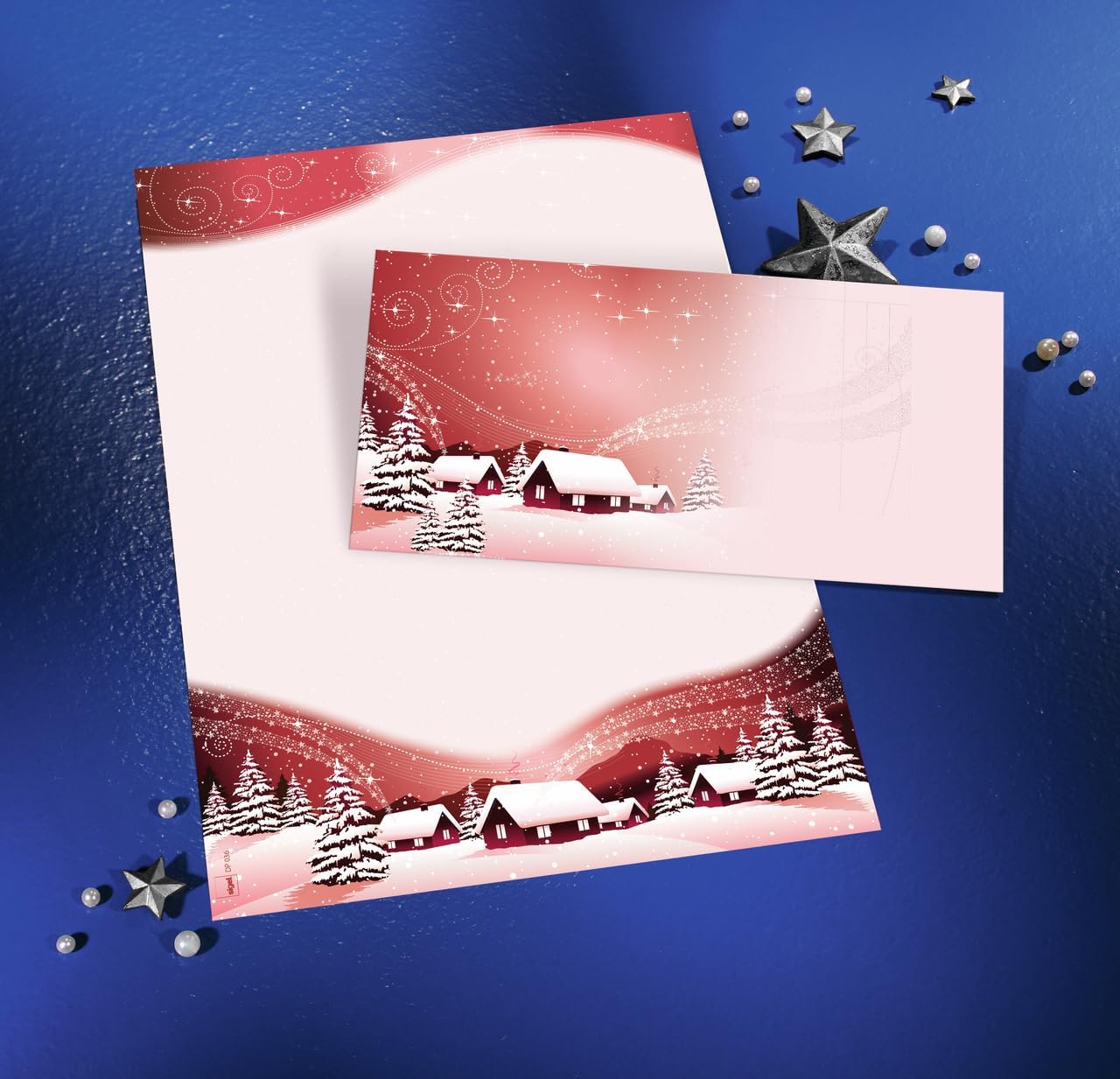 50 Buste da lettera natale con suggestico villaggio su sfondo rosso Carta a tema coordinata disponibile al Cod; art;: DP036 Qualità made in Germany: articolo studiato e stampato in Germania per tutte le stampanti inkjet e laser Formato: DL (110x220 mm), gommata