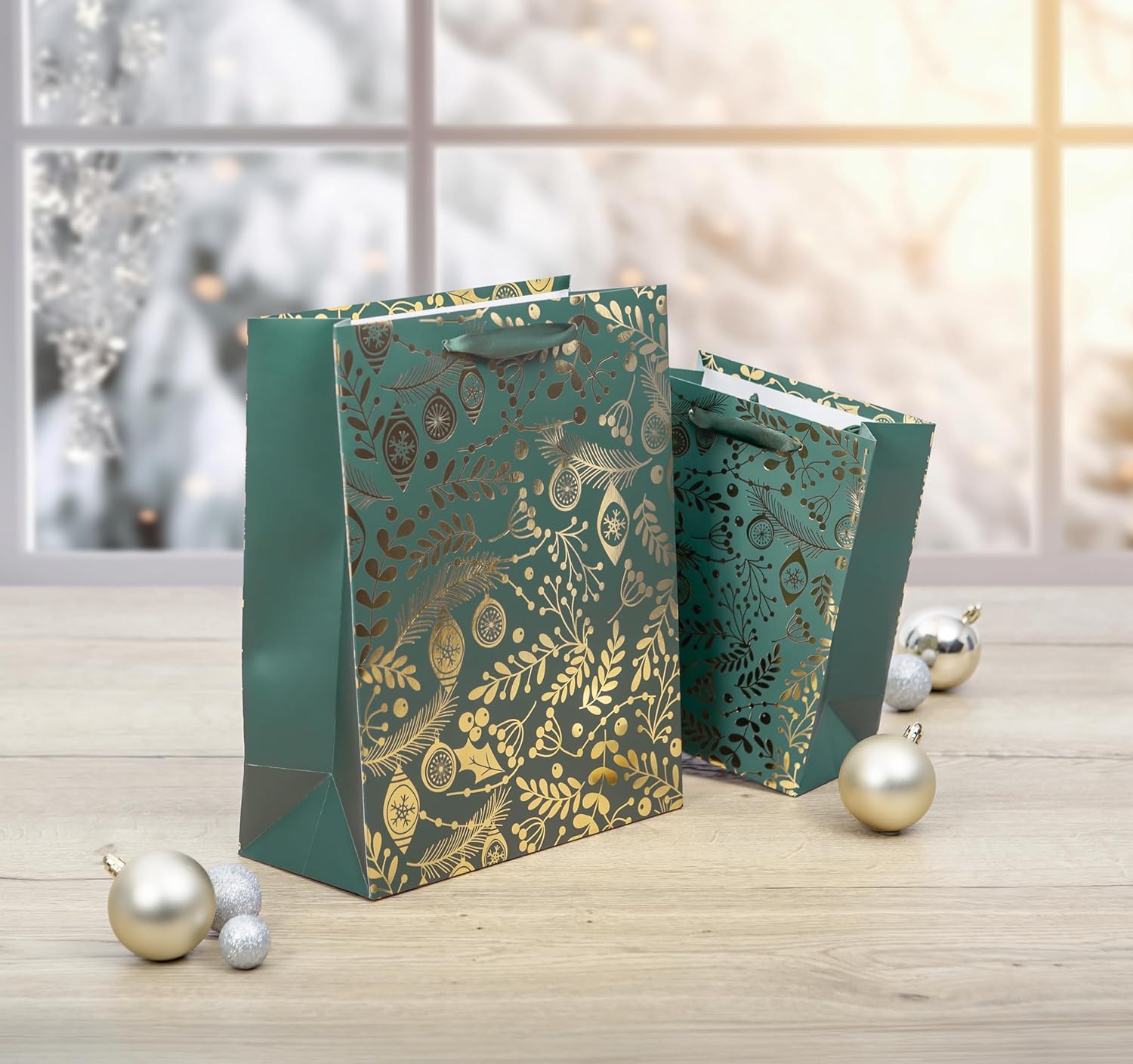 Con i pregiati sacchetti natalizi SIGEL dal design natalizio moderno ed elegante i regali di Natale vengono confezionati in modo rapido e decorativo. Sacchetti regalo medi "Ornamenti dorati su verde" in carta opaca con pellicola lucida nel formato 18 x 23 x 10 cm in verde/oro. Borsa regalo con manici in nastro di seta in tinta, inserto base in cartone per una maggiore stabilità. Sostenibile: carta certificata FSC ecologica proveniente da fonti responsabili. Fornitura: 5 pezzi