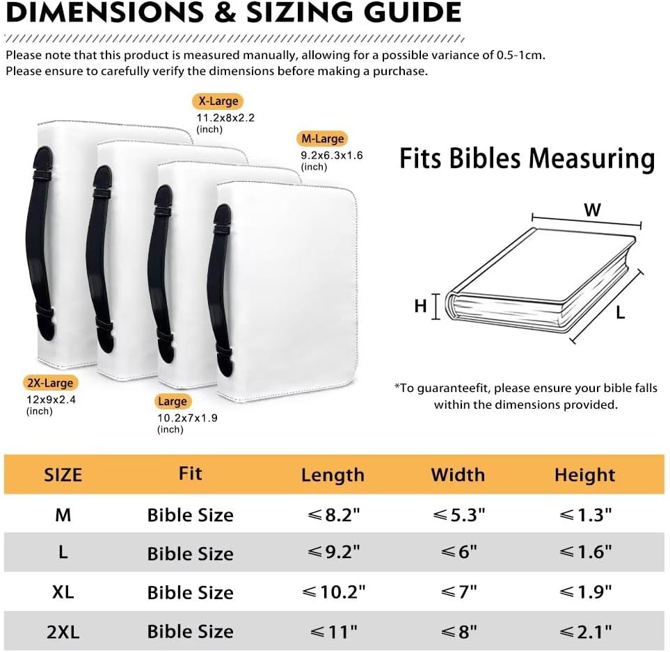 4 taglie tra cui scegliere: M (23,4 x 16 x 10,4 cm); L (10,2 x 7 x 4,6 pollici); XL (11,2 x 8 x 6 pollici); XXL (12 x 9 x 6 pollici); perfetto per qualsiasi bibbia/libro/quaderno. Design umanizzato: comodo con una maniglia robusta per un facile trasporto. 1 tasca principale, 3 scomparti, 1 porta cellulare universale e 4 portapenne. Proteggi la tua Bibbia: la copertina della Bibbia in pelle PU, la custodia resistente all'acqua protegge la tua Bibbia e gli accessori della Bibbia dall'usura quotidiana. Progettato per molteplici usi, perfetto per viaggi facili in chiesa o per lo studio della Bibbia. DUREVOLE ED ELEGANTE: Proteggi la tua Bibbia dagli incidenti della vita con questa elegante copertina per Bibbia per uomo e donna, realizzata in robusta pelle sintetica facile da pulire e resistente all'usura quotidiana. REGALO PERFETTO: la nostra copertina del libro biblico è il regalo perfetto per la famiglia e gli amici. Questa borsa per Bibbia da donna è adatta a tutte le età. Regalo per tutte le stagioni, ideale per Pasqua, Natale, compleanni, festa della mamma cristiana e altro ancora.