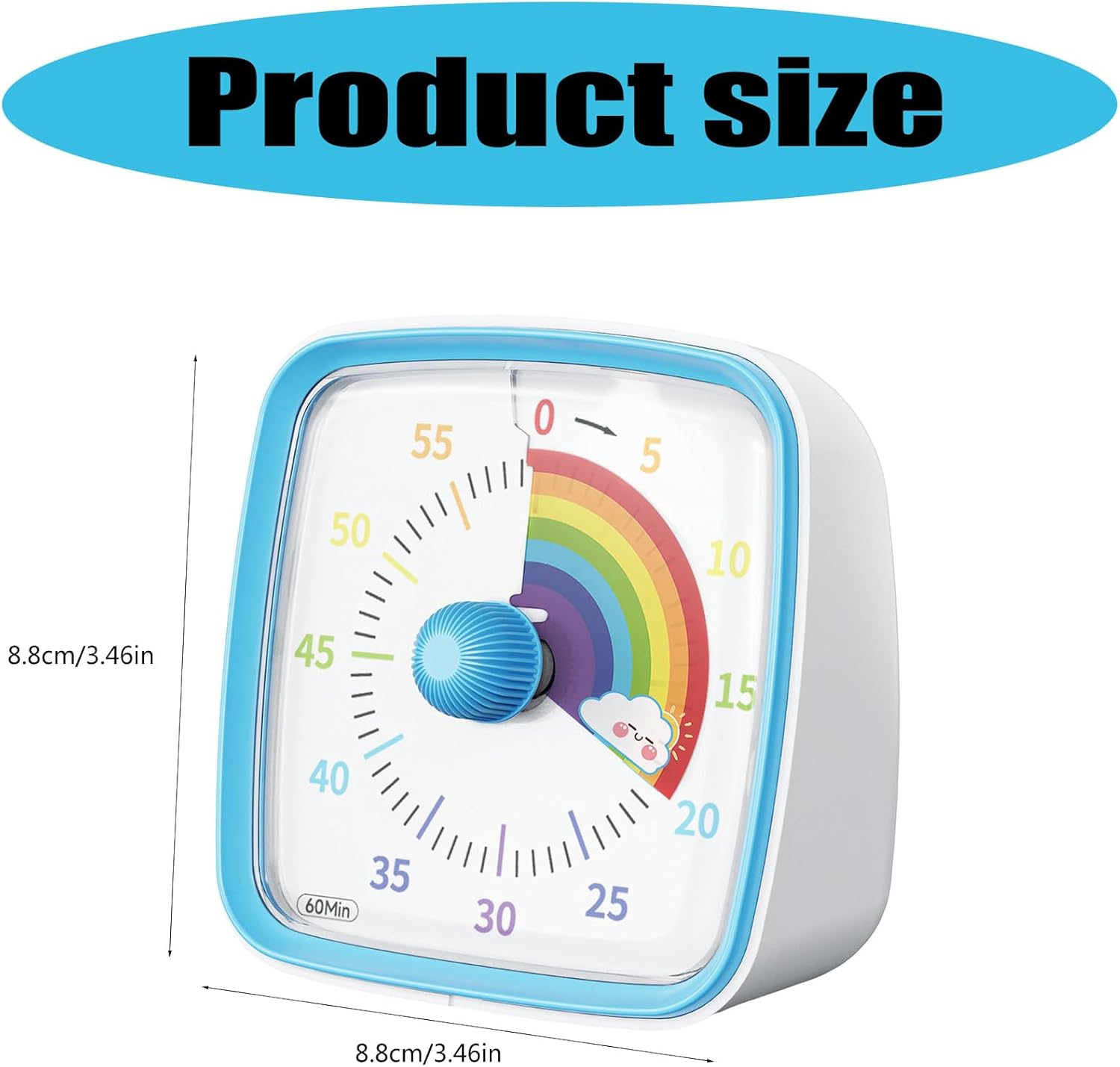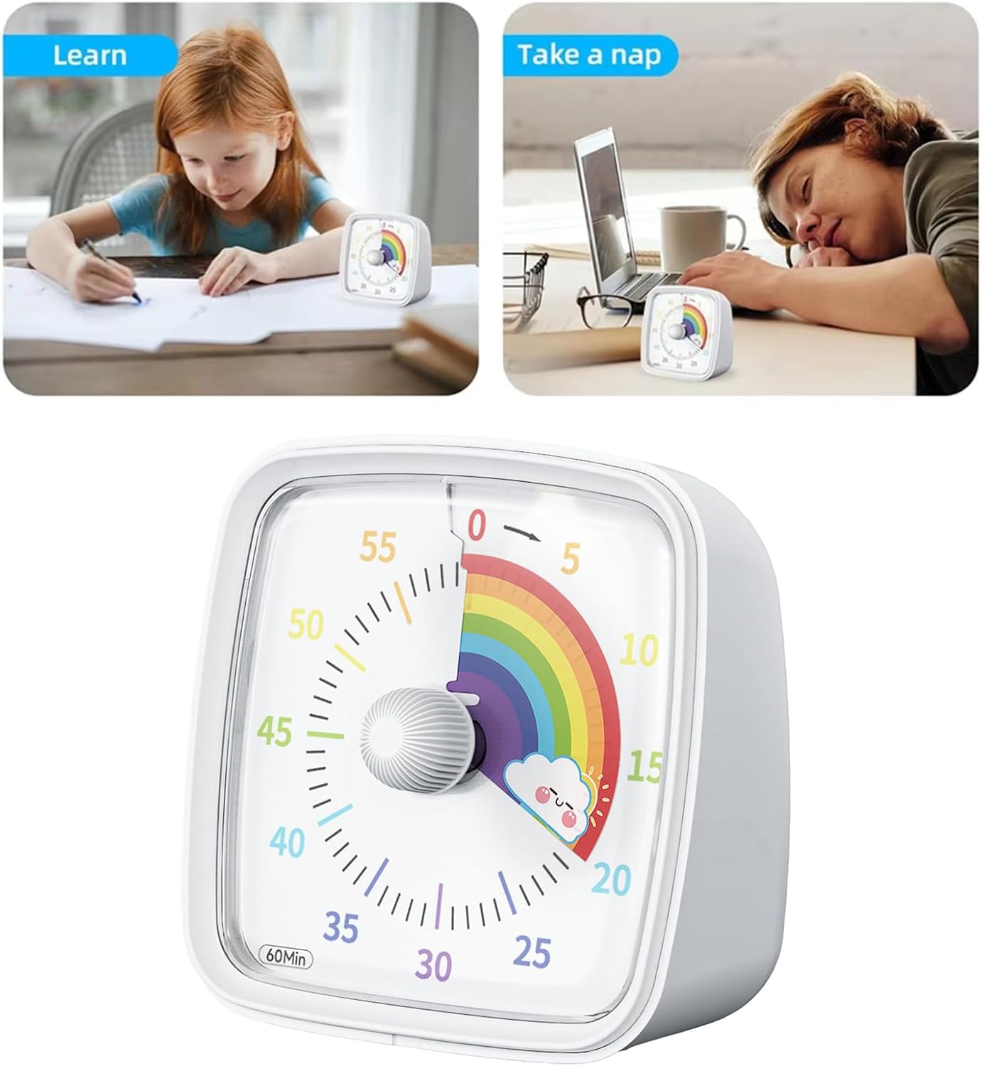 Realizzato con questo timer è facile da impostare semplicemente ruotando i quadranti in senso orario, consentendo agli utenti di cogliere intuitivamente i passaggi del tempo. Parole chiave Timer elettronici, gestione del tempo, funzionamento silenzioso design con un approccio giocoso ma funzionale, questo timer funziona silenziosamente, eliminando distrazioni, e offre tre tipi di allarme silenzioso lampeggiante, basso o forte Questo piccolo timer elettronico presenta un quadrante arcobaleno colorato che diminuisce visivamente nel tempo, rendendolo attraente ed educativo per l'apprendimento della gestione del tempo dei bambini Per varie situazioni come cucina in cucina, riunioni di studio, allenamento di allenamento, promemoria di riunione e gestione del tempo generale nella vita di ogni giorno Ideale per i bambini che imparano a gestire il loro tempo in modo efficace, così come gli adulti cercano uno strumento efficiente per le attività quotidiane