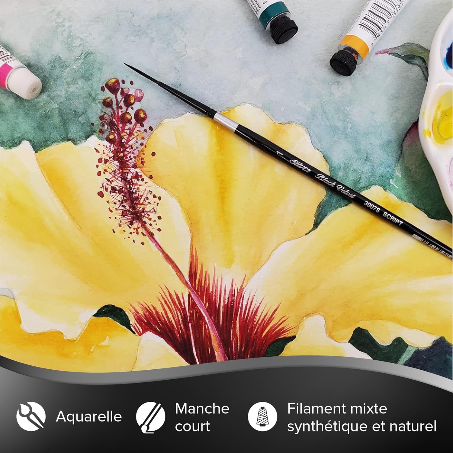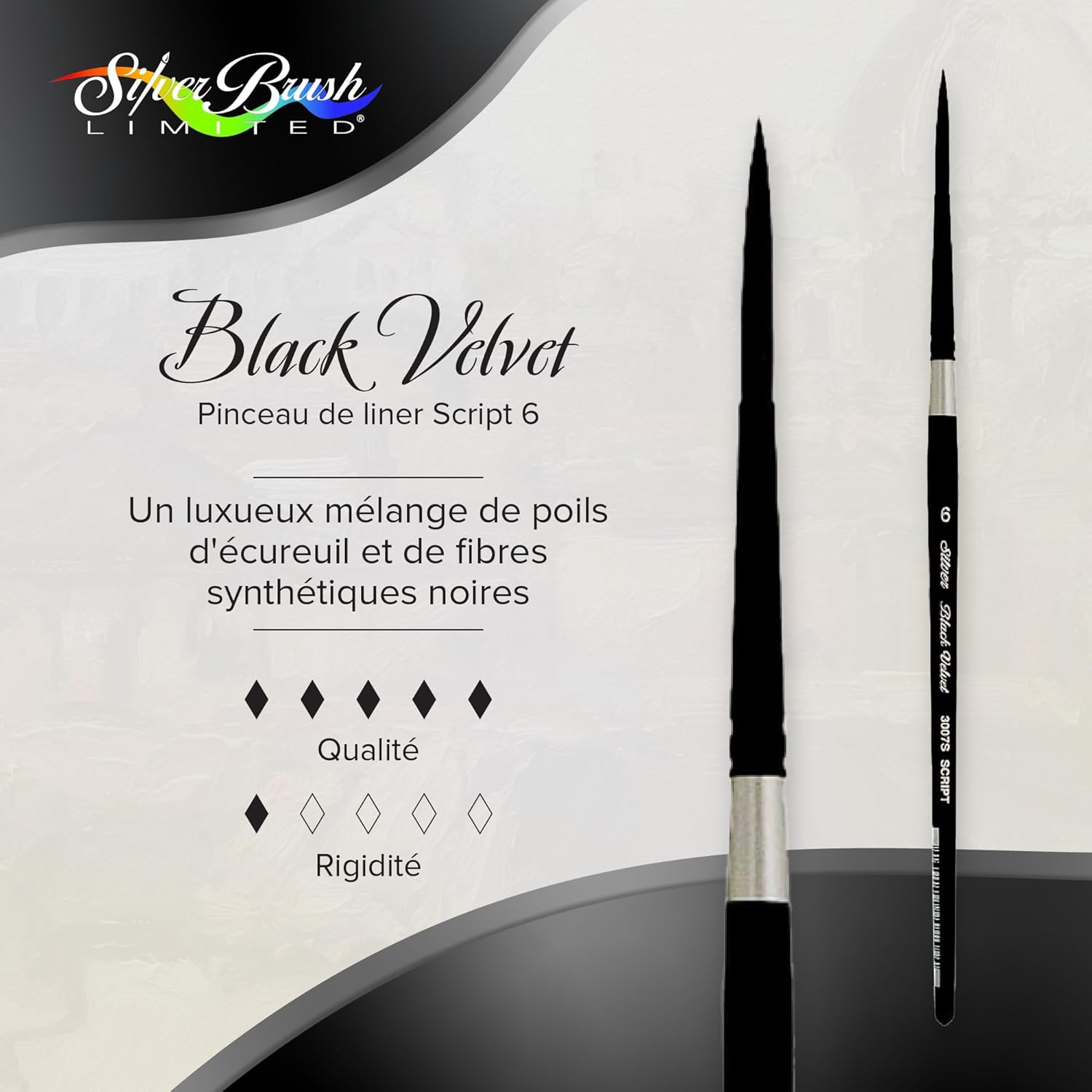 BLACK VELVET: La collezione Black Velvet è stata creata per talentuosi acquarellisti dilettanti o professionisti. Ogni pennello Black Velvet è abbastanza morbido da aggiungere colore senza alterare gli strati precedenti, ma abbastanza solido da rimuovere il colore quando necessario. MATERIALI: I nostri pennelli professionali per acquerello Black Velvet sono sapientemente realizzati con una lussuosa miscela di pelo grigio scoiattolo e fibre sintetiche nere. Ogni pennello ha un elegante manico corto laccato nero. PLOTTER: Il Black Velvet 3007S è un plotter versatile. Gli artisti scelgono questo pennello per arabeschi, firme o per disegnare lunghe linee. Il ciuffo affusolato è ideale anche per dipingere erba o capelli. Il manico corto si adatta comodamente alla mano. VERNICI: I nostri pennelli Black Velvet sono particolarmente adatti per gli acquerelli. I pennelli trattengono la giusta quantità di colore per darti il tempo di concentrarti sul tuo capolavoro. Le tue creazioni prenderanno vita delicatamente grazie ai nostri pennelli di qualità superiore. LA NOSTRA STORIA: Silver Brush Limited è uno dei maggiori fornitori di attrezzature per verniciatura di fascia alta in Francia. Abbiamo creato una straordinaria collezione di pennelli per artisti di alta qualità. Siamo convinti che non possano esistere creazioni di qualità senza pennelli di qualità.