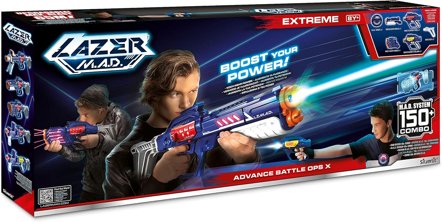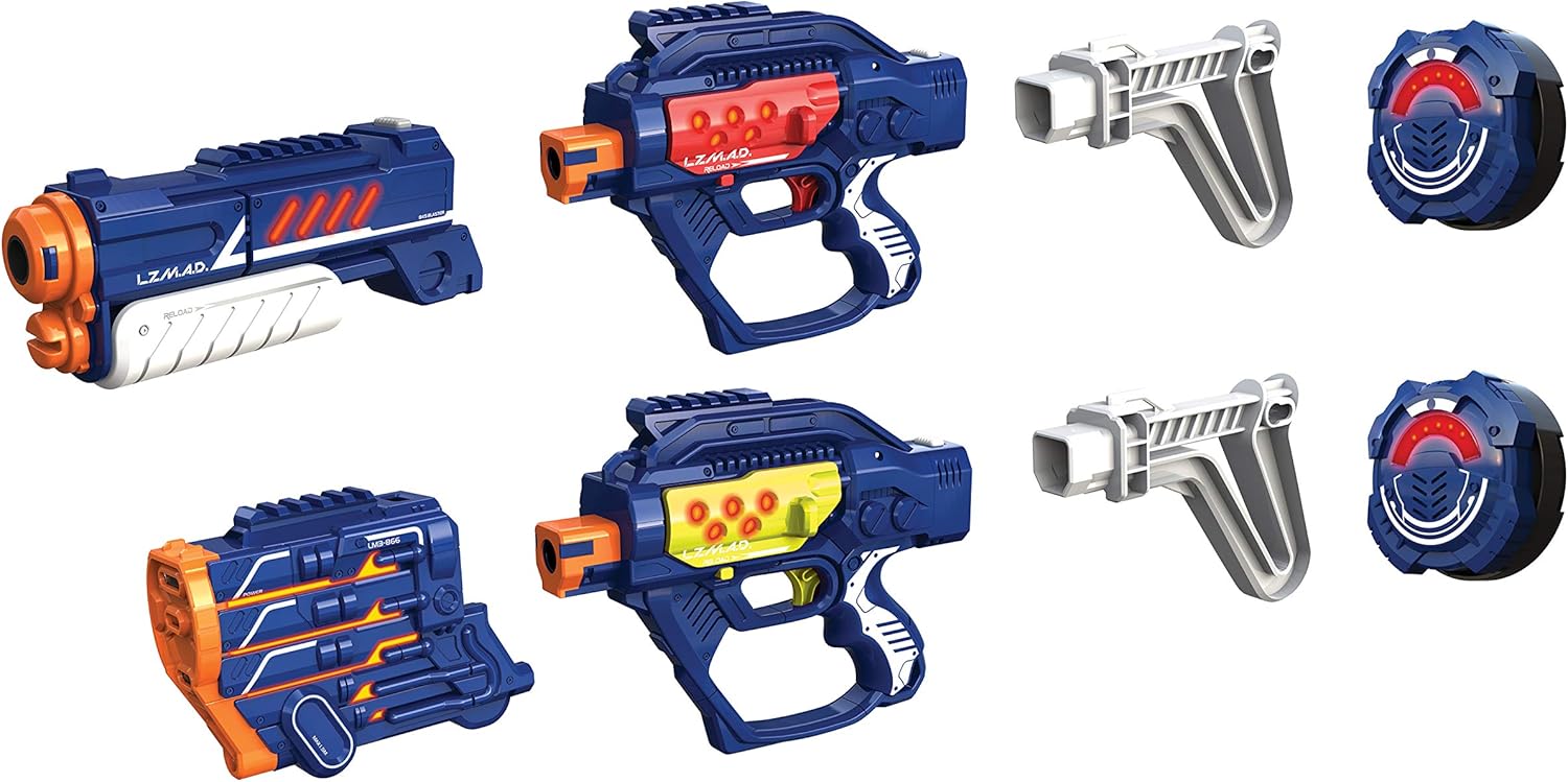 Lazer M.A.D. - Advanced Battle Ops - 2 blaster x già personalizzato: uno per ogni squadra 2 modalità di gioco: modalità battaglia o modalità allenamento. Altri accessori sono disponibili separatamente per potenziare il tuo blaster al massimo delle sue capacità. Contenuto: 2 blaster, uno dei colori di ogni squadra (rosso e giallo) + 2 bersagli + accessori per personalizzare e potenziare i blaster: 2 croci, 1 modulo a pompa e 1 modulo multitiro Batterie non incluse: 3 x AAA (per blaster) + 3 x AAA (per bersaglio) Dai 8 anni.
