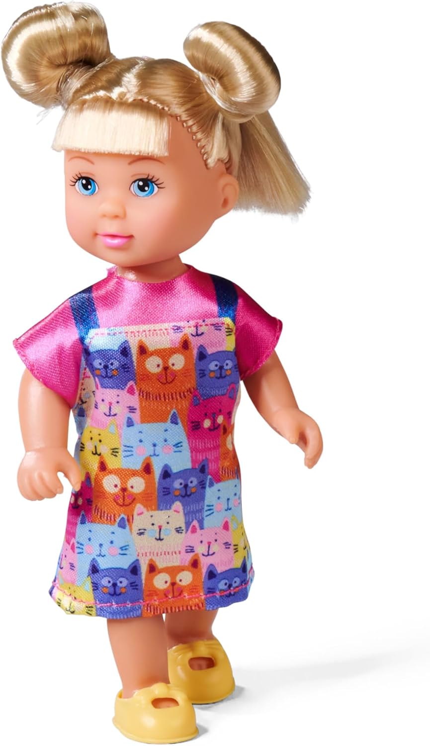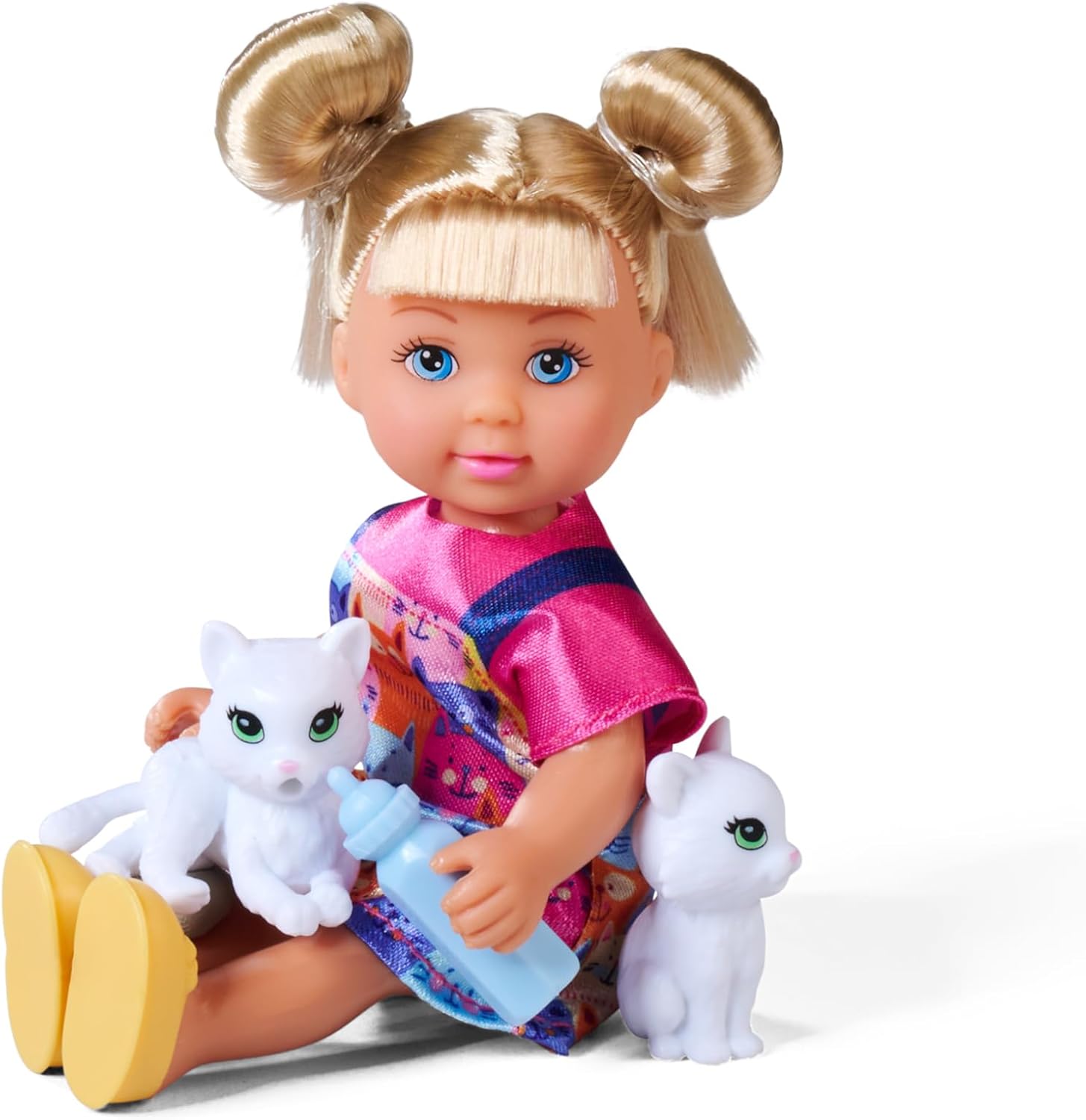 Look da gattina alla moda – Evi indossa un grazioso abito con fantasia gatto e ha una pettinatura double-bun super trendy. Divertimento creativo – Tanti modi per acconciare e vestire la bambola, seguendo le ultime tendenze. Accessori con gattini – Con tiragraffi dotato di elemento rotante e due gattini bianchi per tante avventure di gioco. Regalo perfetto dai 3 anni – Bambola alta 12 cm, sicura e adatta a stimolare l’immaginazione dei più piccoli.