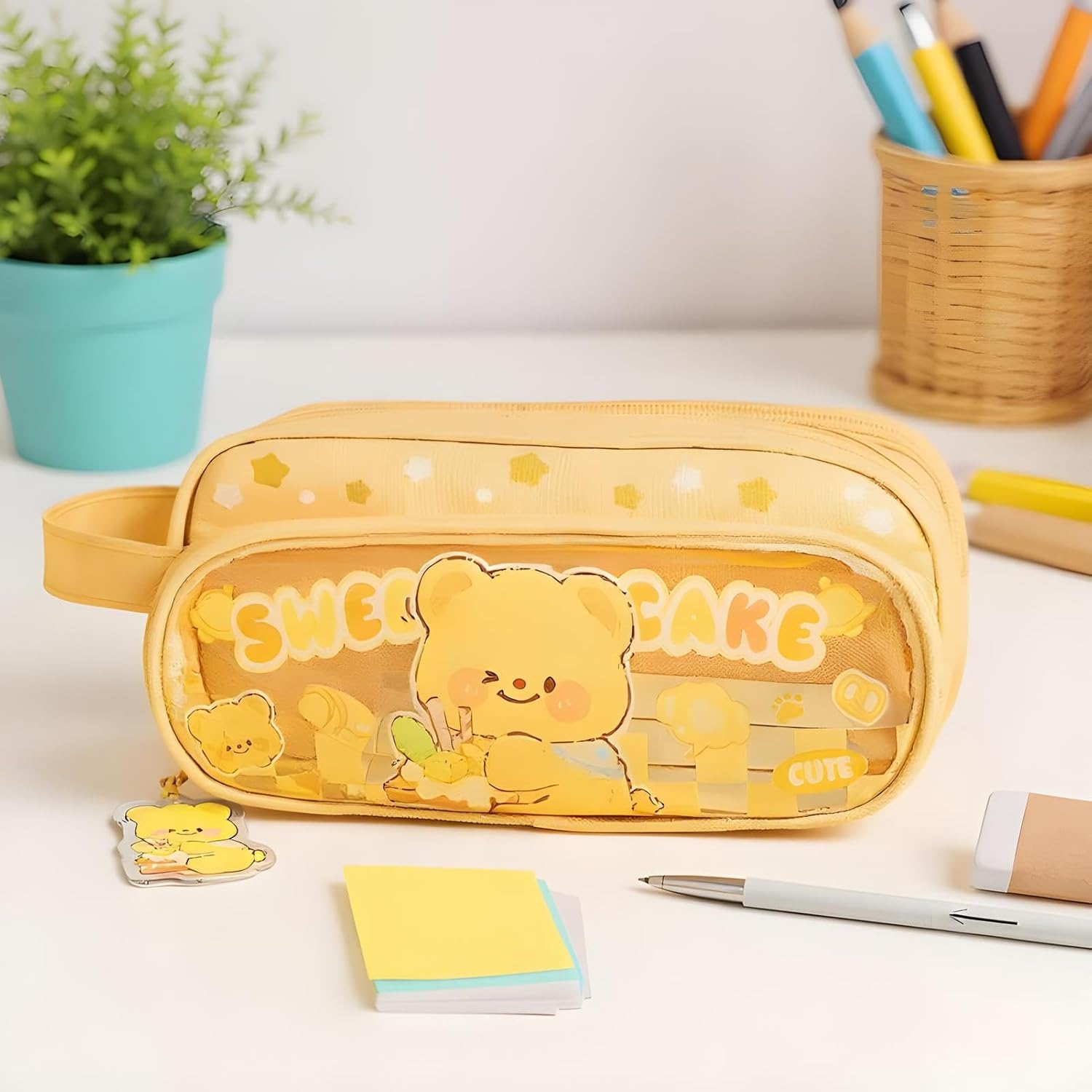 Abbastanza grande: può contenere fino a 100 penne e mantiene la cancelleria ordinata con il suo design organizzato a 3 livelli, migliorando l'efficienza di apprendimento mentre si montano righelli e piccoli oggetti senza sforzo Compagno di studio coinvolgente: colori morbidi e caldi e simpatiche stampe di orso capibara illuminano le routine di studio, incoraggiando l'uso quotidiano con uno stile divertente e cartone animato attraente per i bambini, migliorando naturalmente la loro esperienza di apprendimento Innovazione ad accesso rapido: progettato con un pannello frontale trasparente, questo astuccio offre visibilità istantanea del contenuto, mescolando un'estetica contemporanea con un'organizzazione efficiente per ridurre al minimo lo sforzo e migliorare la convenienza Comodo da trasportare: combina una presa morbida e facile da usare e una maniglia portatile per il trasporto, questo astuccio garantisce il massimo comfort e adattabilità per scopi scolastici e di viaggio senza compromettere la funzionalità Durano a lungo: combinando proprietà sicure per i bambini con un robusto materiale resistente all'usura, questo astuccio offre una resistenza affidabile ai danni quotidiani pur rimanendo inodore per una lunga usabilità