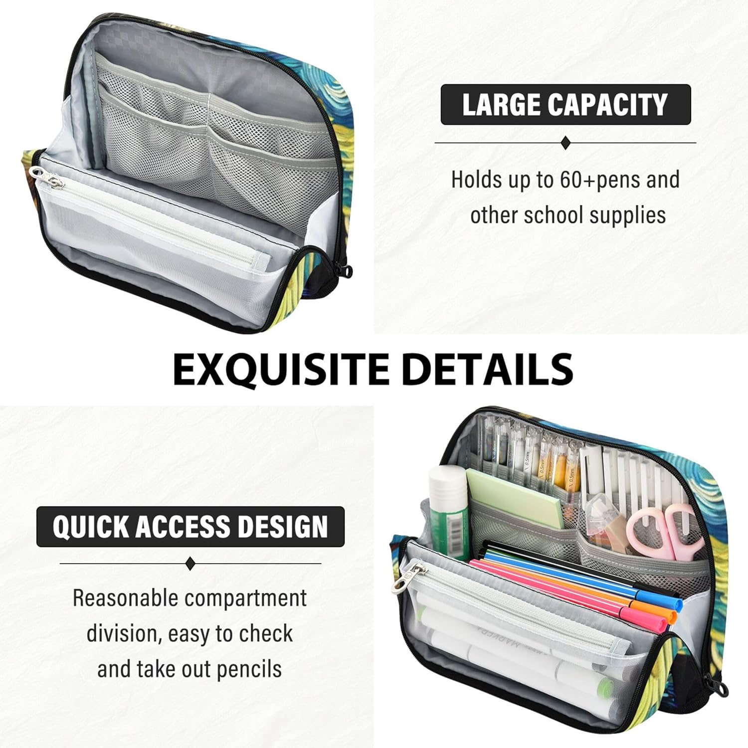 Struttura magnetica per una maggiore stabilità: grazie al suo design pieghevole unico con bottoni a pressione sicuri, l'astuccio per ragazze si trova in alto sulla scrivania e mantiene tutto ben visibile e accessibile Tessuto protettivo e pratico: realizzato in nylon resistente, l'astuccio è progettato per resistere ai danni, rendendolo ideale per viaggi, scuola o spostamenti quotidiani Grande capienza: dispone di uno scomparto principale, una tasca in rete con cerniera e una tasca aperta per organizzare penne, matite, gomme, temperamatite e foglietti adesivi Adatto per varie impostazioni: utilizza astucci riutilizzabili per riporre oggetti artistici, oggetti personali o strumenti da ufficio, ideali per studenti, pendolari, artisti o chiunque sia in viaggio Opzione regalo personalizzata: disponibile in stampe vivaci con testo personalizzabile o design fotografico, l'astuccio per la scuola è un regalo unico per bambini, artisti o viaggiatori