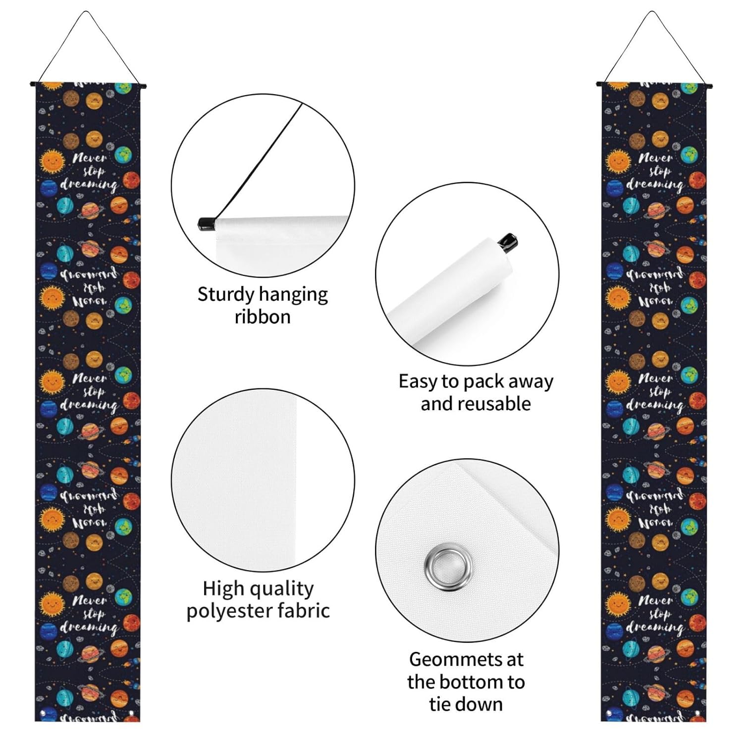 Caratteristiche per un utilizzo conveniente: i nostri striscioni di laurea sono dotati di un palo e di una corda per appenderli, che li rendono facili da installare e pronti per essere appesi ovunque tu voglia. Materiale: realizzati in tessuto di poliestere di alta qualità, questi adorabili striscioni planetari sono robusti, durevoli, lavabili e riutilizzabili, garantendo che durino per molte celebrazioni. DIMENSIONI PER VISIBILITÀ: Con 11,8 pollici di larghezza e 67 pollici di altezza, offrono un'ottima visibilità e fanno una dichiarazione alla tua festa di laurea. Regalo per i laureati: questi striscioni sono un meraviglioso regalo di laurea, aggiungendo un tocco di festa a qualsiasi ambiente, sia all'interno che all'esterno. Occasioni di versatilità: adatti a tutti i tipi di feste di laurea, riunioni e celebrazioni, questi striscioni sono versatili e possono essere utilizzati per qualsiasi cerimonia o evento.