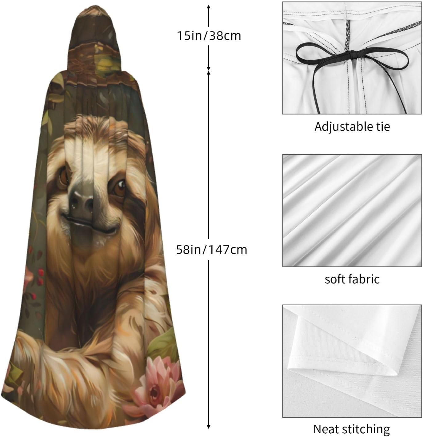 Il design senza cerniera, abbinato a un grande mantello con cappuccio e cravatta al collo, migliora il tuo mistero mantenendoti comodo con il suo tessuto non prurito. Con una lunghezza di 147 cm, larghezza di 154 cm e un'altezza del cappuccio di 38 cm, il nostro simpatico mantello con cappuccio con stampa bradipo offre una copertura completa, assicurandoti di distinguerti in ogni occasione. Vari eventi come Halloween, cosplay, costumi da palcoscenico, feste a tema, balli, convegni di fumetti e molto altro ancora, il nostro mantello è versatile e conveniente. Facile da mantenere e di lunga durata, il nostro simpatico mantello con cappuccio con stampa bradipo è lavabile in lavatrice e lavabile a mano. Con un design neutro, il nostro mantello è perfetto per uomini e donne.