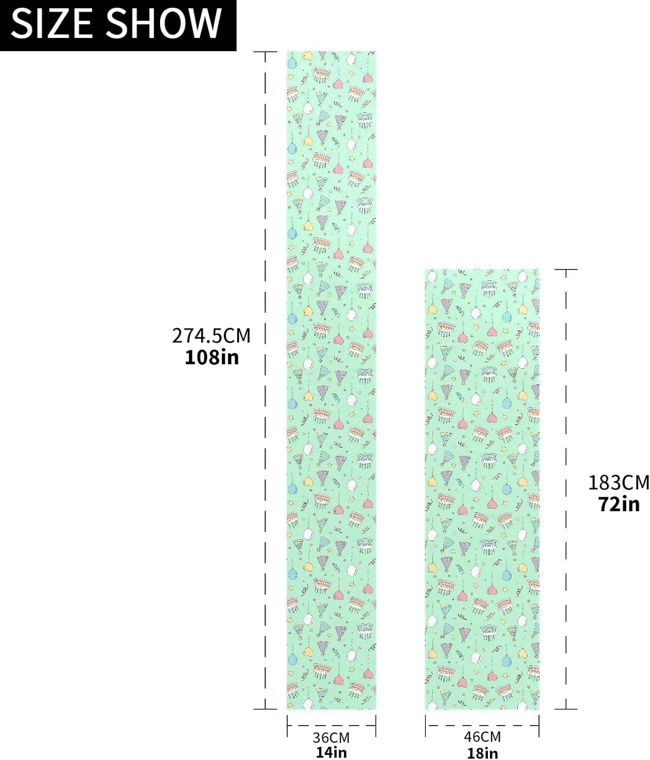 Adatto per tavoli di dimensioni 46 x 183 cm. Adatto per un tavolo che può ospitare 4-6 persone. 33 x 228 cm. Adatto per un tavolo che può ospitare 4-6 persone. 36 x 275 cm. Adatto per tavoli da 8 a 10 persone. Decorazione della tavola della festa della casa Colori vivaci e stampa con motivo unico ti offrono un'idea creativa e unica per decorare la casa. Ideale per cucina, sala da pranzo, uso quotidiano, decorazione per feste a tema. Festività ed eventi speciali. Ideale per molti eventi stagionali: il nostro runner da tavola rende i tuoi momenti speciali ancora più memorabili. Perfetto per interni ed esterni. Natale, Ringraziamento, Halloween o altre feste festive. Cena in famiglia. Decora con stile la tua cucina o il tuo tavolo da pranzo. Comò. Tavolino da caffè o consolle mentre mostra ancora la superficie dei mobili. Imposta piante o altri centrotavola su questo runner da tavola. Rende la tua vita con stile.
