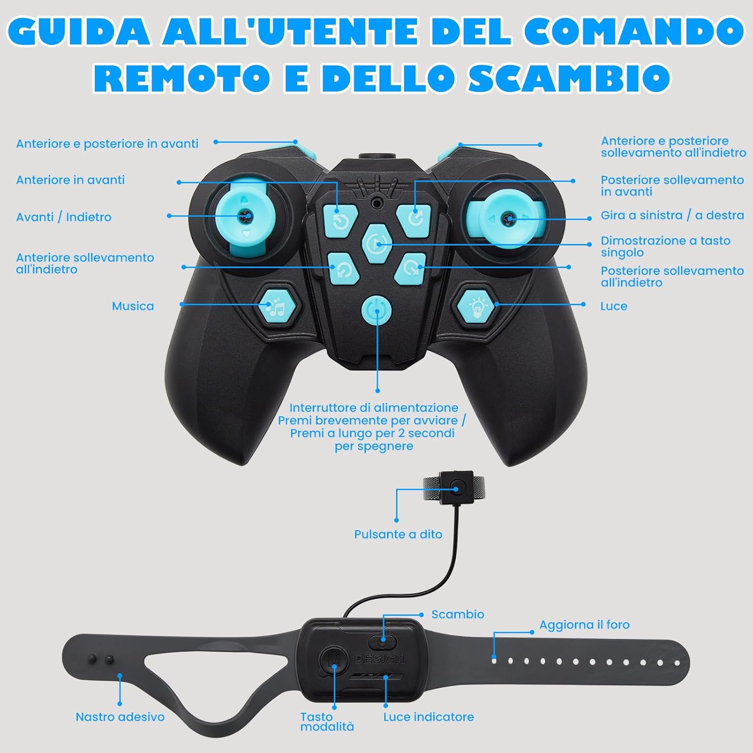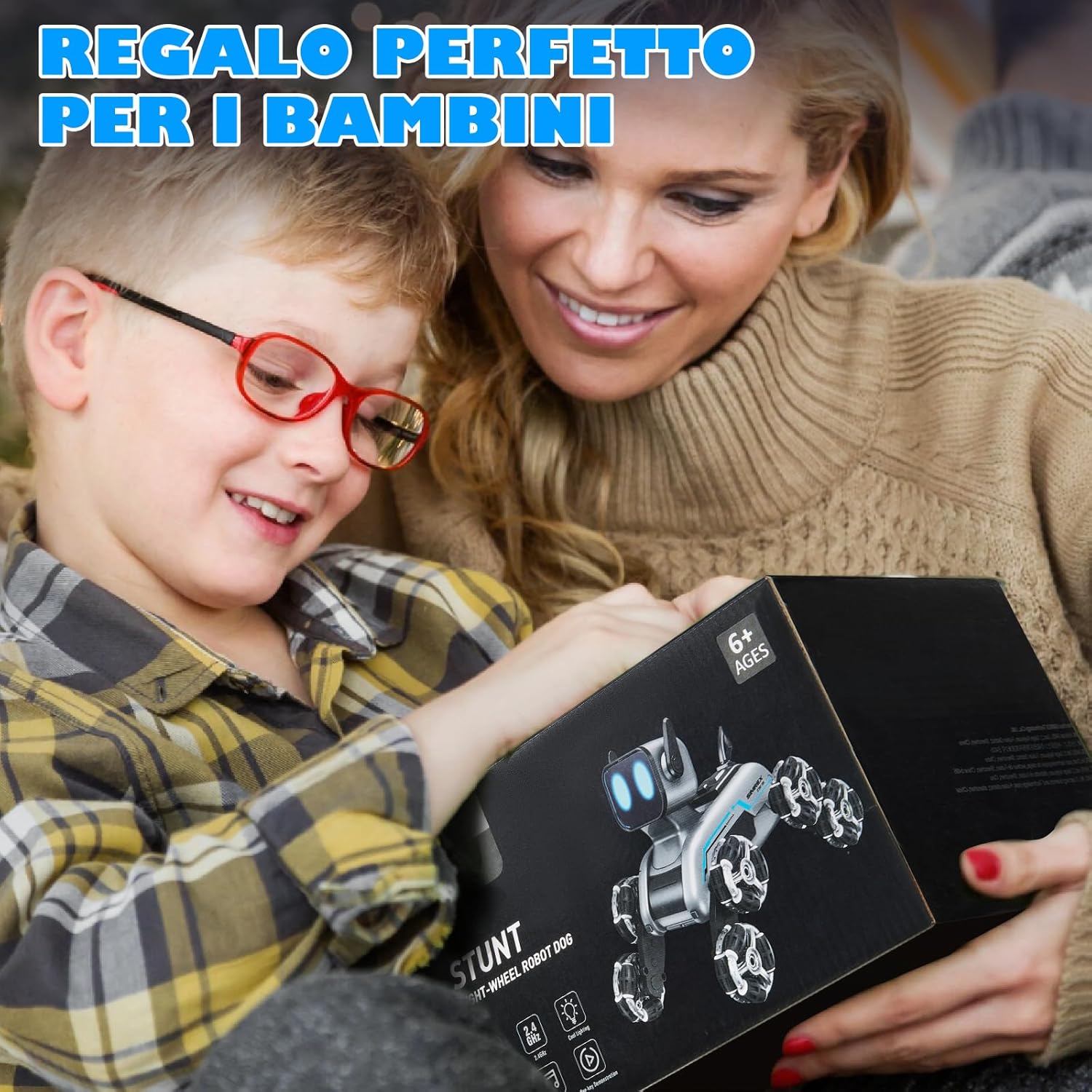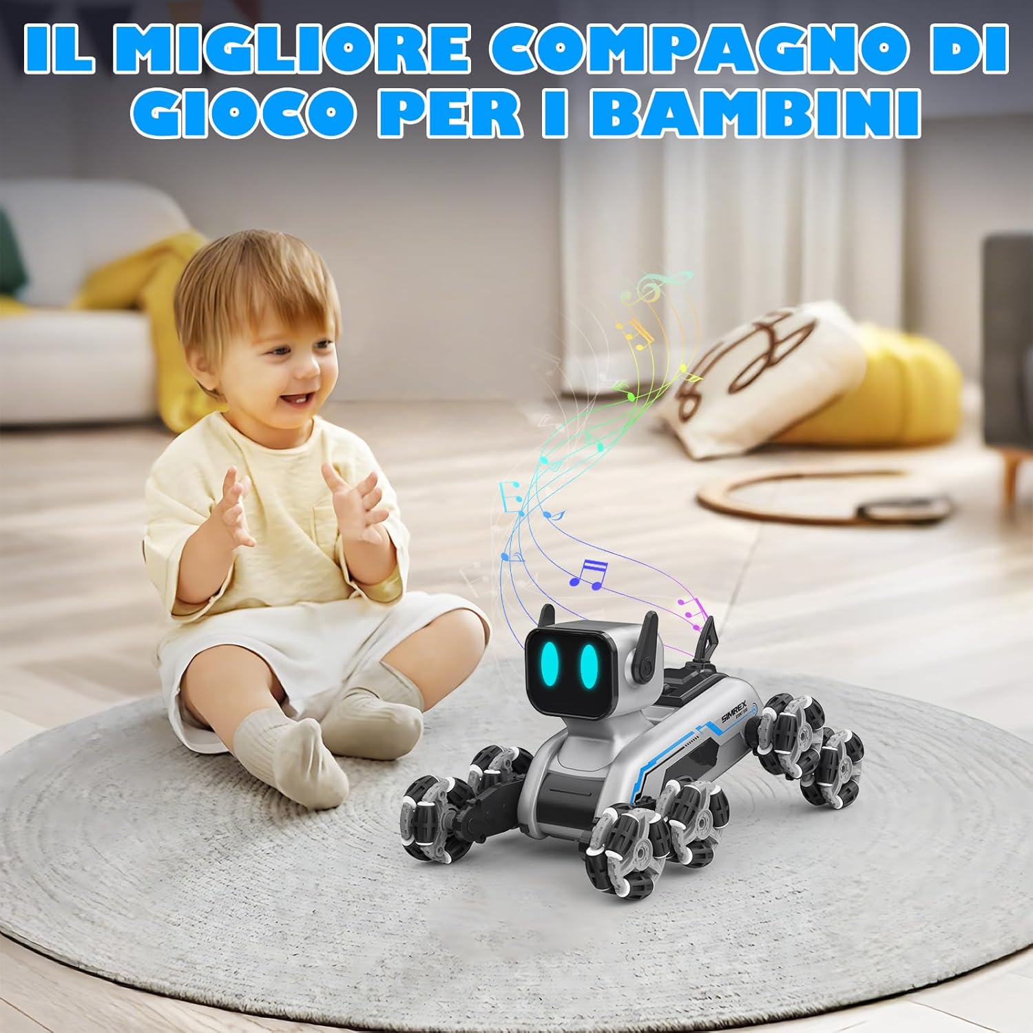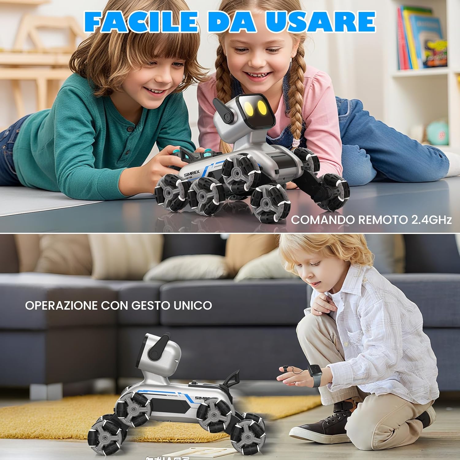 2 modalità di gioco. Controlla il tuo cane robot tramite telecomando o gesti della mano con l'orologio intelligente – non c'è bisogno di un pulsante per un divertimento di gioco interattivo Luci, musica, azione. Scopri come il tuo cane robot prende vita con luci LED colorate, musica vivace e movimenti naturali - Con i suoi membri mobili, può correre, ballare e persino prendere pose fantastiche ✓ 10 fantastici trucchi con un semplice tocco di un pulsante. Basta premere e guardare il vostro cane robot correre, girare a 360°, camminare sulla luna o iniziare una festa danzante, perfetto per principianti e professionisti ✓ Maestro di tutti i terreni! Con 8 ruote robuste e potenti bracci oscillanti, questo robot cane gestisce erba, rocce, scale e persino sabbia come un campione, dentro e fuori 2 batterie = due volte più divertimento di gioco. Include due batterie ricaricabili (20 minuti ciascuna) per un'azione non stop. Il regalo perfetto per Natale o compleanni, favorisce la creatività, la coordinazione e garantisce ore di divertimento di gioco