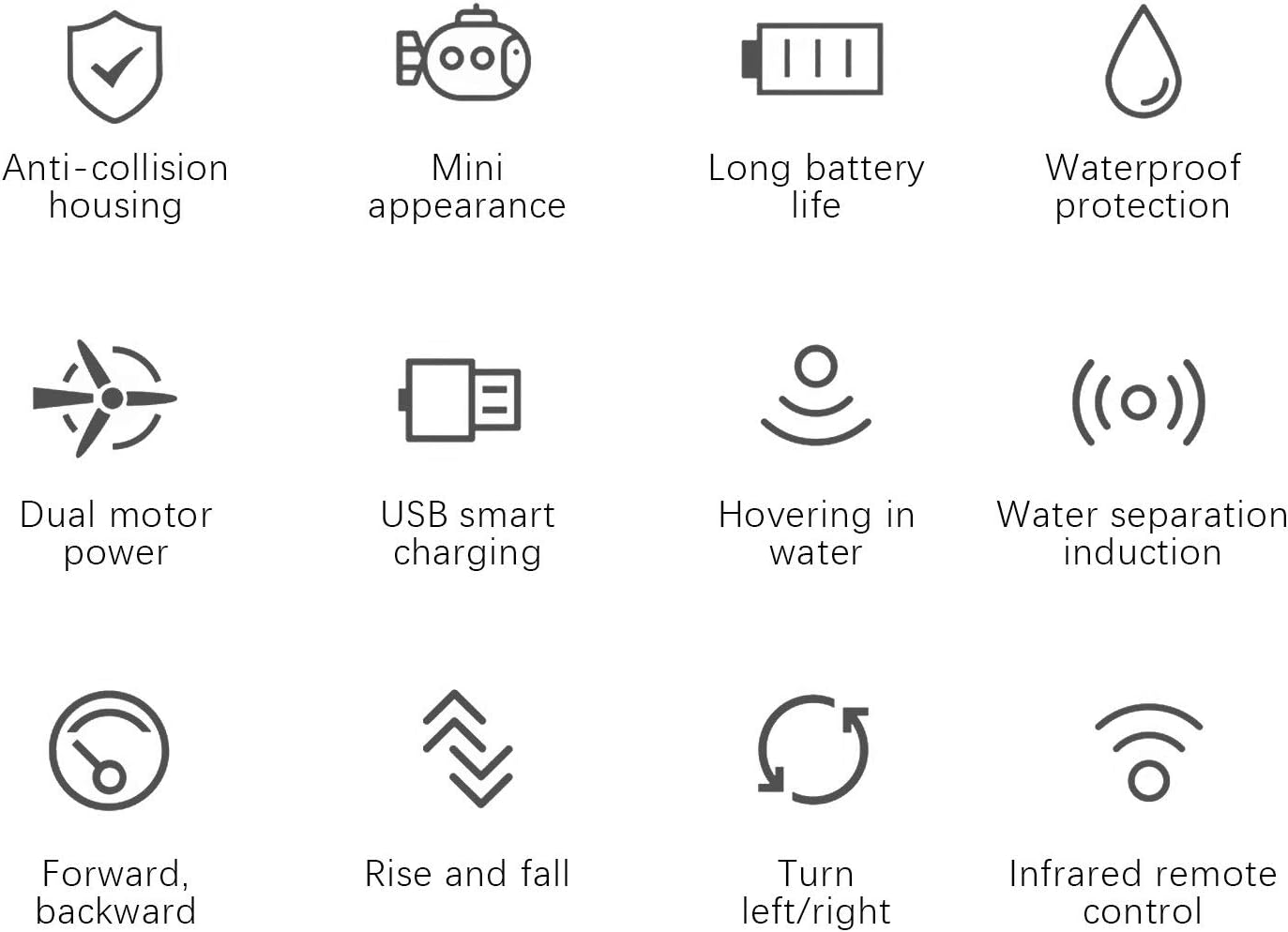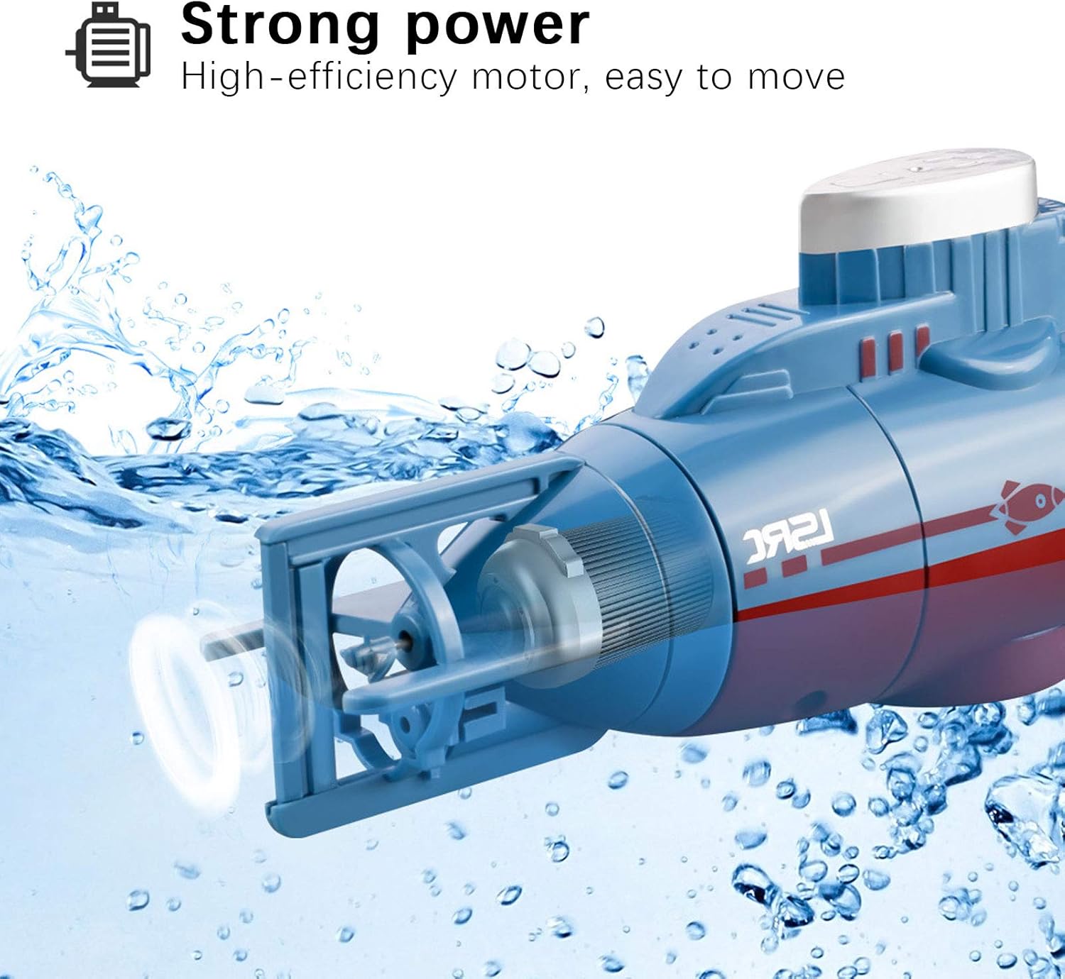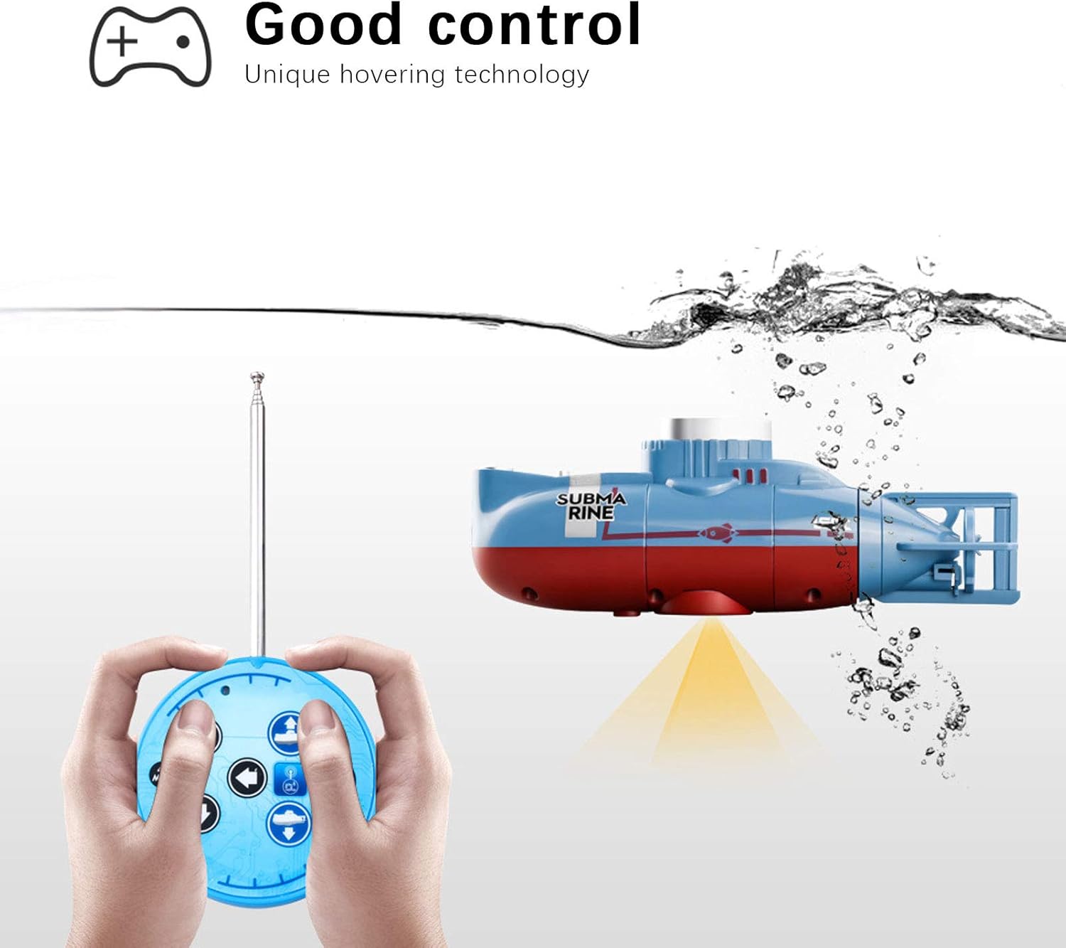 Il sistema di immersione statica consente al sottomarino di galleggiare e immergersi fino a una profondità di 0,5 metri. Il sistema di elica a trasmissione singola può far muovere il sottomarino in avanti, indietro, a sinistra e a destra. Il sistema micro timone consente al sottomarino di ruotare di 360 gradi in senso orario o antiorario. Supporta il controllo a 6 canali, destra/sinistra, su/giù, avanti/indietro, facile da controllare. Sottomarino telecomandato, alto grado di simulazione, può esercitare l'intelligenza e la coordinazione fisica dei bambini.