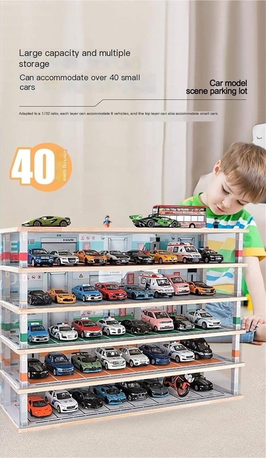 Giocattolo simulato del garage del parcheggio: questo giocattolo è una scena simulata del garage del parcheggio. Fornisce un armadio di stoccaggio multistrato assemblato, che ripristina realisticamente la scena del parcheggio. Può essere utilizzato for visualizzare e archiviare vari modelli di auto in scala 1:32. Modelli assemblati: i giocattoli devono essere assemblati, il che aumenta l'abilità pratica e la pazienza dei bambini e può anche portare più divertimento e senso di realizzazione. Materiale e luogo di origine: i giocattoli sono realizzati principalmente in legno e acrilico e il luogo di origine è la Cina continentale. Metodo di imballaggio: il giocattolo è imballato in una scatola, comoda for proteggere il giocattolo durante la consegna e lo stoccaggio. Sono disponibili diversi colori: puoi scegliere il colore in base alle tue preferenze, ad esempio 1:32 5° piano 25 posti auto senza luci, 1:32 5° piano 25 posti auto con luci, 1:32 5° piano 40 posti auto senza luci, 1:32 5° piano 40 posti auto con luci, ecc.