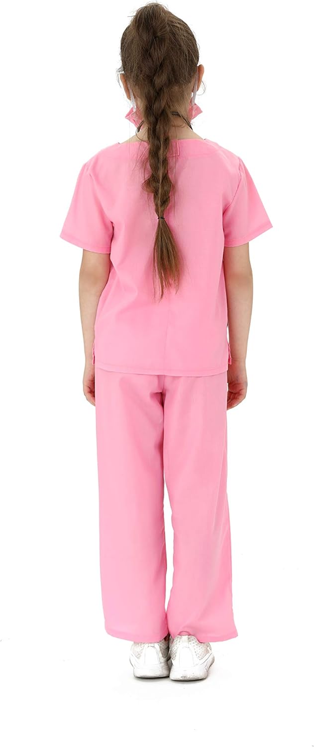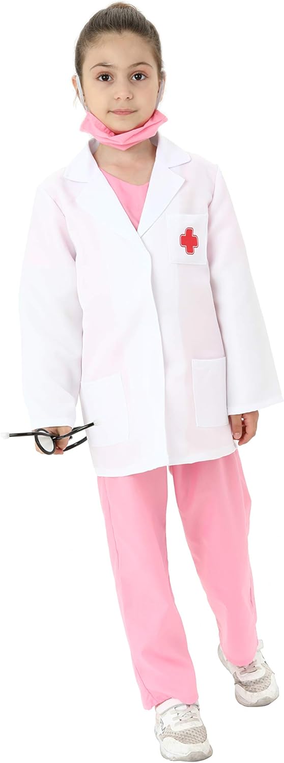 ROSA DOCTOR SCRUBS: 40% Cotone, 60% Poliestere Costume da Gioco di Ruolo per Medici, tra cui Top, Pantaloni, Giacca, Maschera Viso e Stetoscopio. SEMPLICE COSTRUZIONE: Velcro sul retro della giacca per una vestibilità facile, il lato della giacca con una freccia per mostrare il vivace rotolo. ALTA QUALITÀ: Il set di giochi di ruolo resistente e leggero per medici morbidi è realizzato in 40% cotone, materiale TC, non pruriginoso, non shabby, confortevole e traspirante. EDUCAZIONE: Dress-up play è un'attività molto creativa, fantasiosa e responsabile. I bambini sono desiderosi di svolgere tutti i tipi di ruoli per dimostrare la loro indipendenza. Nel frattempo, è una buona opportunità per i genitori di scoprire l'interesse e lo sviluppo della personalità di tuo figlio. MULTIPLE OPPORTUNITÀ: I costumi medici sono ampiamente usati, come giochi di ruolo giornalieri, giochi scolastici, spettacoli teatrali, feste in costume di Halloween, regali di Natale, regali di compleanno e molto altro ancora.