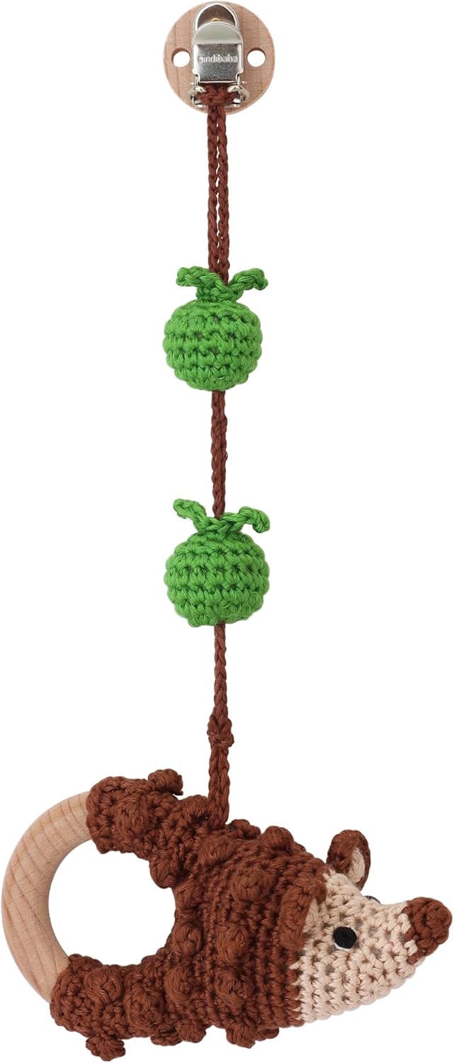 Con sonaglio: ottimo per promuovere la percezione acustica Fissaggio intelligente: la clip in legno in dotazione può essere sostituita con altri elementi di fissaggio. → Multifunzione: utilizzabile come rimorchio ad arco da gioco, massaggiagengive e rimorchio per passeggino. Solo punti di contatto morbidi: senza bordi, occhi cuciti o plastica Ottima sensazione al tatto: piacevole al tatto grazie alla superficie a coste all'uncinetto. Ottimo per lo sviluppo del senso del tocco! Clip di sicurezza con presa extra che non va persa. Parte anteriore con clip e anello in legno di faggio non trattato: utile per la dentizione del bambino.